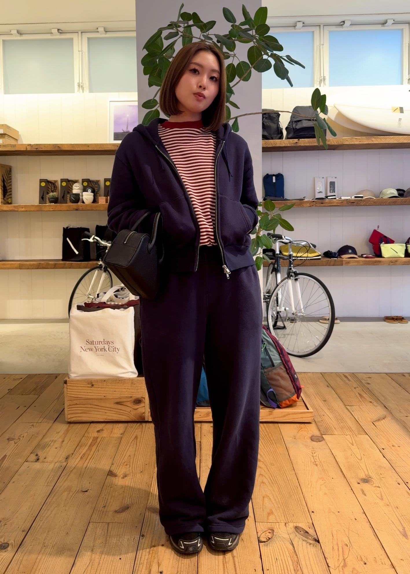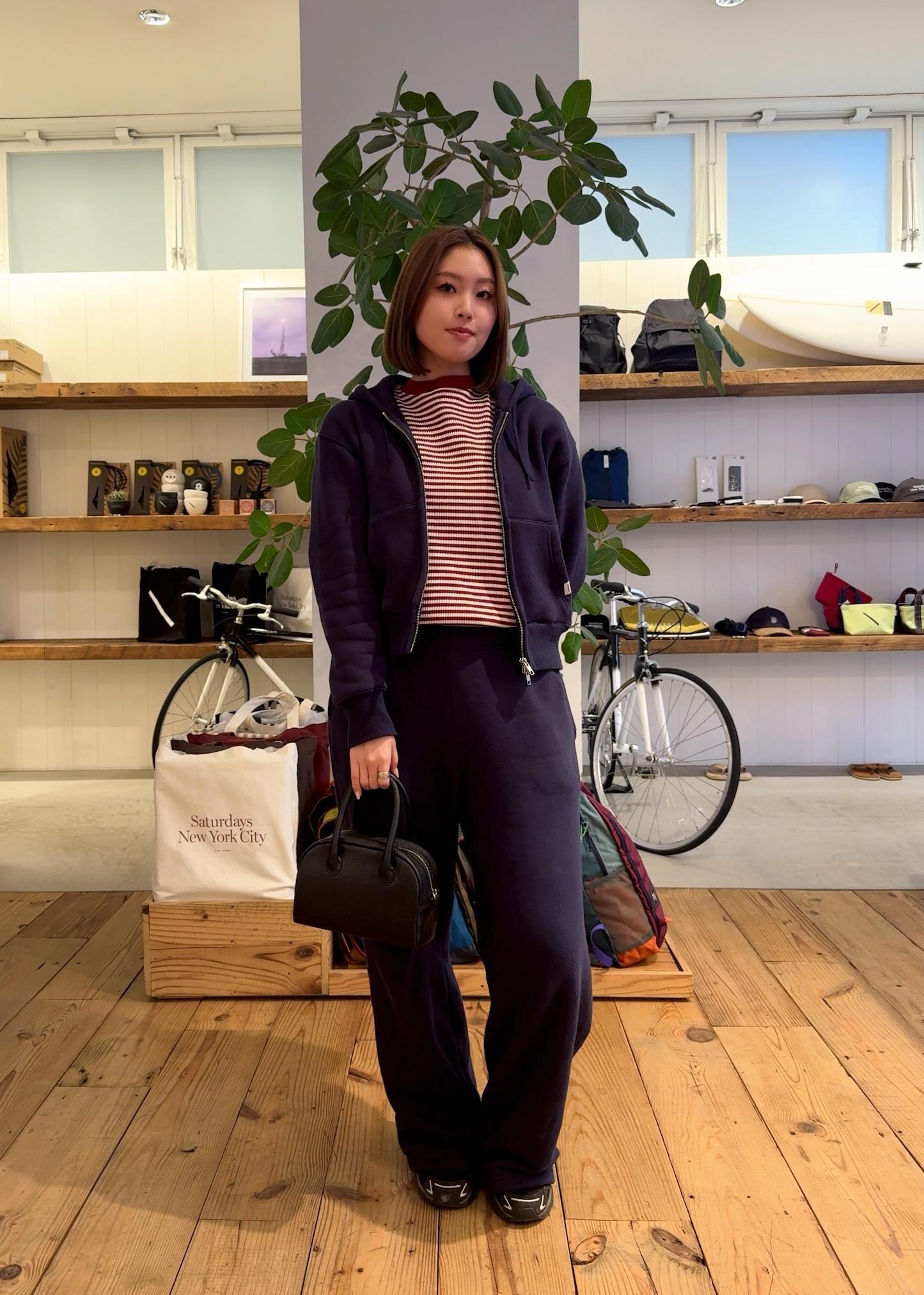 ネイビーのスウェットセットアップに、