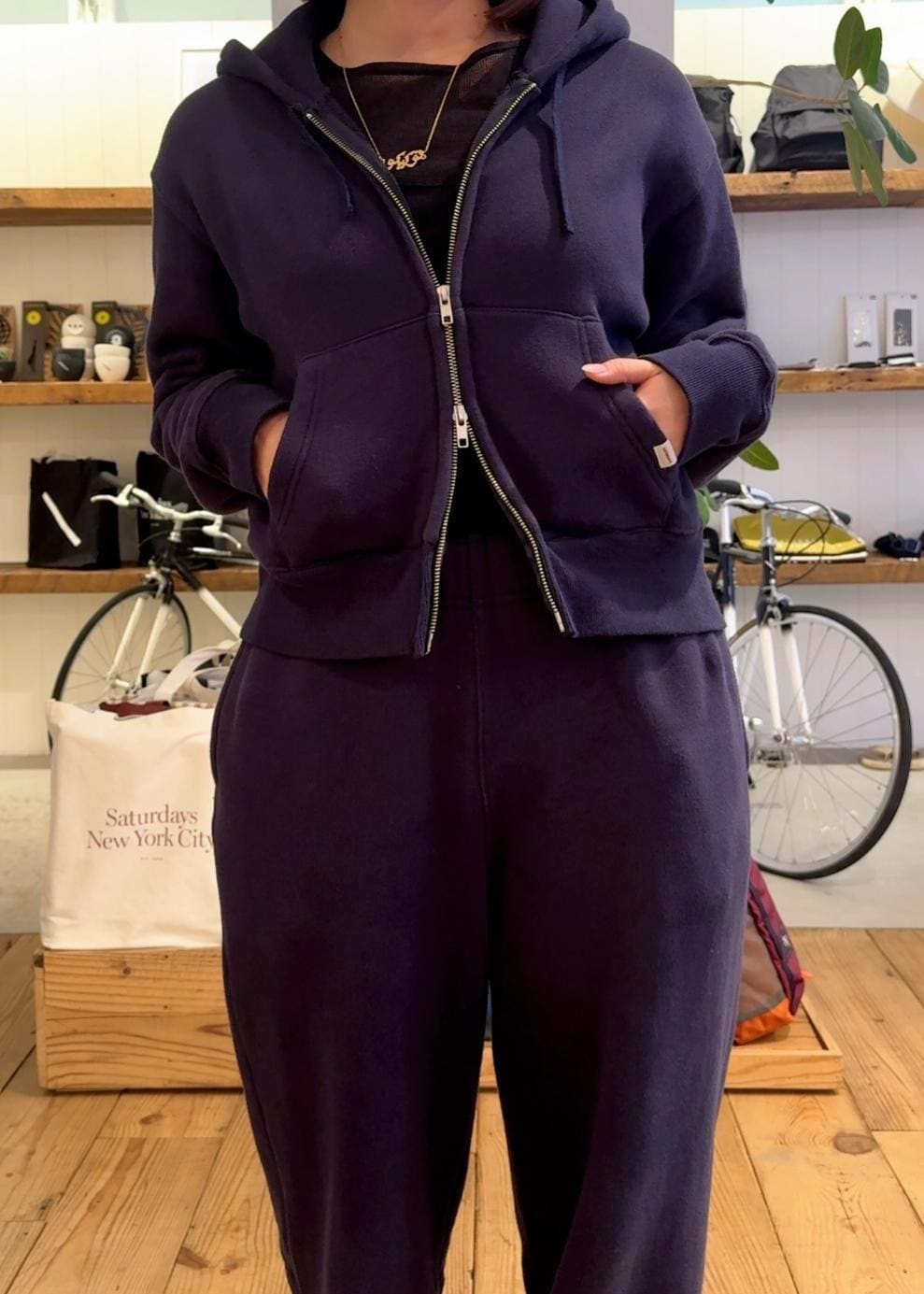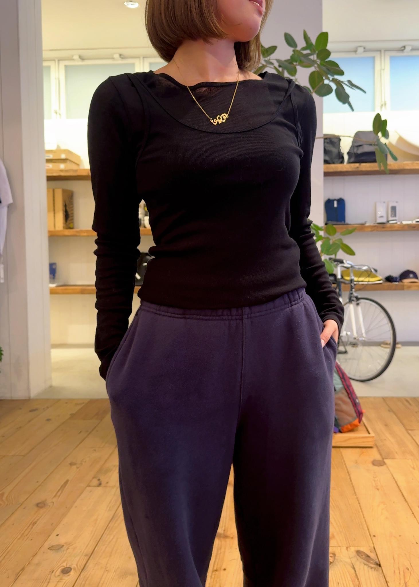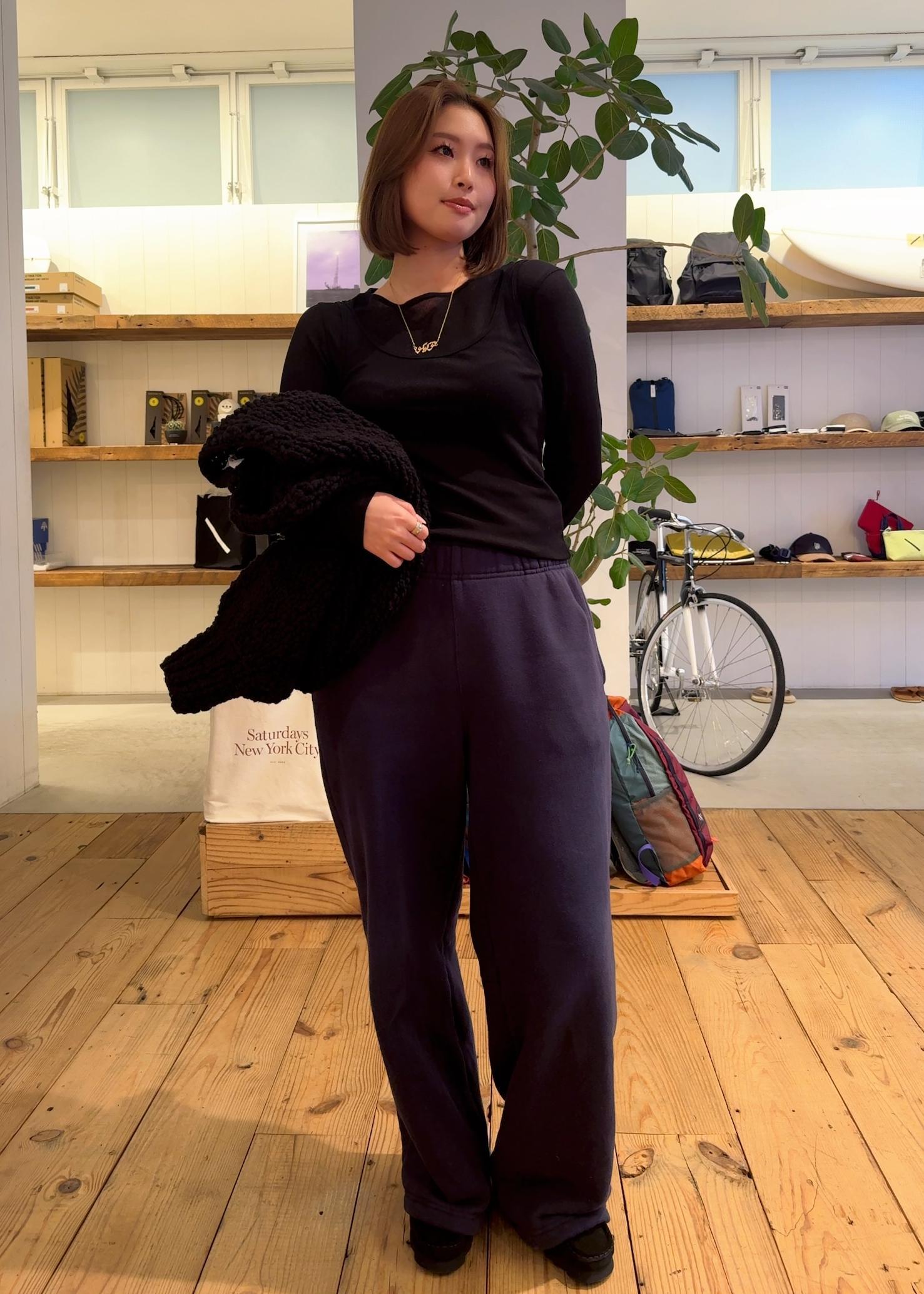 ネイビーのスウェットセットアップのスウェットパンツをベースに、インナー・アウター・小物を全てブラックで統一したレイヤード!