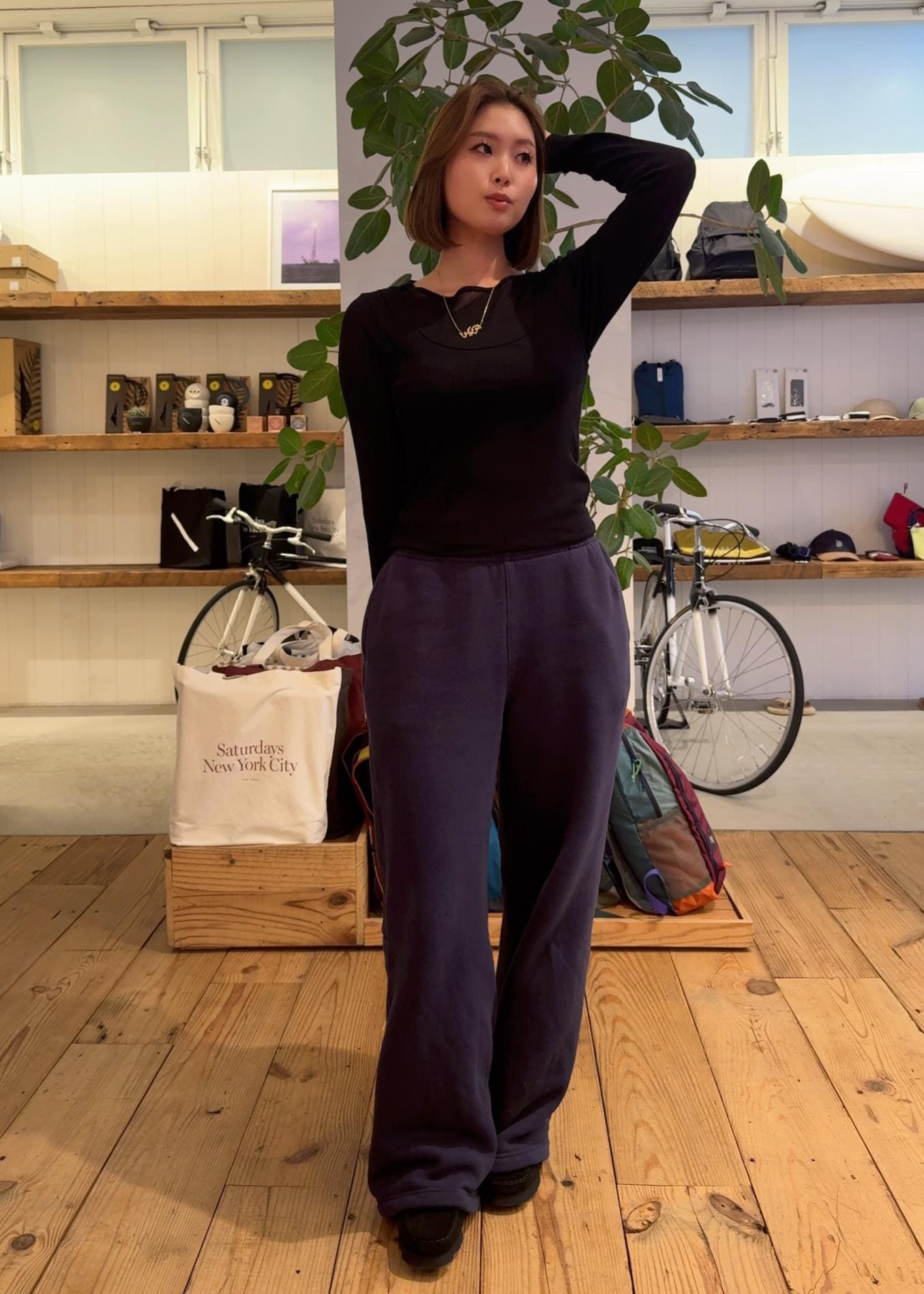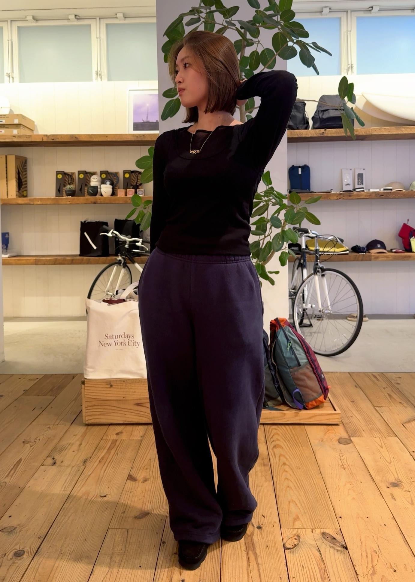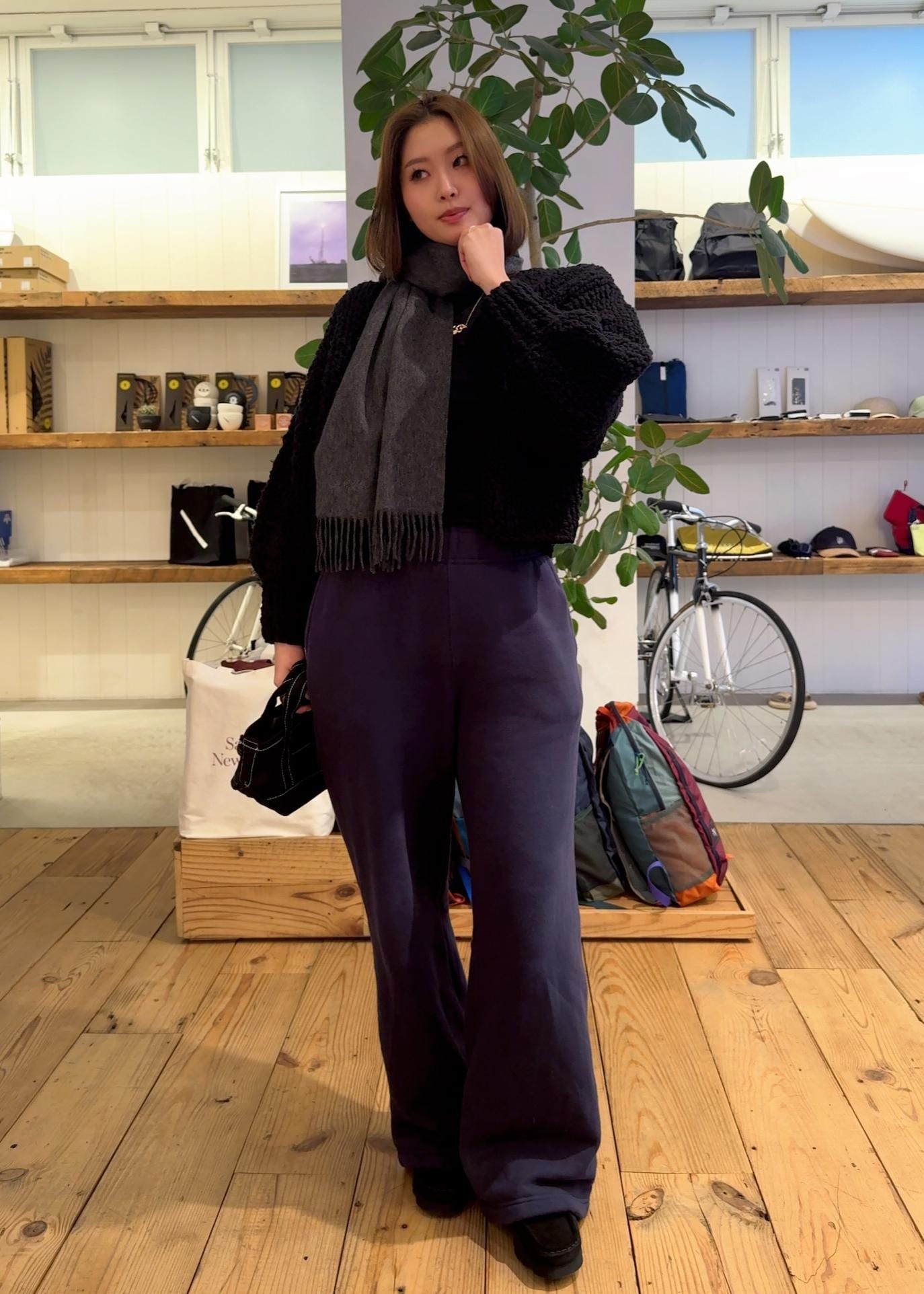 ネイビーのスウェットセットアップのスウェットパンツをベースに、インナー・アウター・小物を全てブラックで統一したレイヤード!