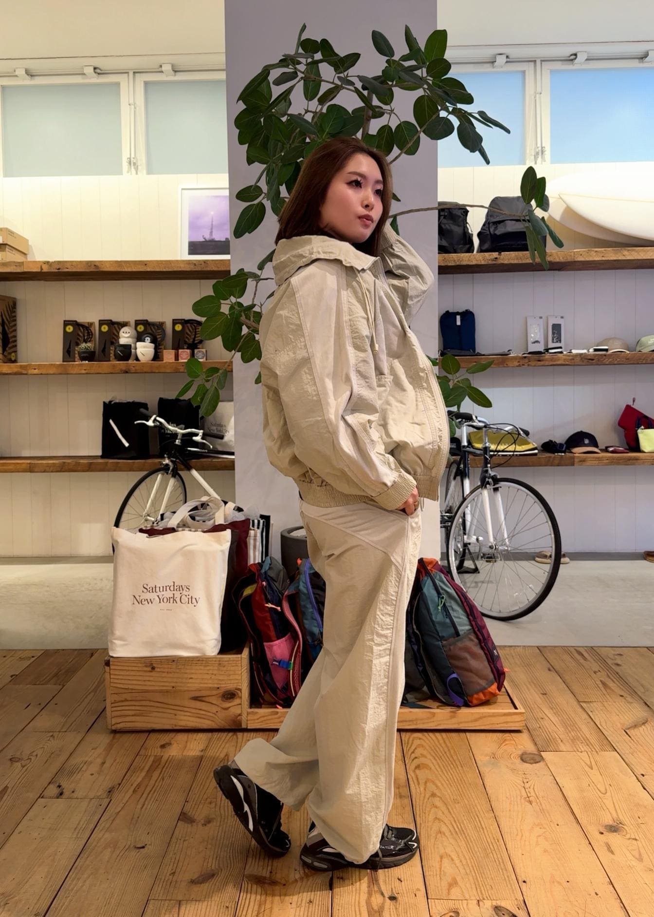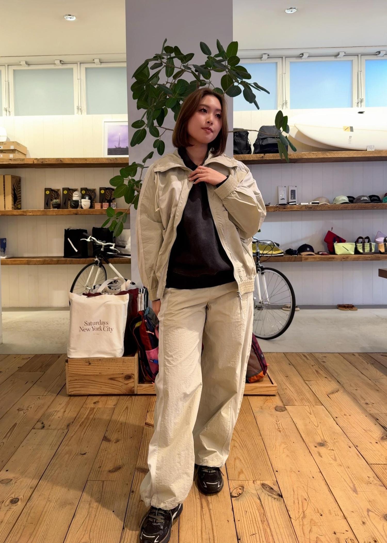 ベージュのトーンが柔らかく、切り返しのあるデザインが今っぽいセットアップです!