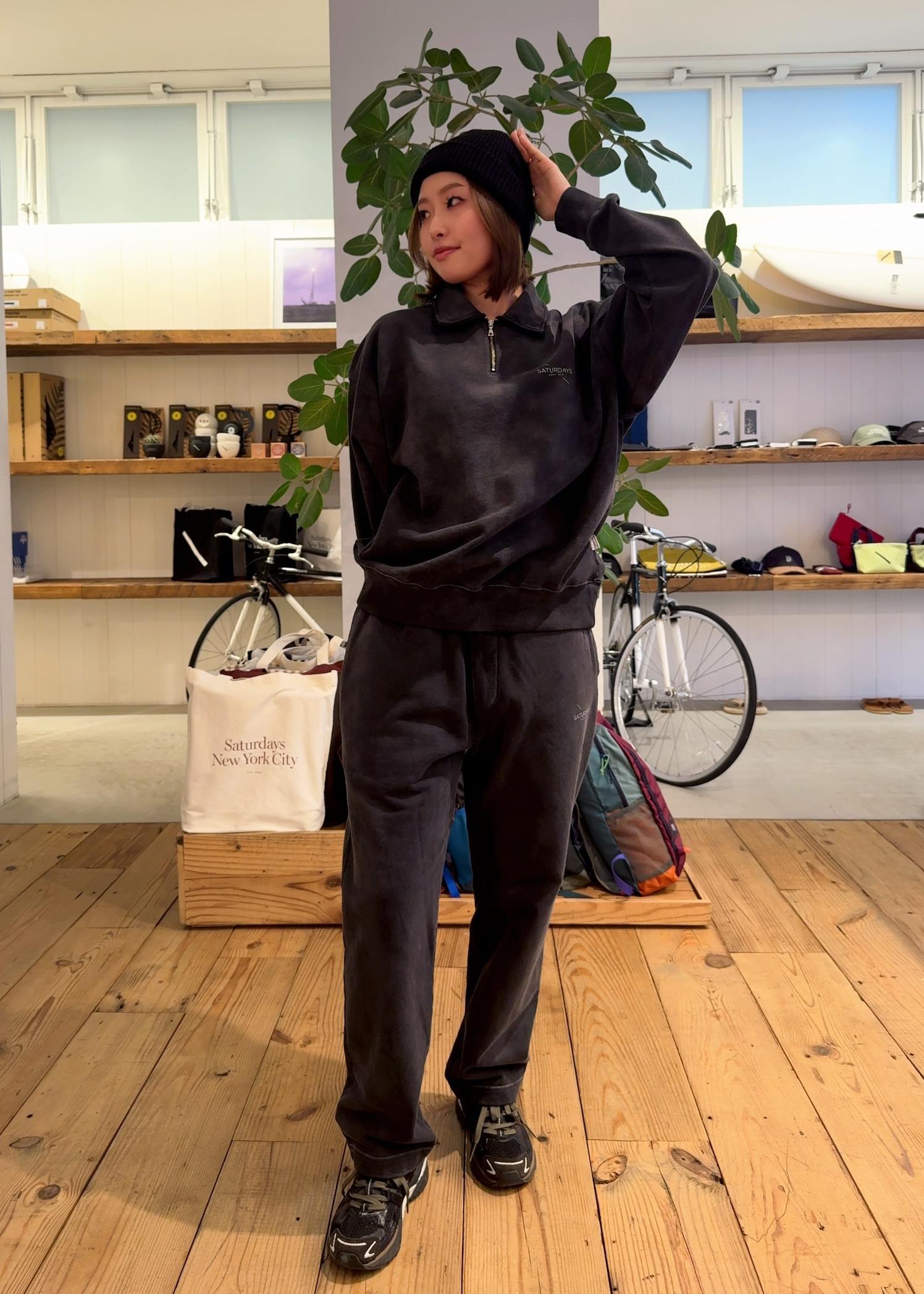 くすみブラックのスウェットセットアップは、サクッと使える万能アイテム!