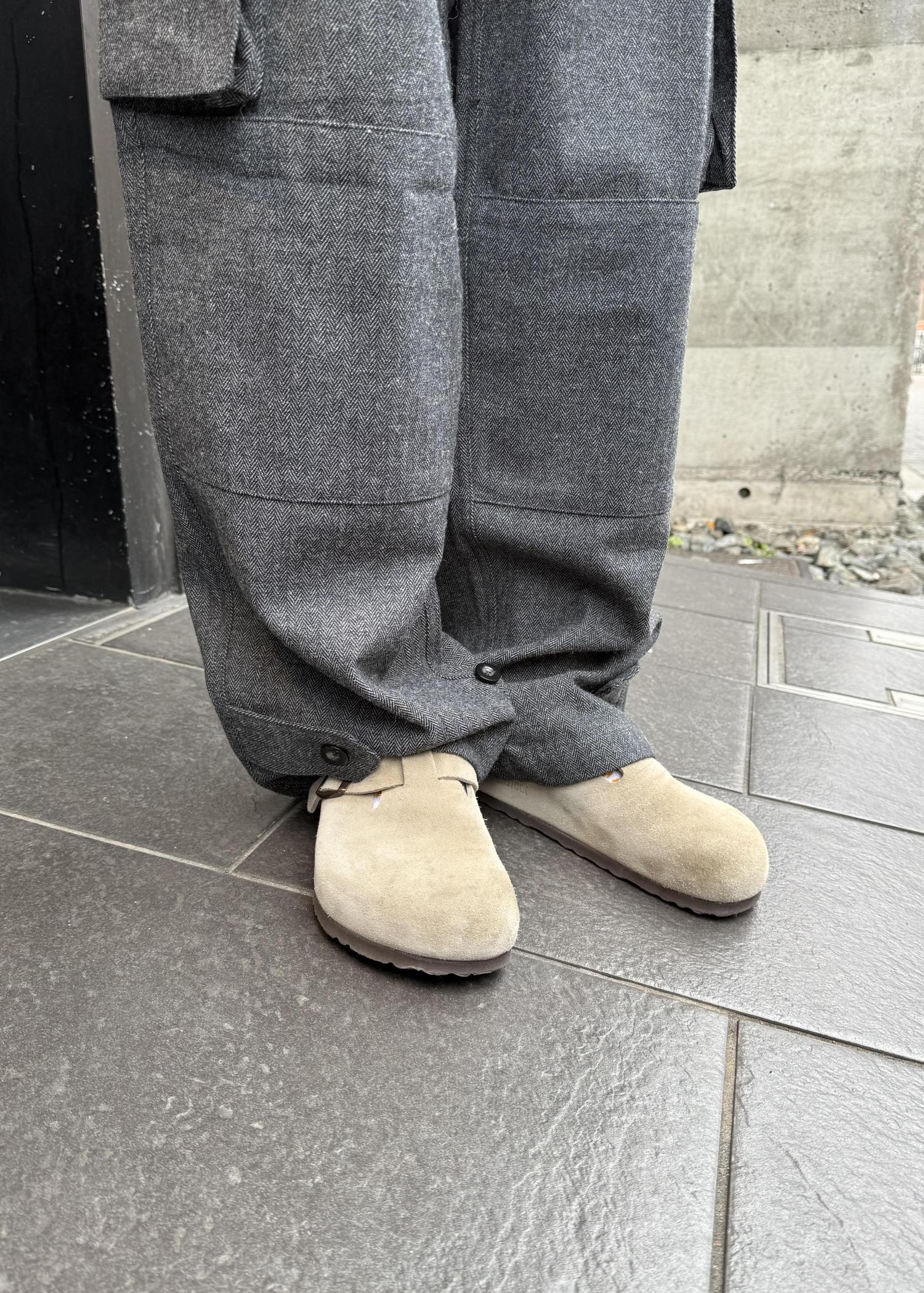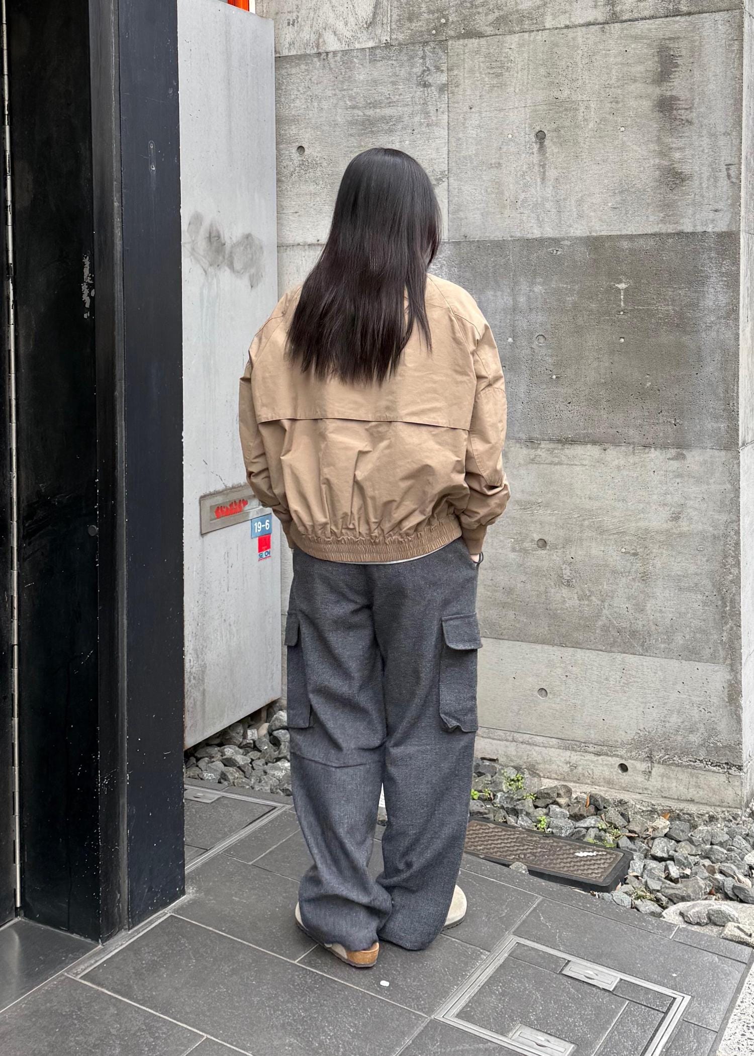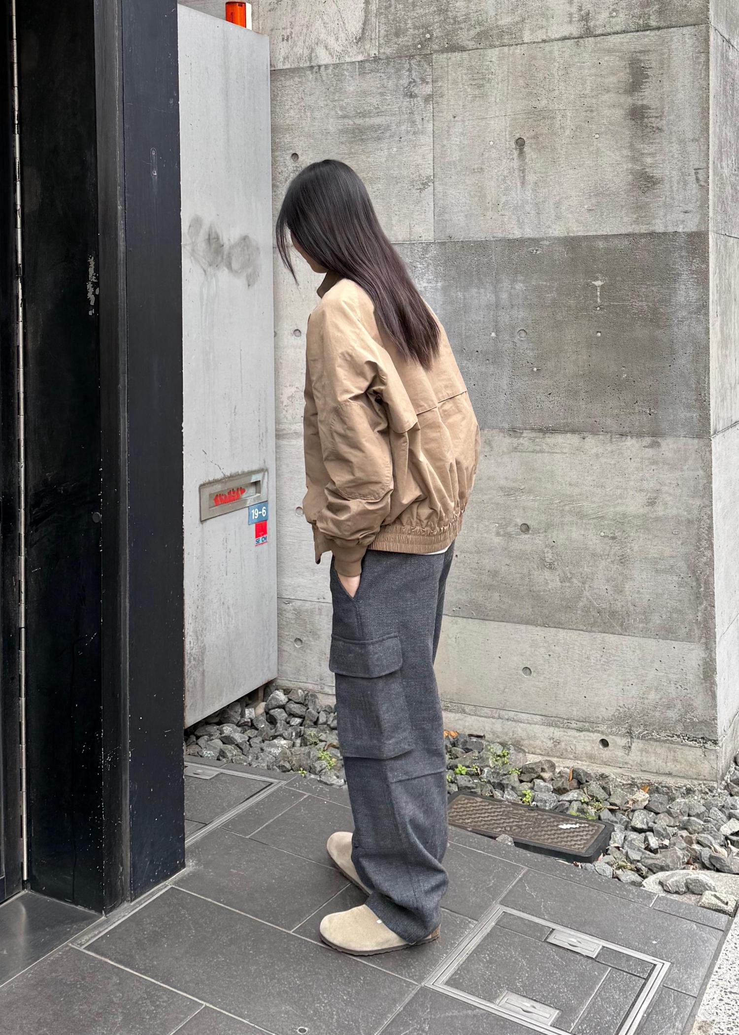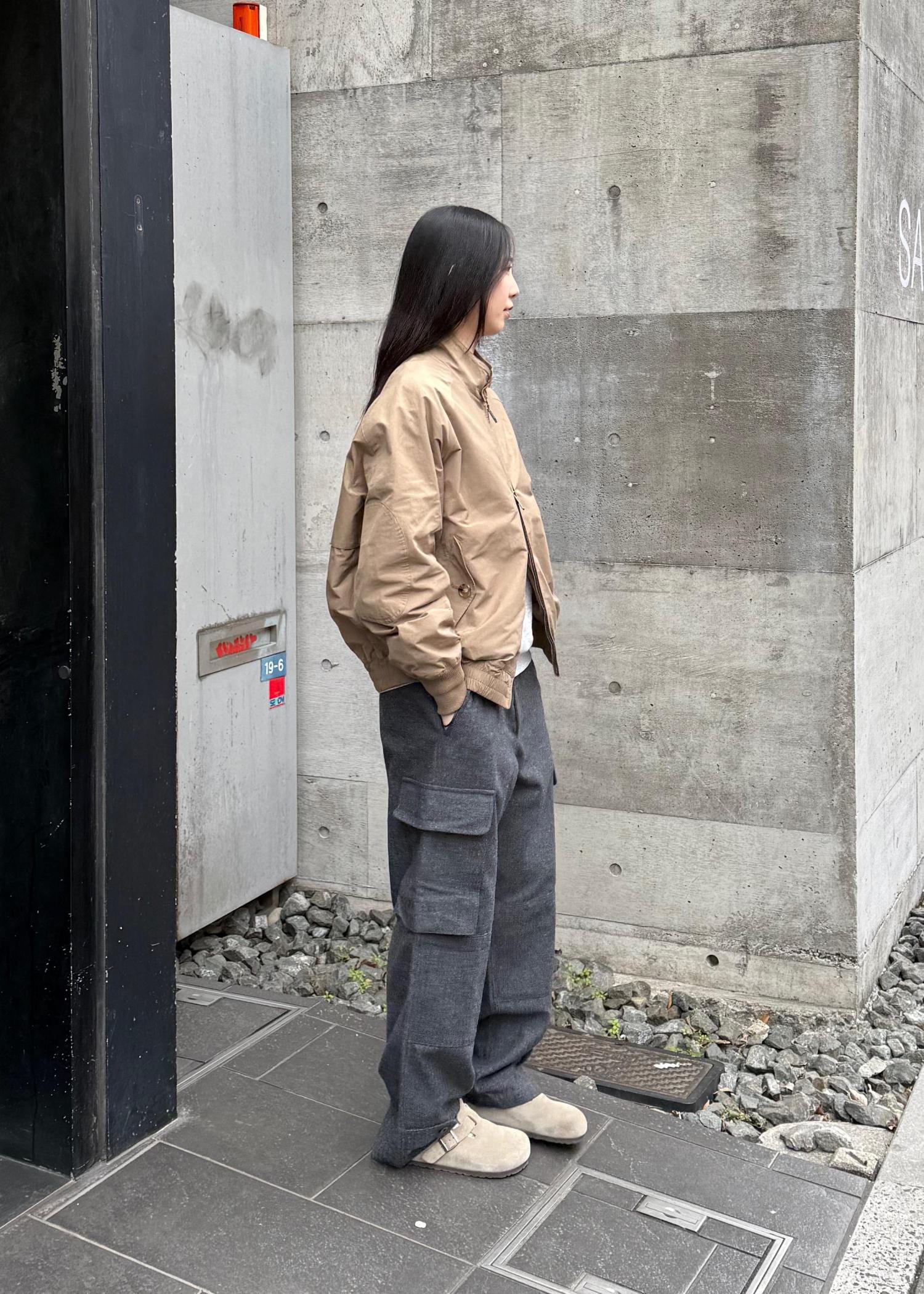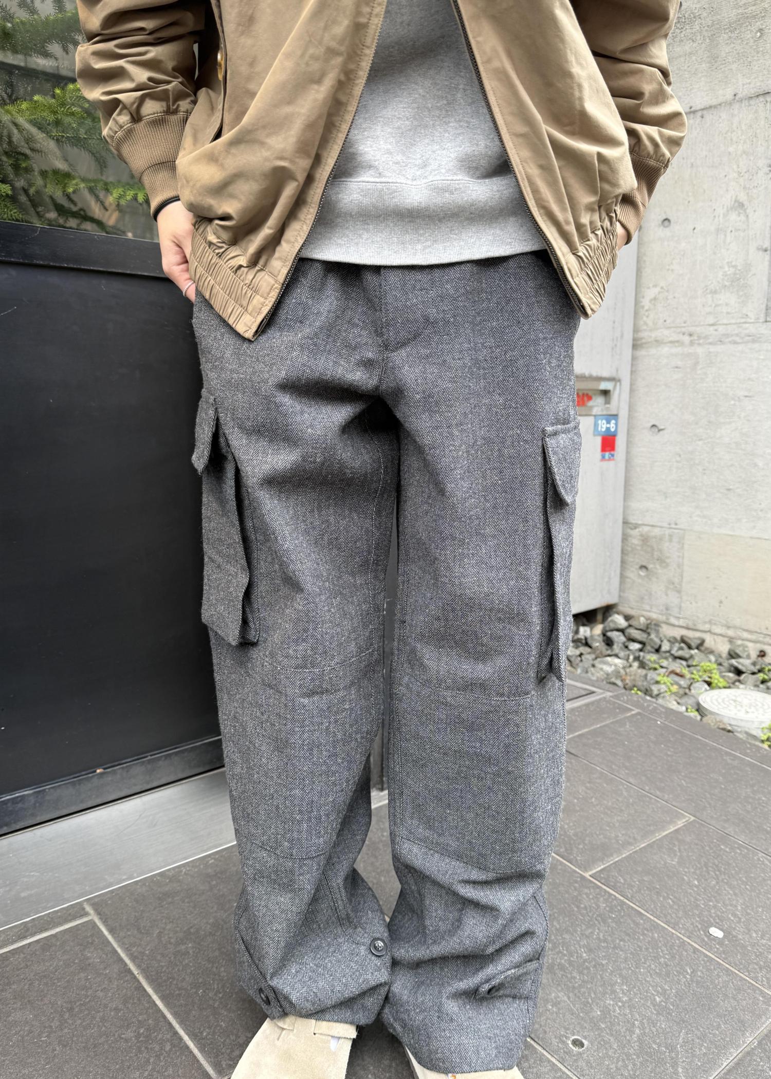 パンツはユーロヴィンテージから着想を得たミリタリーパンツを綺麗な素材で表現しました。