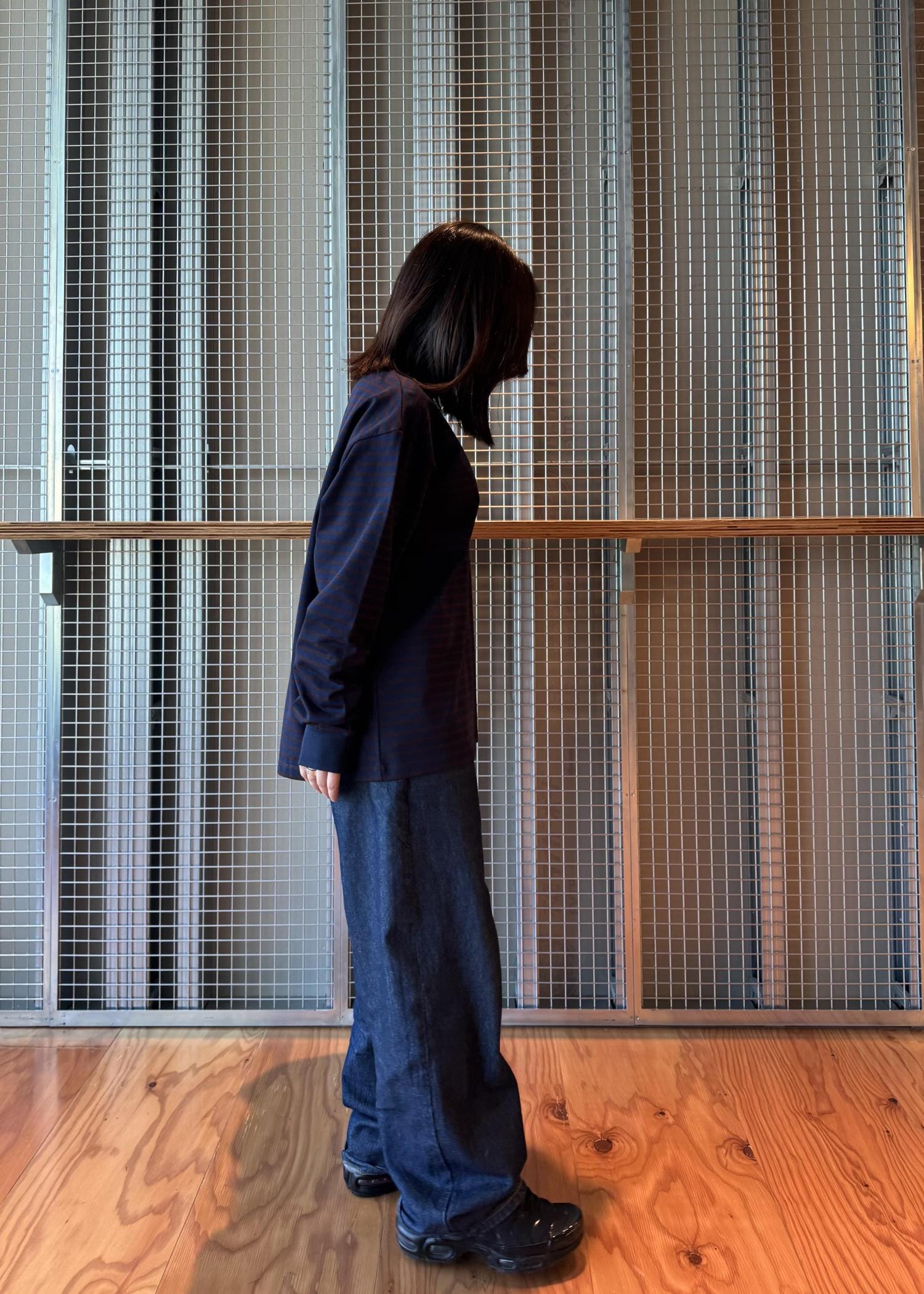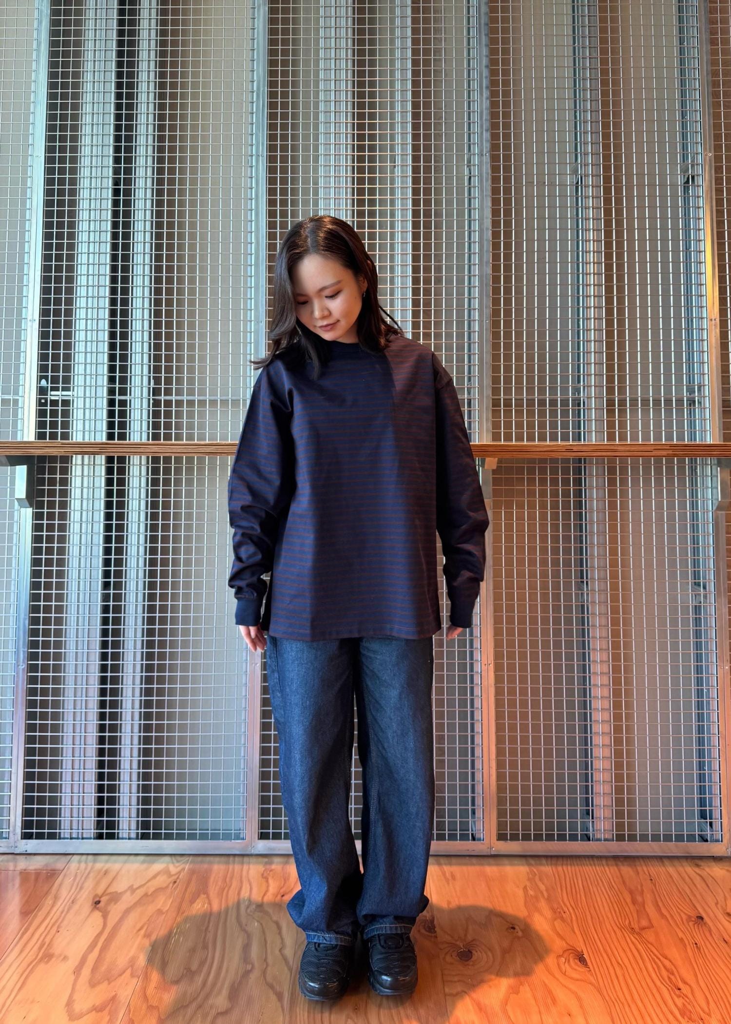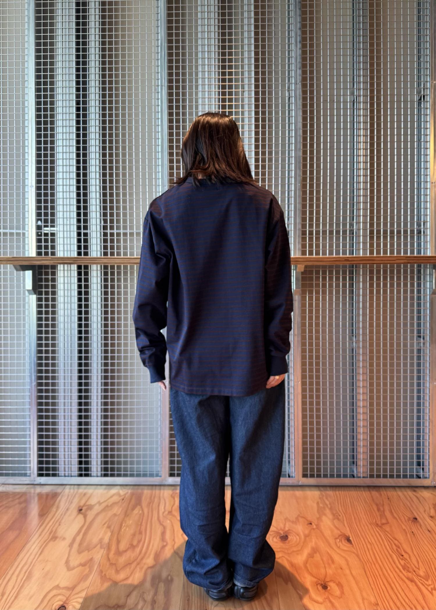 落ち着いたカラーで構成した先染めボーダーと、程よくリラックスしたシルエットが、一枚着はもちろんレイヤードスタイルにも映える一着です。