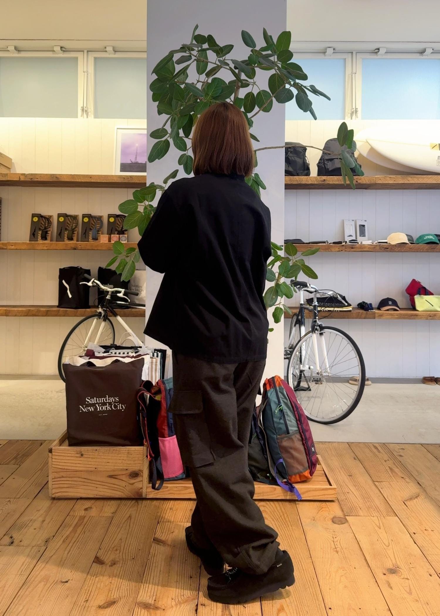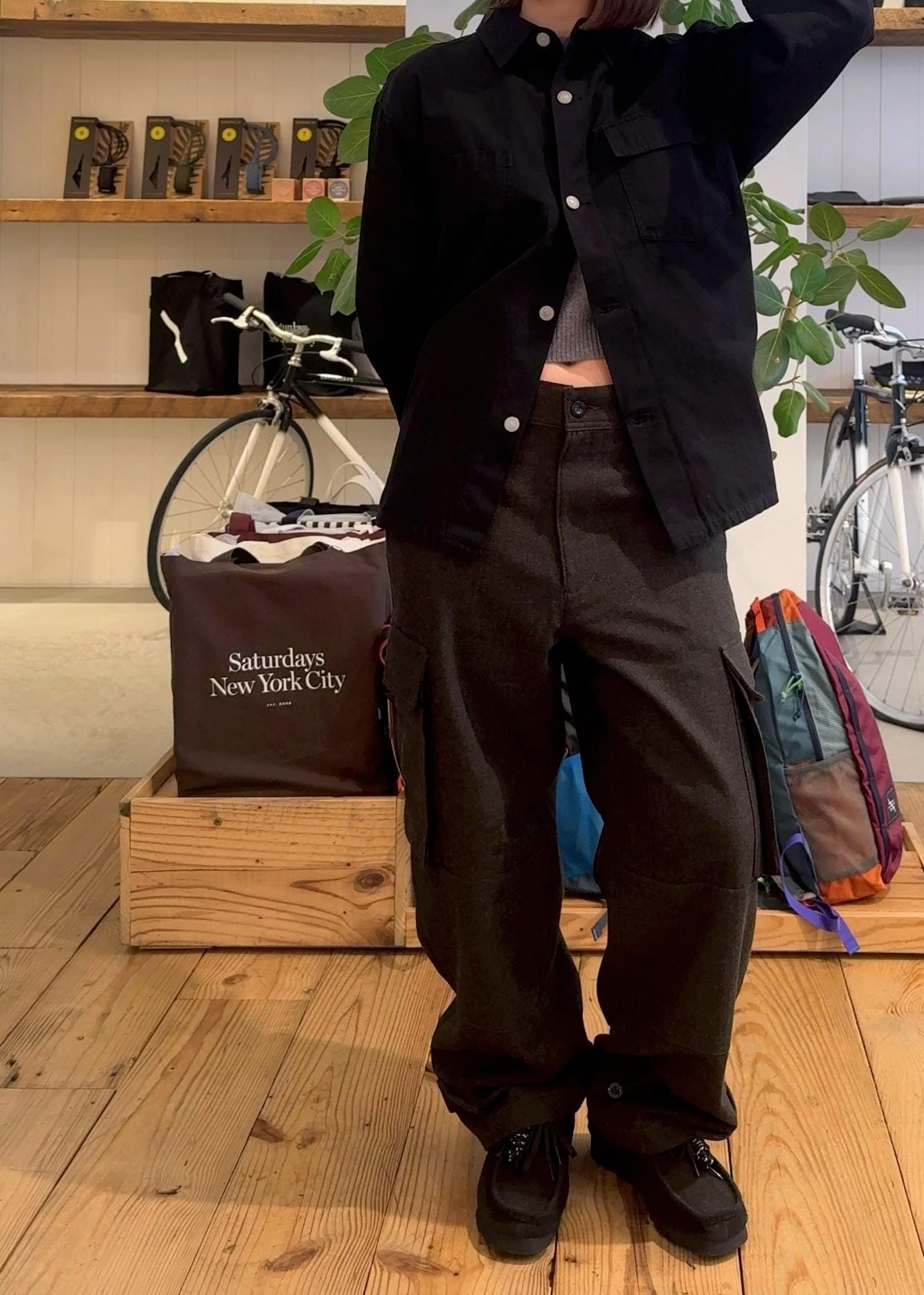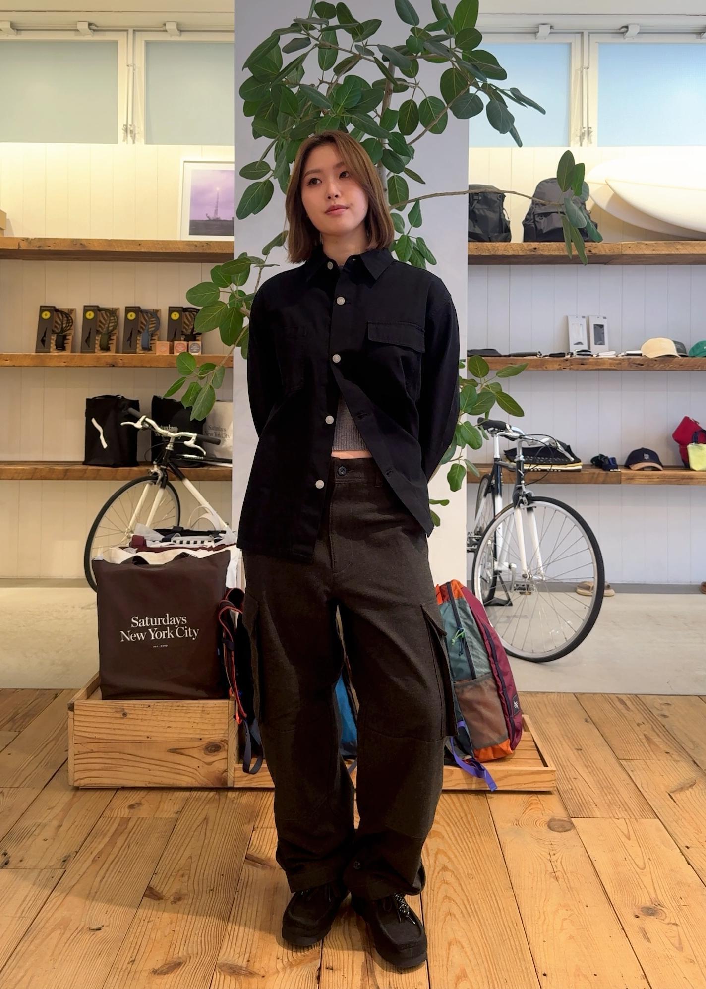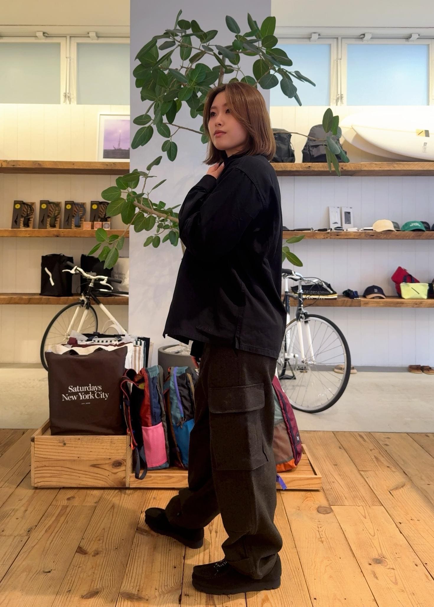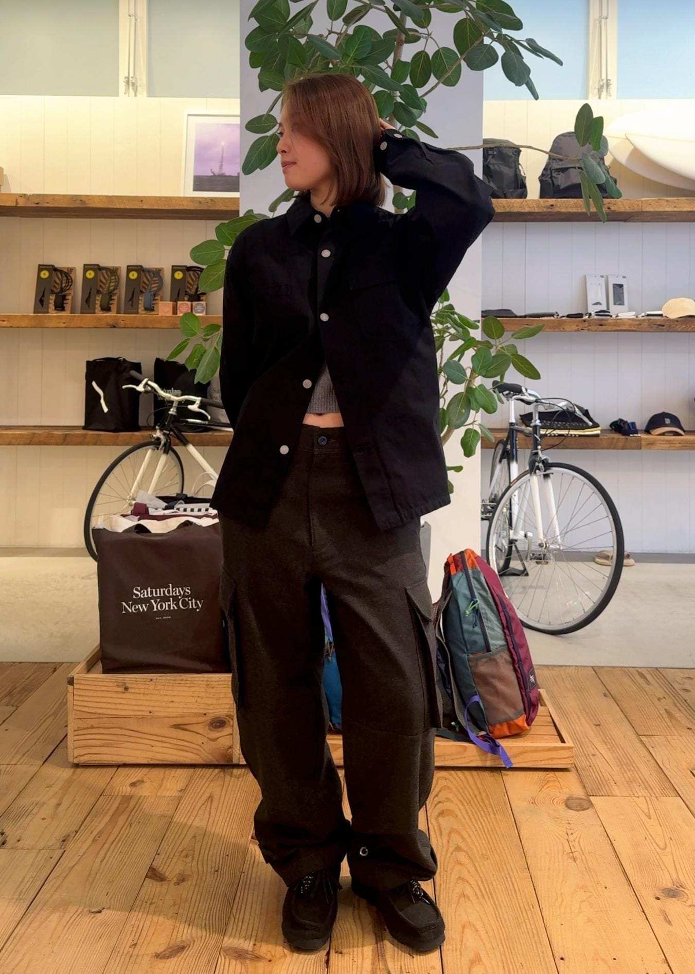 全体をブラックトーンで統一しつつ、パンツの素材とカーゴデザインで立体感を作ったスタイルです!
