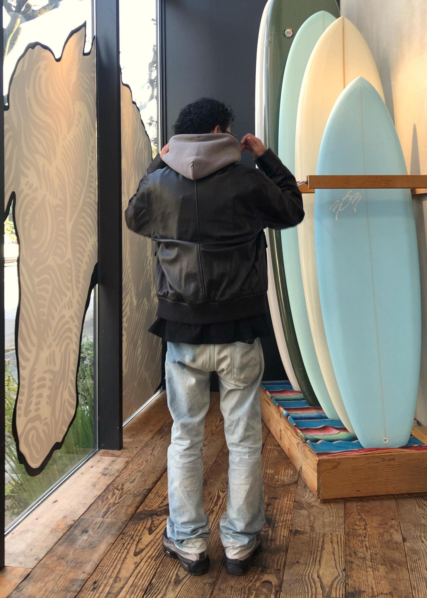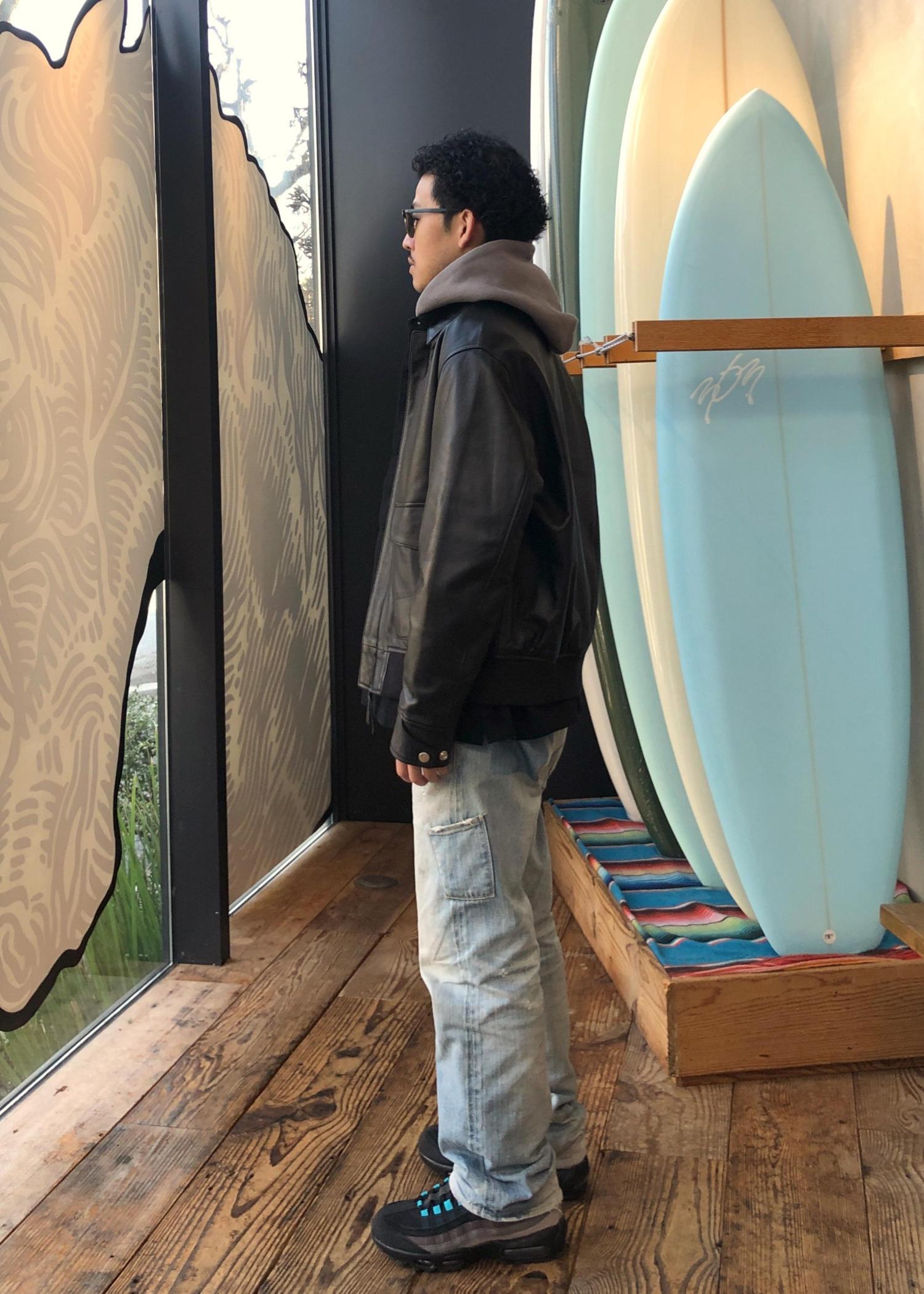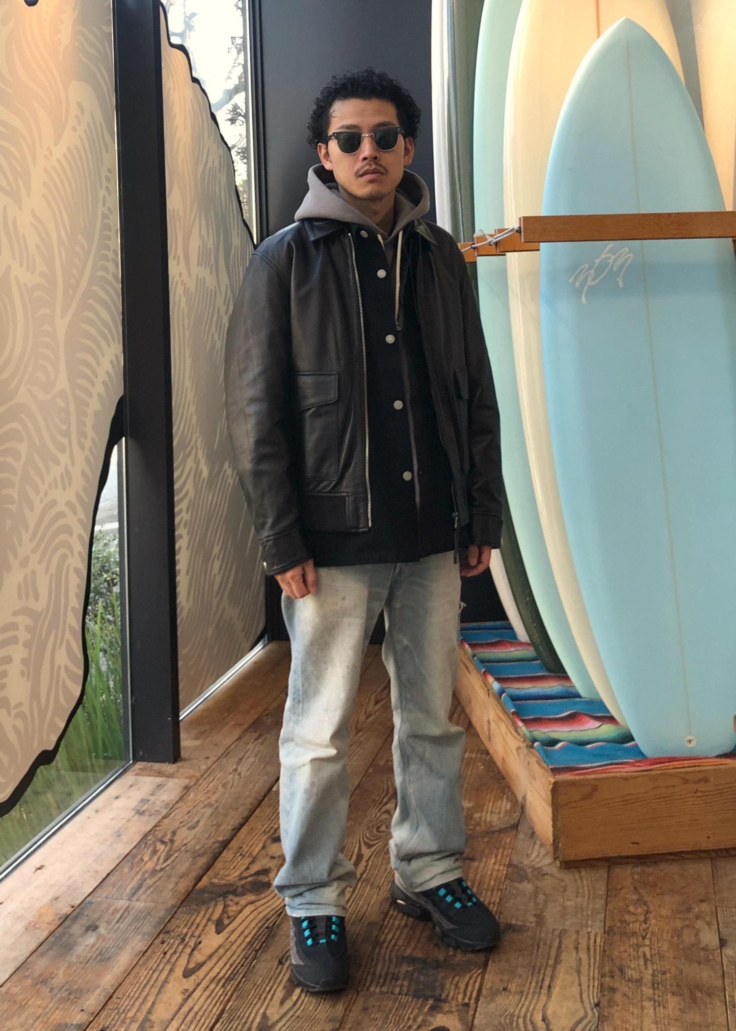 インナーで色味をプラス、インナーのシャツとレザージャケットは同色ですがサイズ感を変えて、やや裾出し。