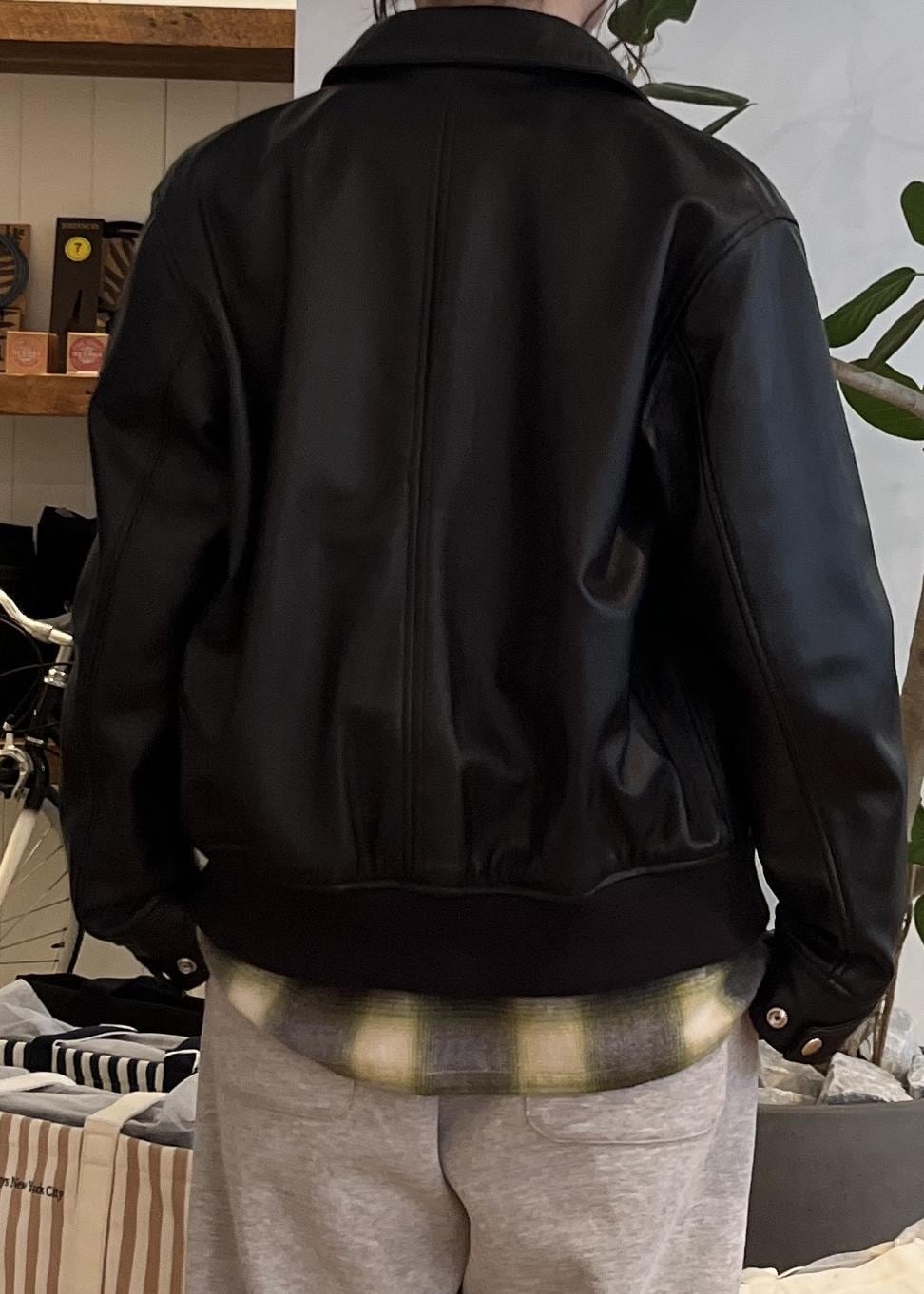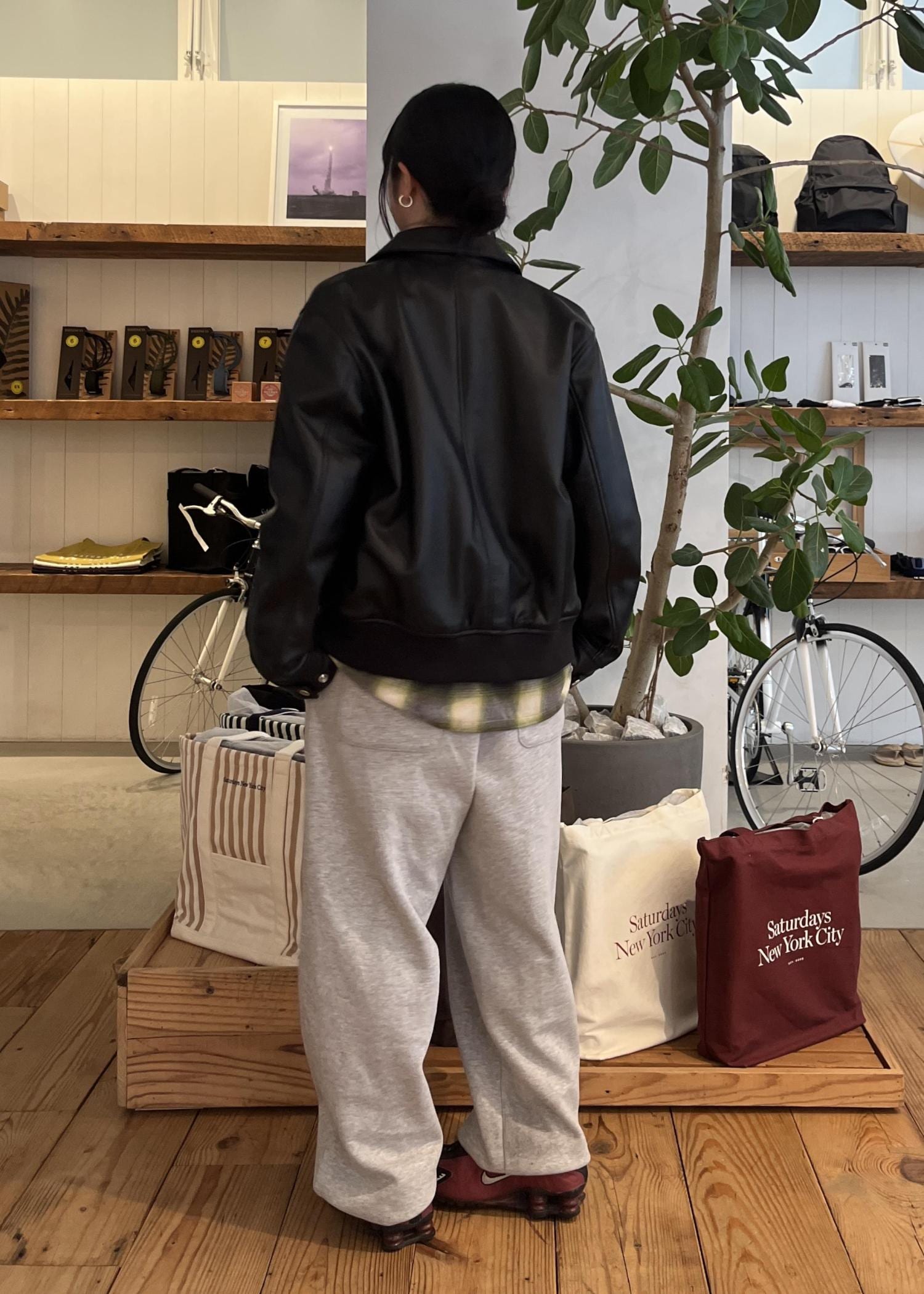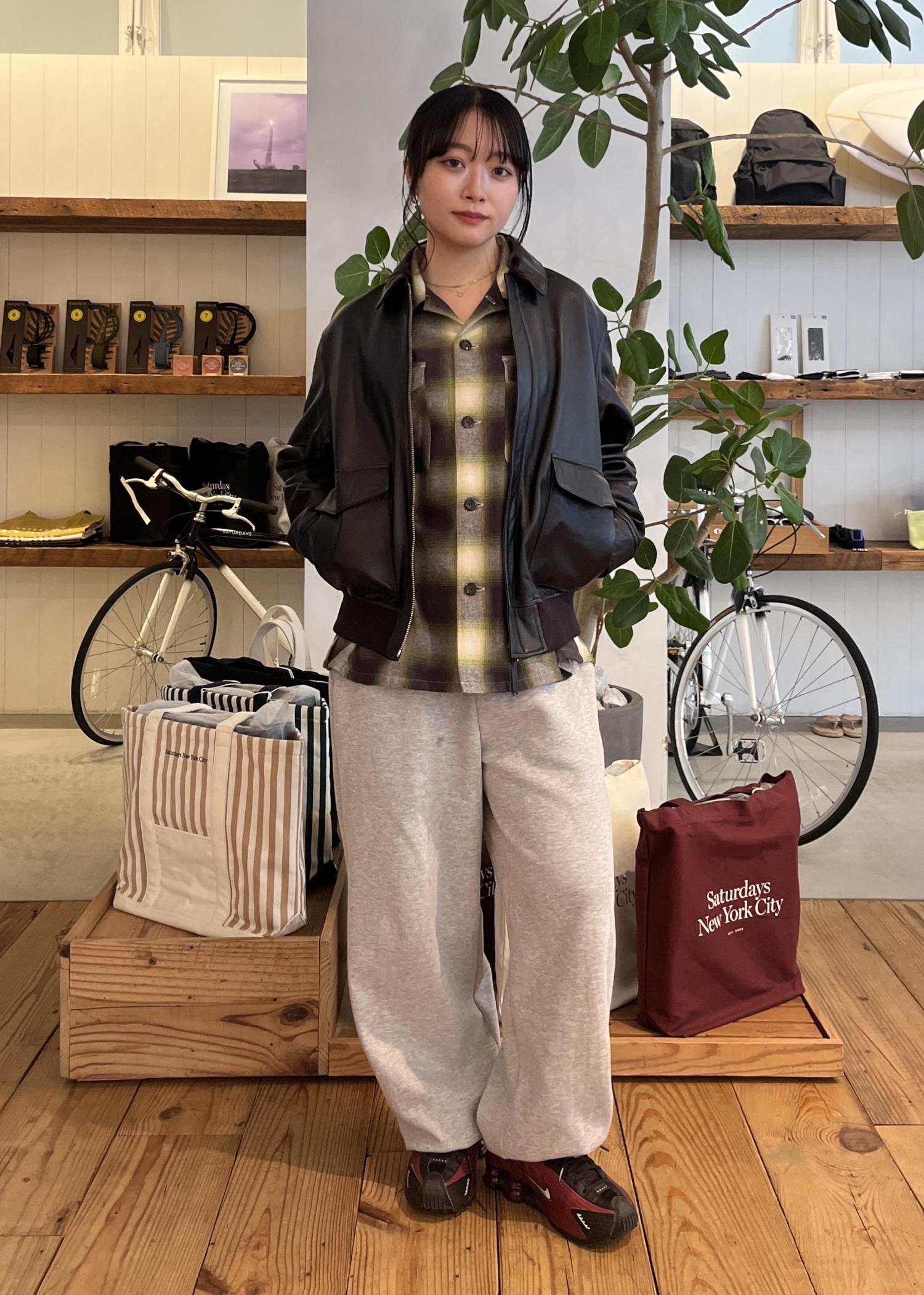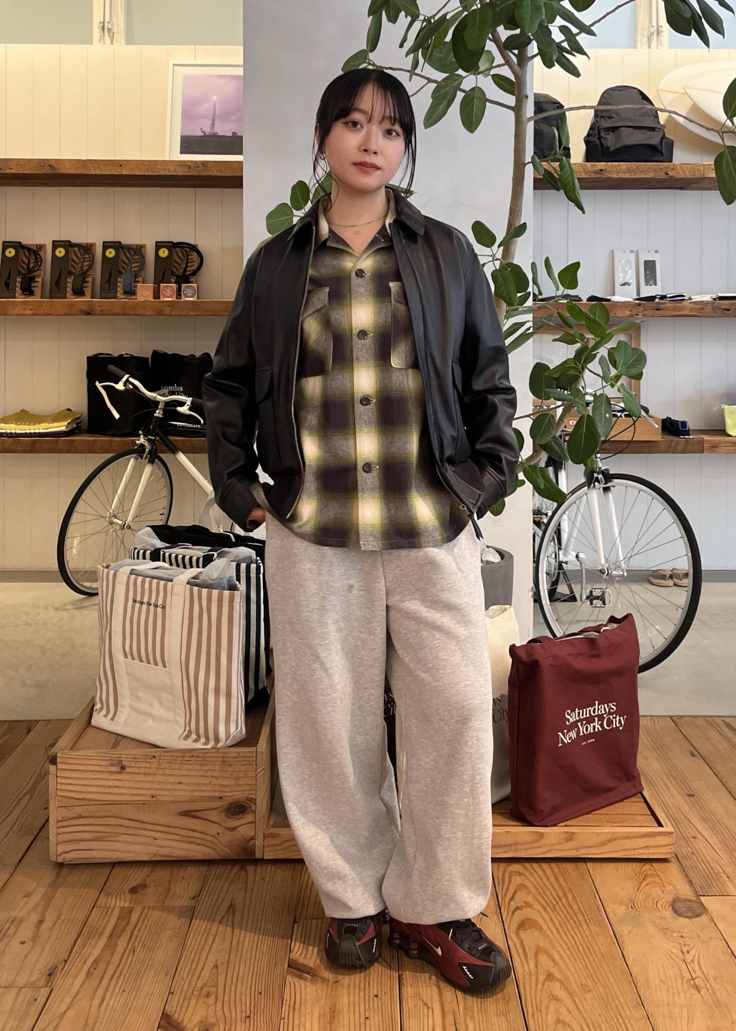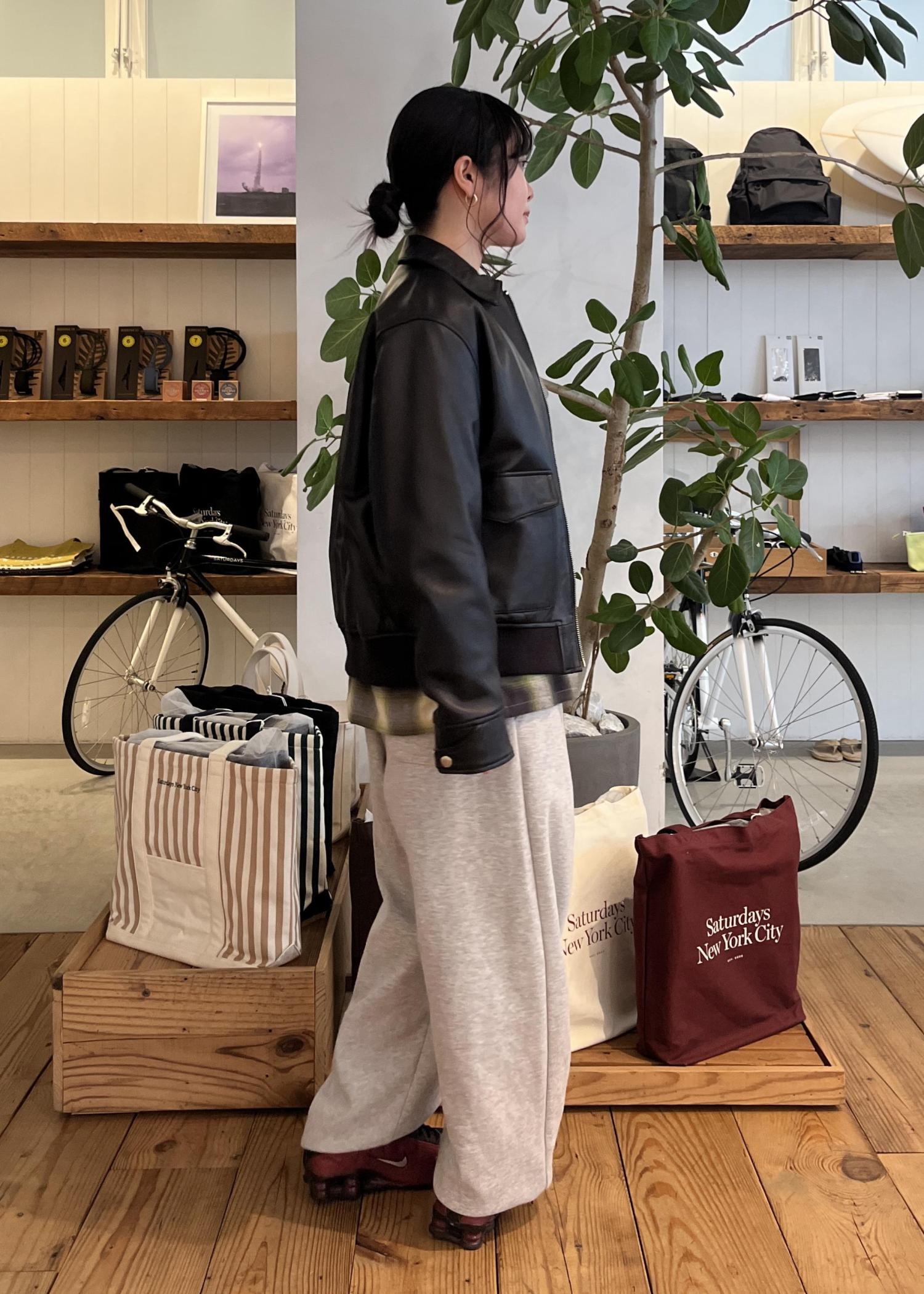 レザーを合わせてコーディネートを締め、スウェットパンツで抜け感をプラスしました⭐︎