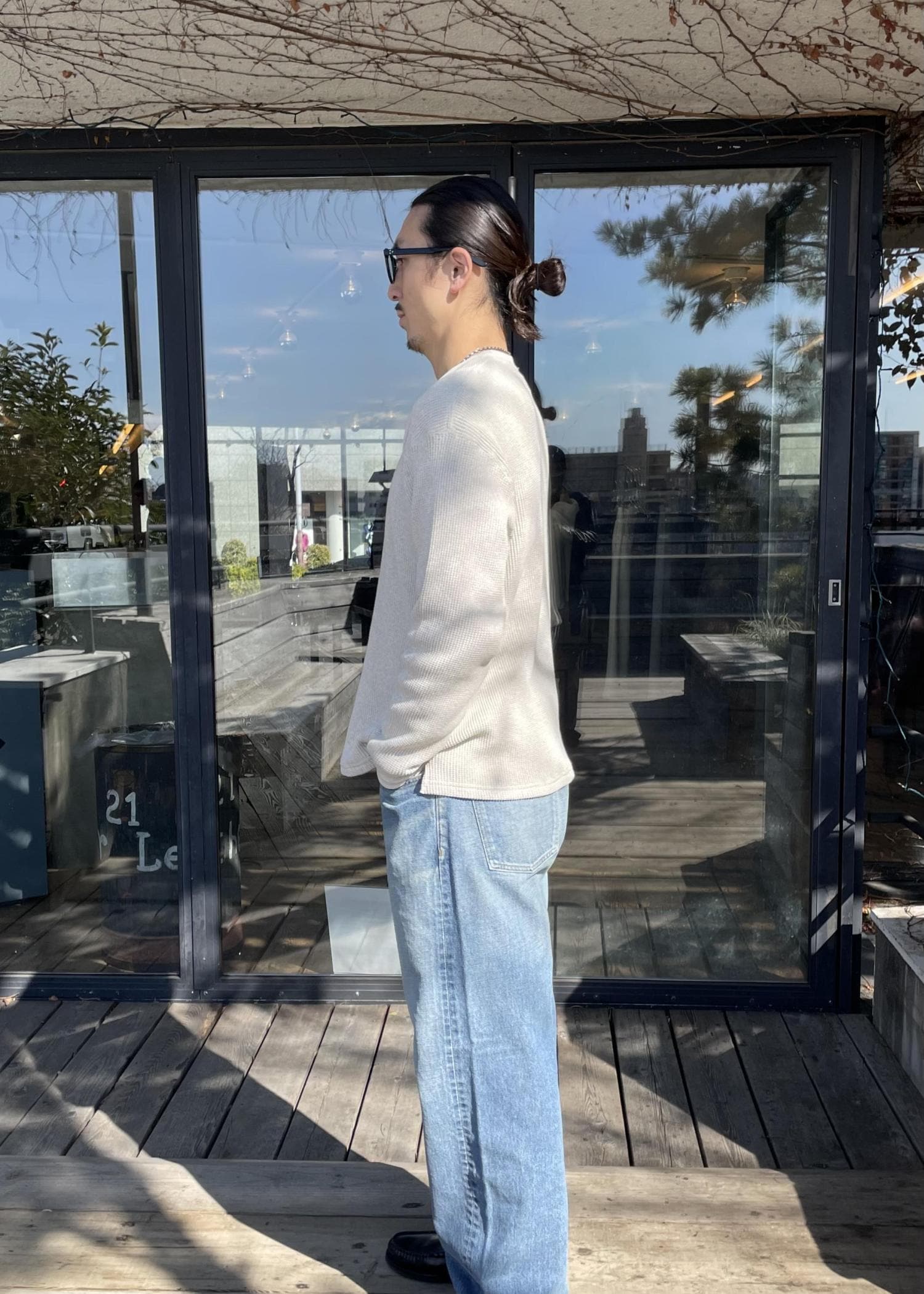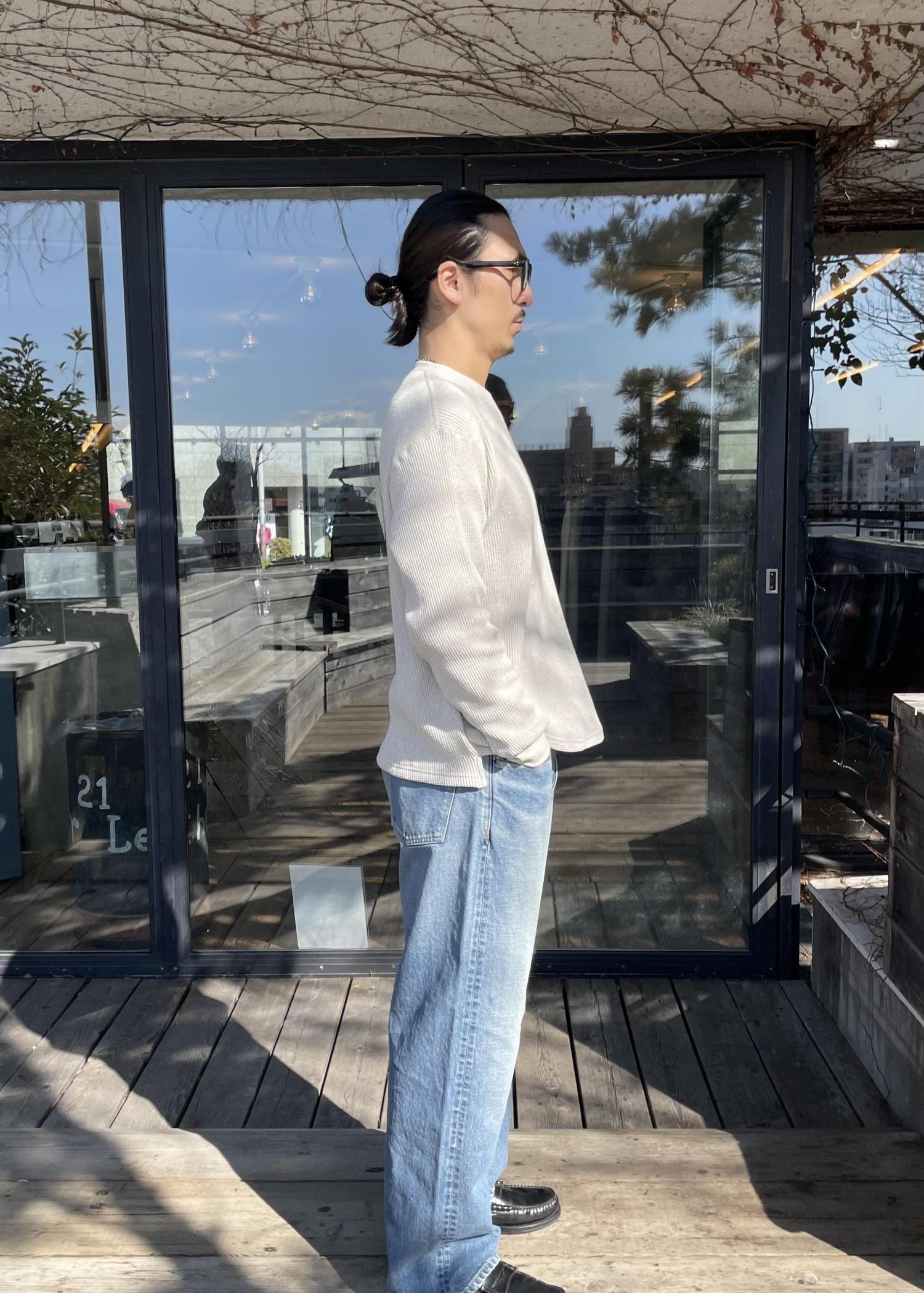 パンツは、新作のデニムで、少し太めのストレートデニムになっています!