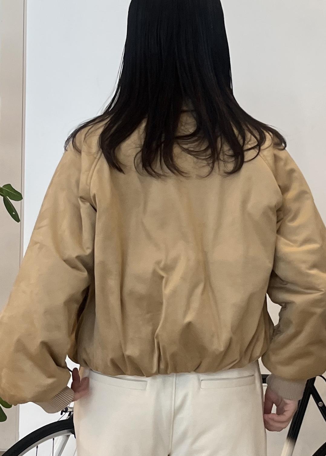 丸みのあるフォルムにクラシックな襟を合わせ、ショート丈ですっきりと仕上げています。フロントはファスナー仕様。