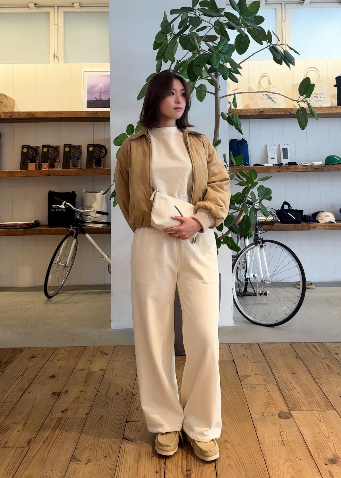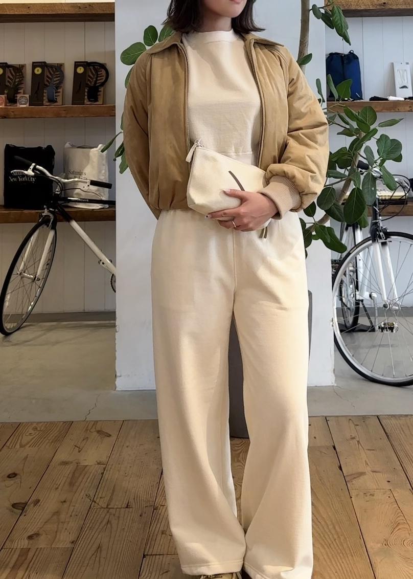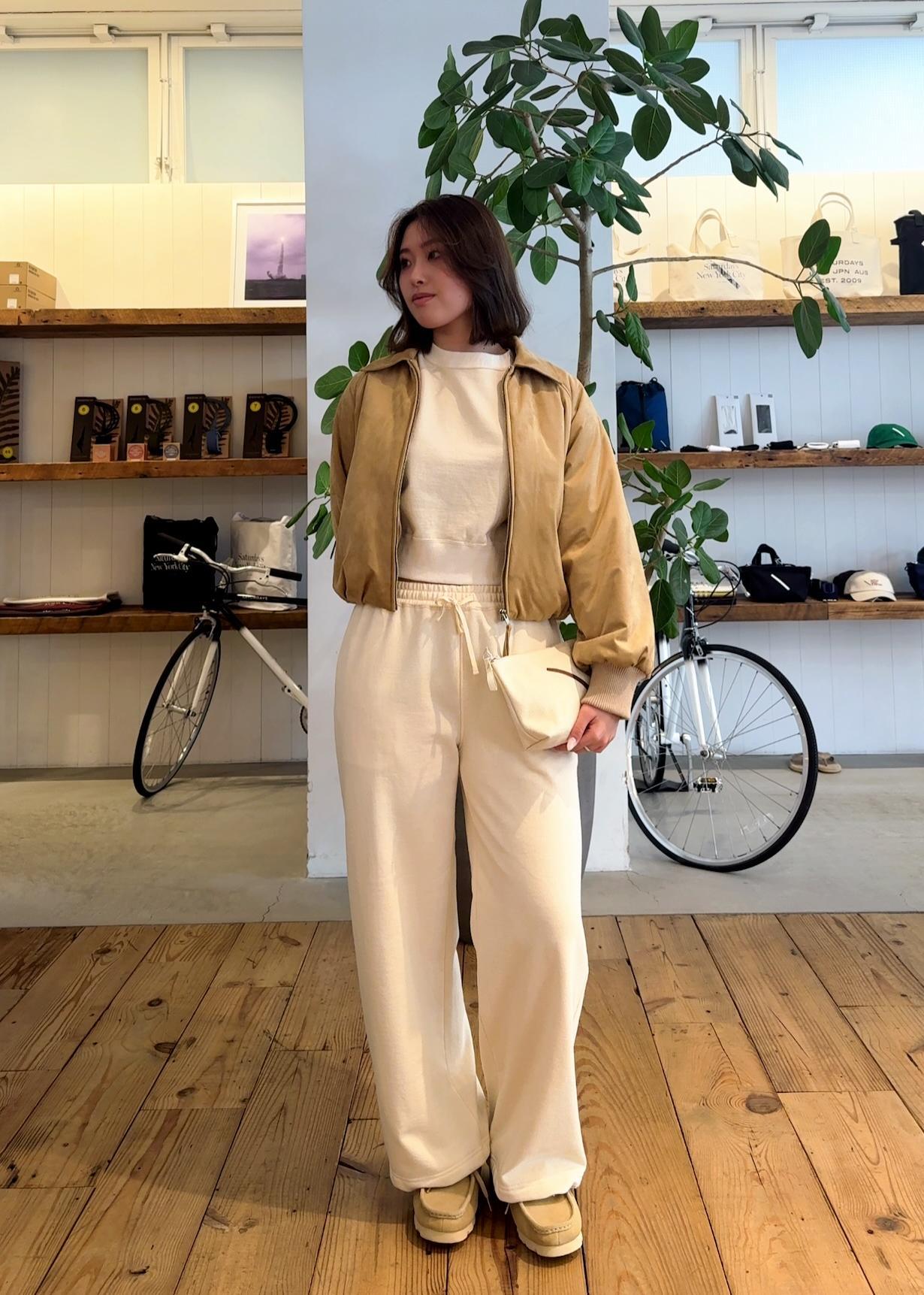 淡いベージュ系統でまとめた、抜け感のあるワントーンスタイル!ショート丈ジャケットとストレートが綺麗に見えるスウェットパンツとのバランスが、自然にスタイルアップを叶えてくれます。ラフな着心地なのに、どこか品があるのは素材とシルエットのおかげです。気張らず着られて、街にもカフェにもちょうどいい一着。