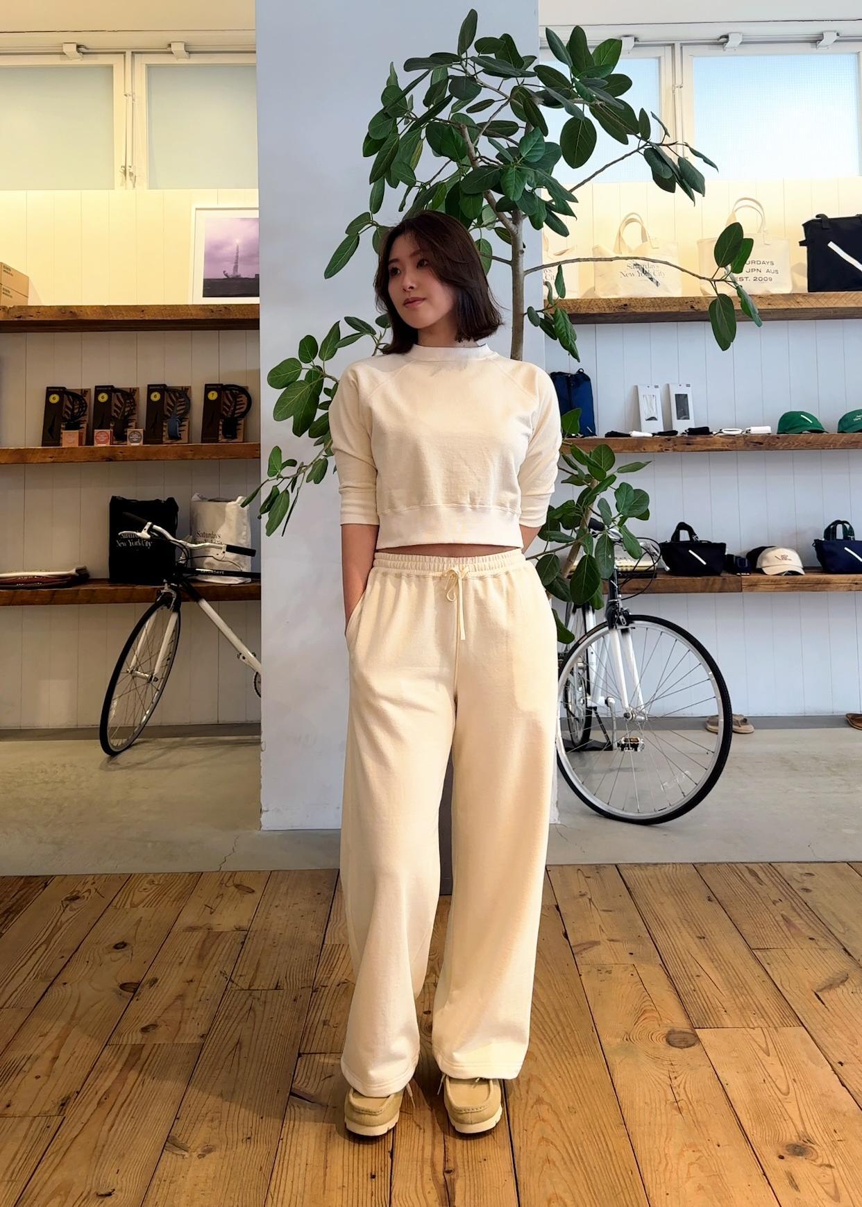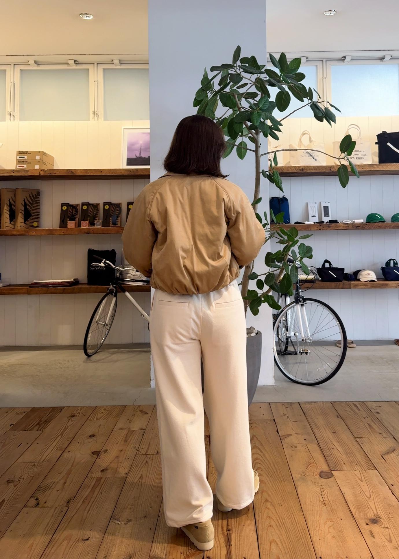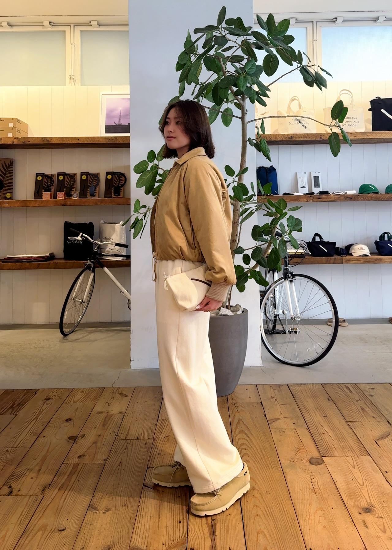 淡いベージュ系統でまとめた、抜け感のあるワントーンスタイル!ショート丈ジャケットとストレートが綺麗に見えるスウェットパンツとのバランスが、自然にスタイルアップを叶えてくれます。ラフな着心地なのに、どこか品があるのは素材とシルエットのおかげです。気張らず着られて、街にもカフェにもちょうどいい一着。
