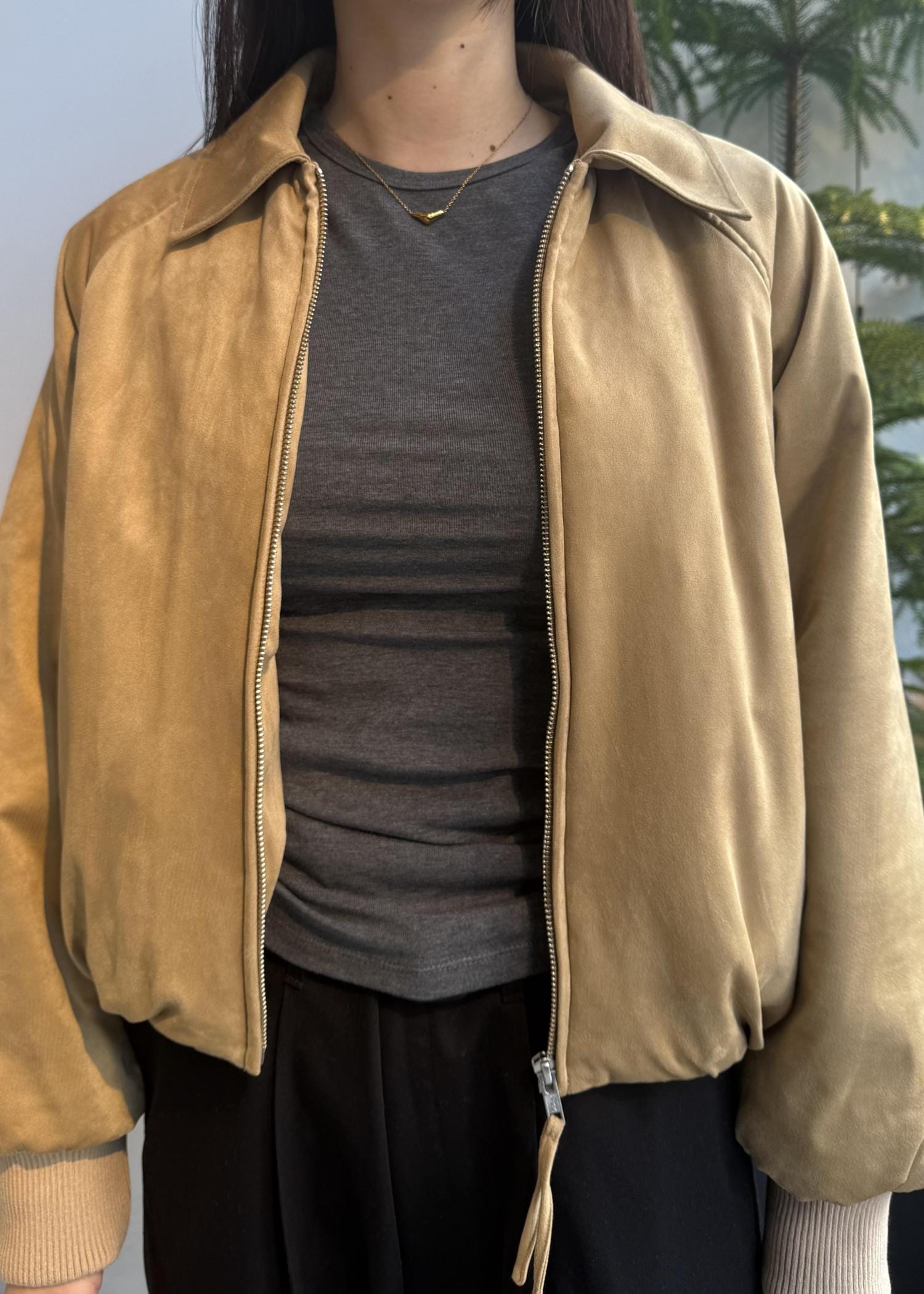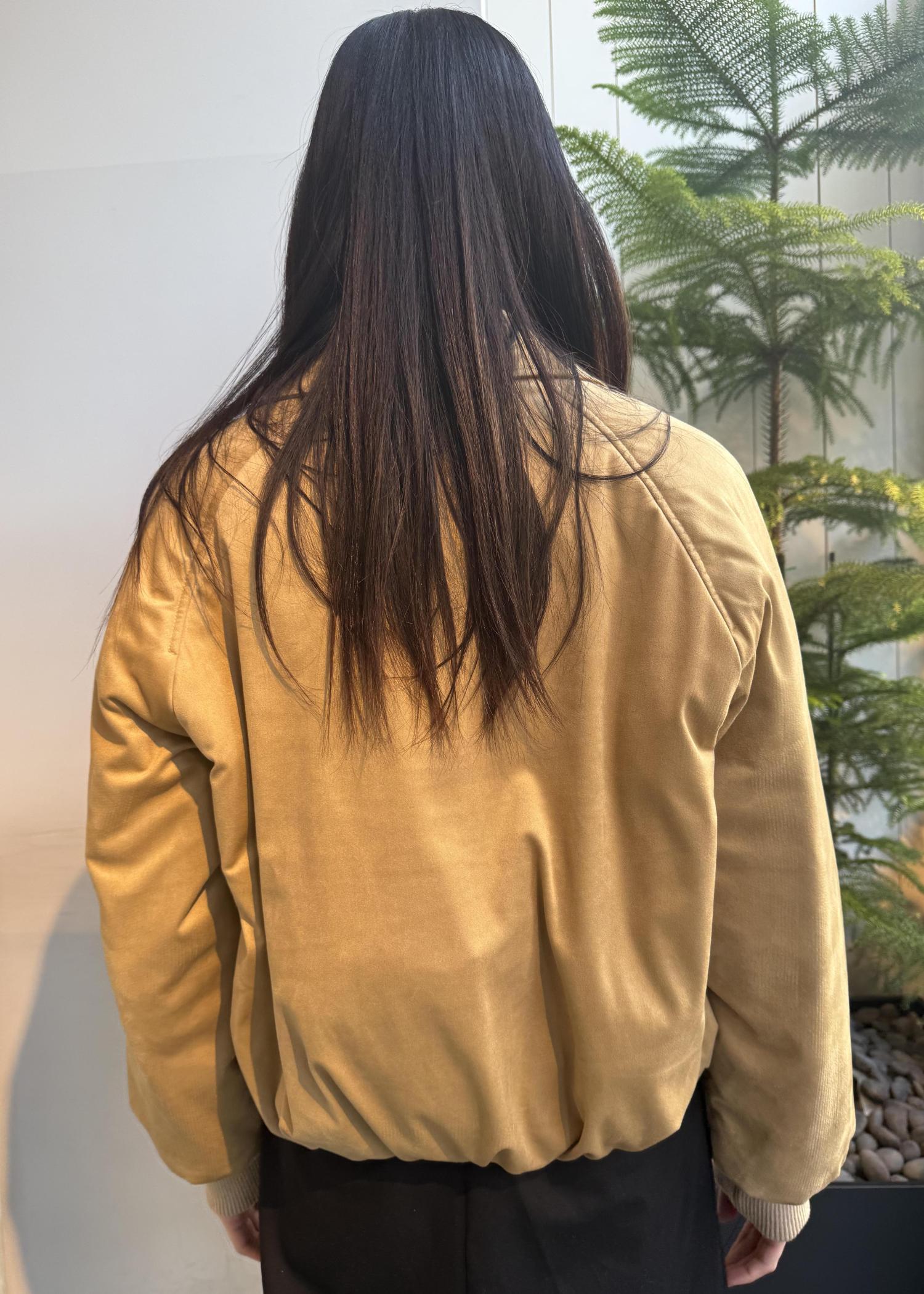丸みのあるフォルムにクラシックな襟を合わせ、ショート丈ですっきりと仕上げています。フロントはファスナー仕様。