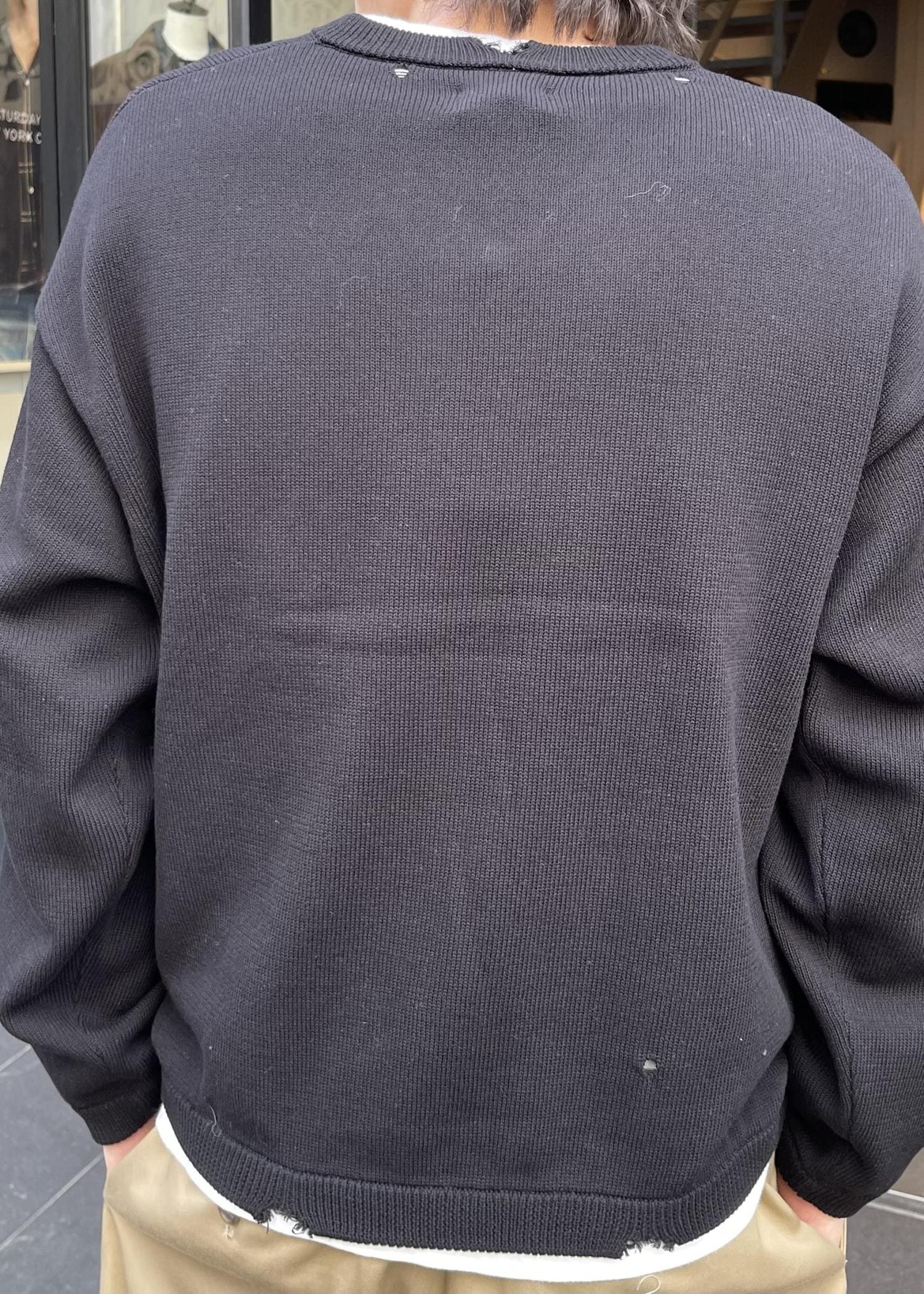 ダメージ加工でゆったりとしたシルエットが特徴のVネックセーター