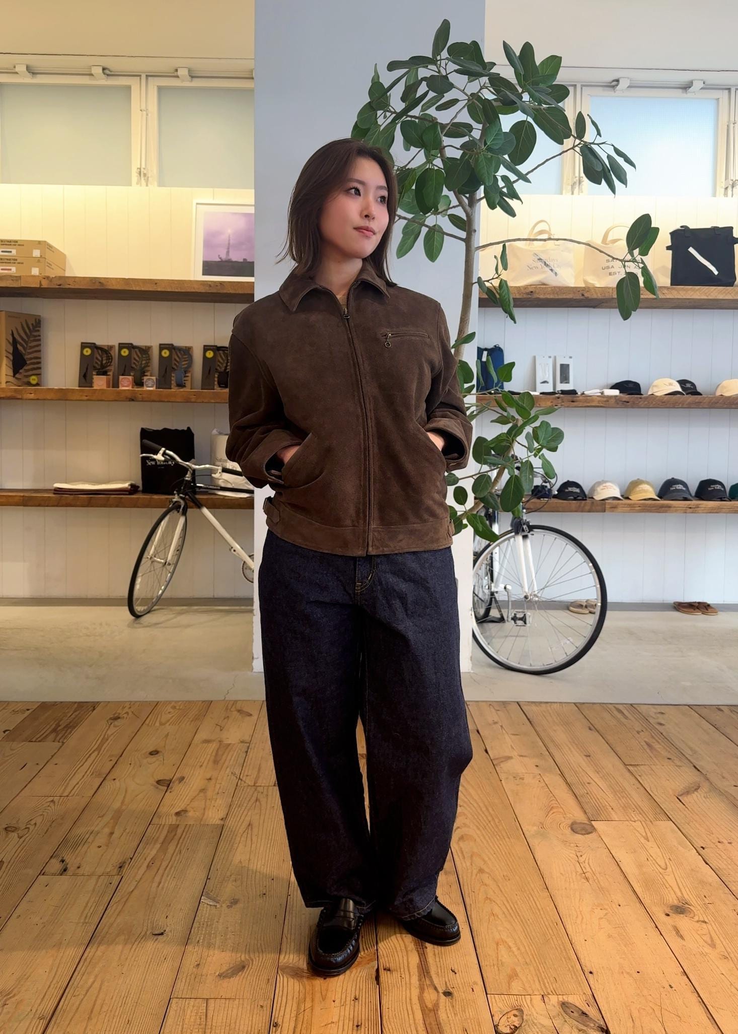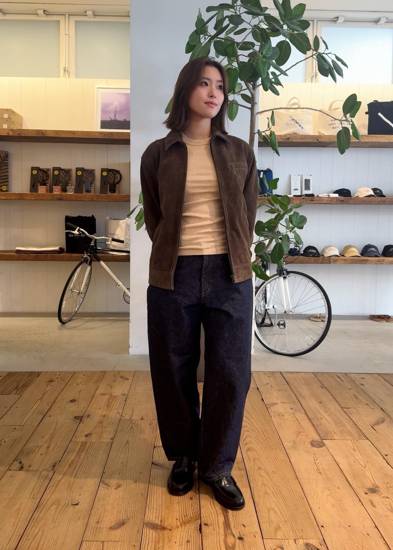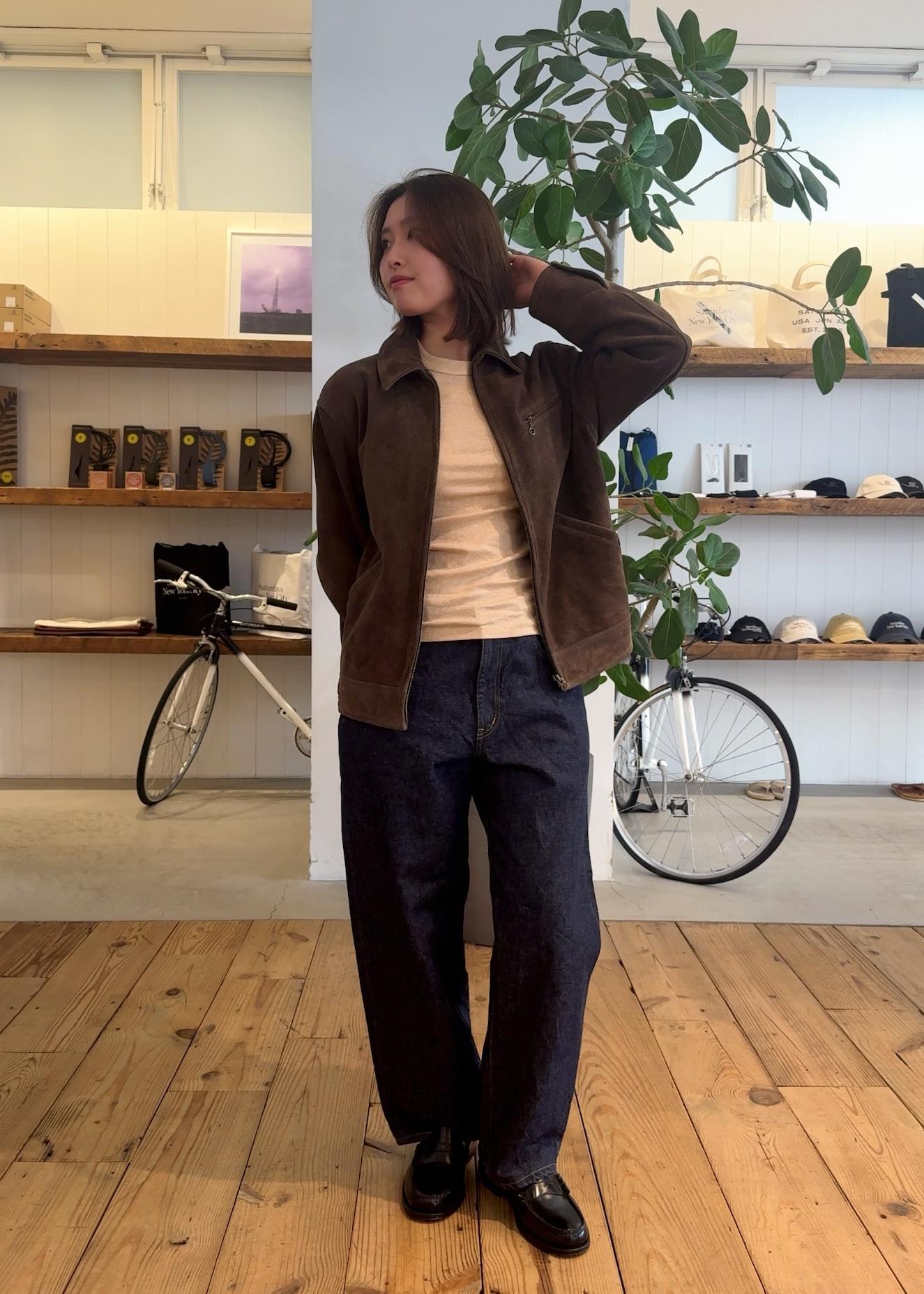 ヴィンテージのスポーツジャケットから着想を得たスエードレザーブルゾンに程よいゆとりのあるシルエットが、ポイントのコーデ。しなやかなスエードの質感、品を感じさせる一着です。着込むほどに味わいが増し、自分だけの表情へと育っていきます◎