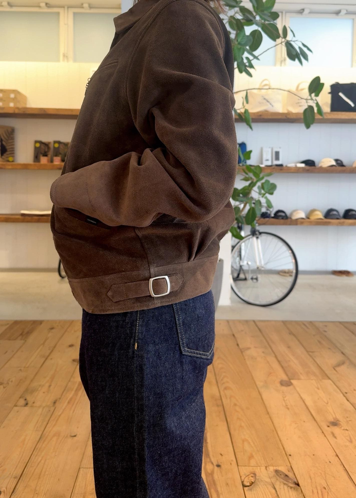 トレンドに左右されないタイムレスなデザインで、後ろのウエストベルト部分にはサタデーズのレザーパッチが付いているのもポイントです◎