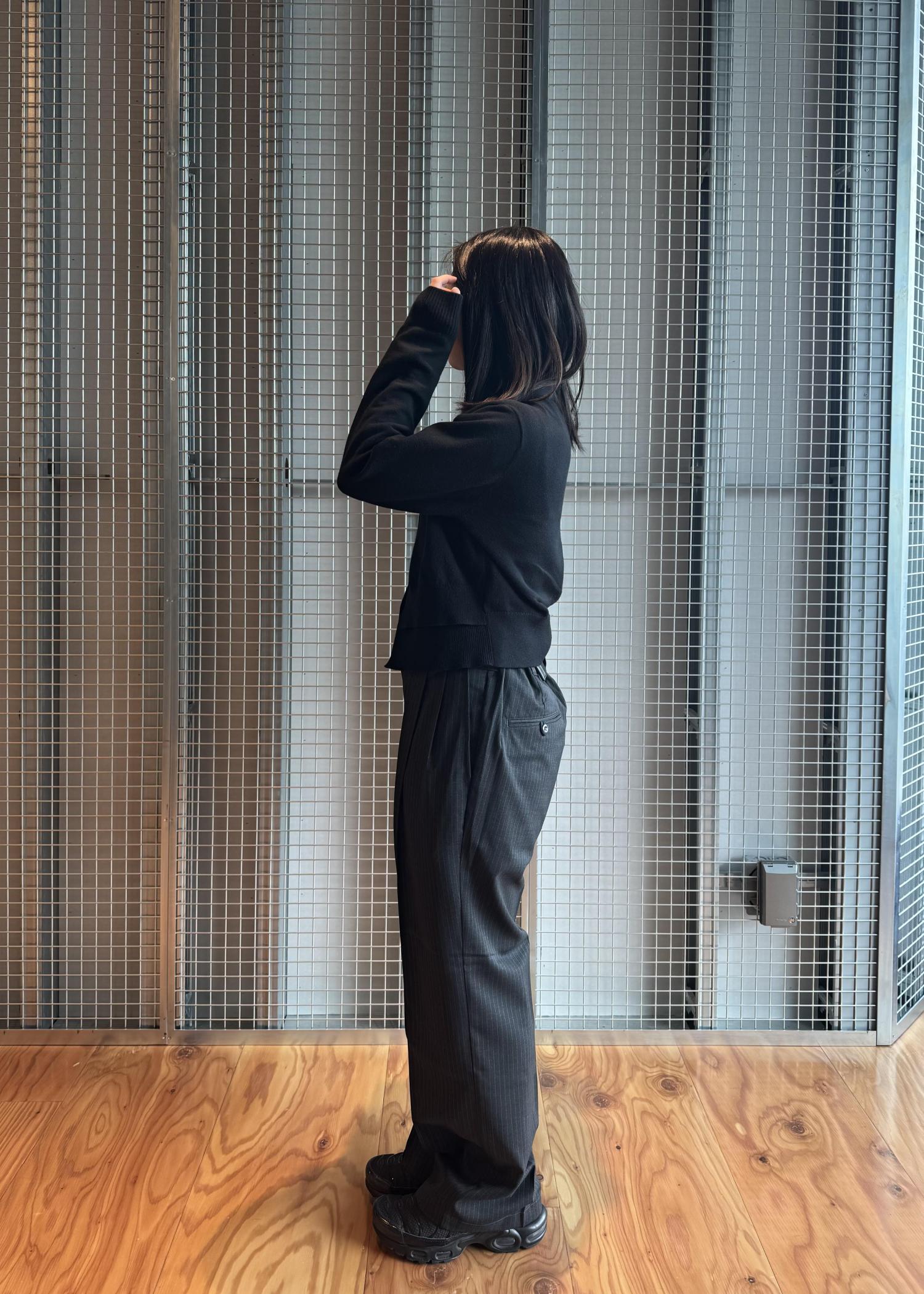 程よく落ち感のある生地とストライプがラインを強調してくれるスラックスです。