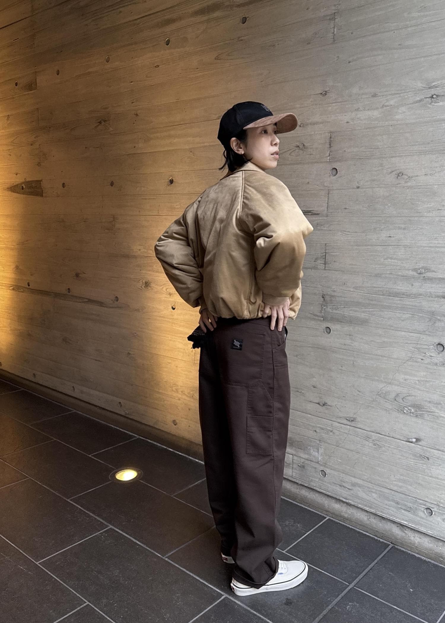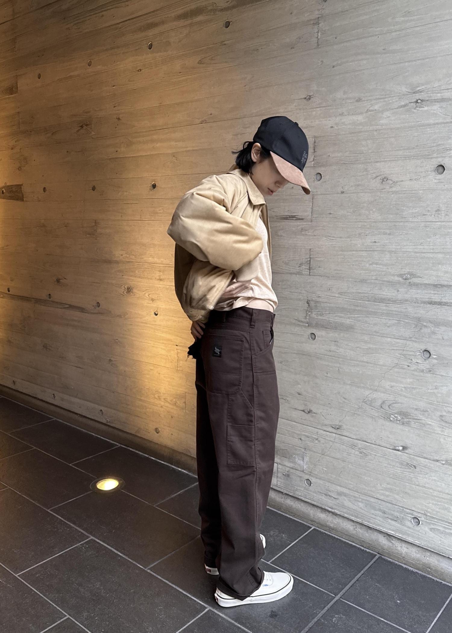 ブラウンカラーのパンツにベージュトップスはまとまりがある大人な雰囲気になりおすすめです。