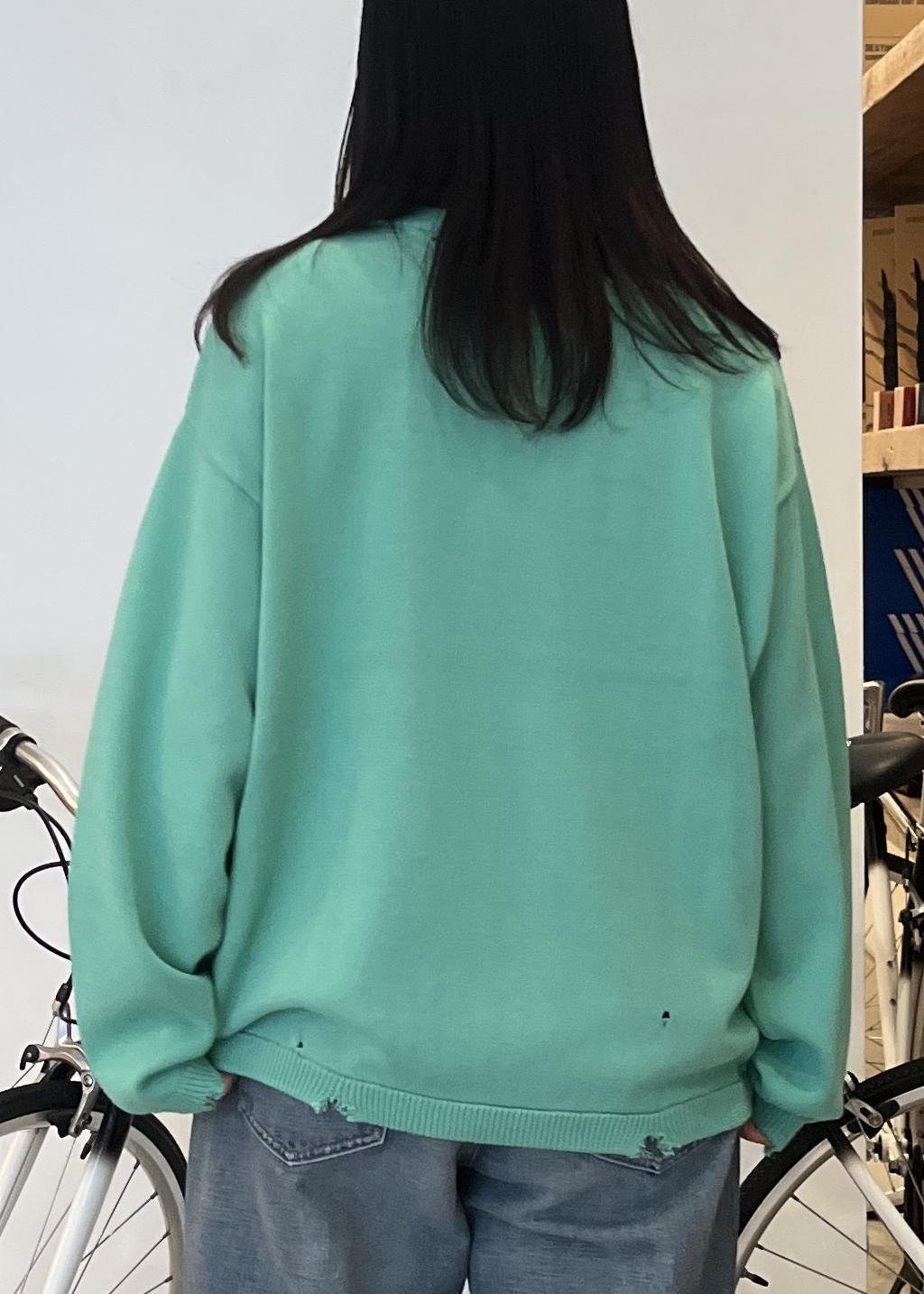リブの破れ加工と、身頃の虫食い風の編地もポイントになっており、ゆとりのあるざっくりとしたサイジングのデザインです。 -