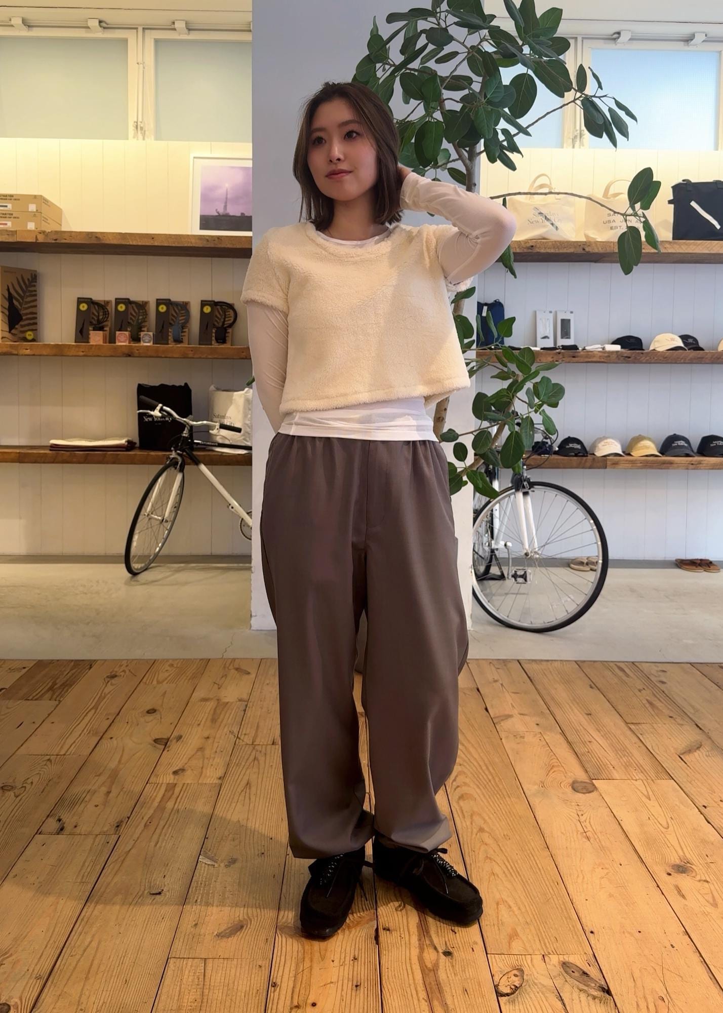 ショート丈トップスとワイドシルエットのバランスが、リラックス感と上品さを両立します。