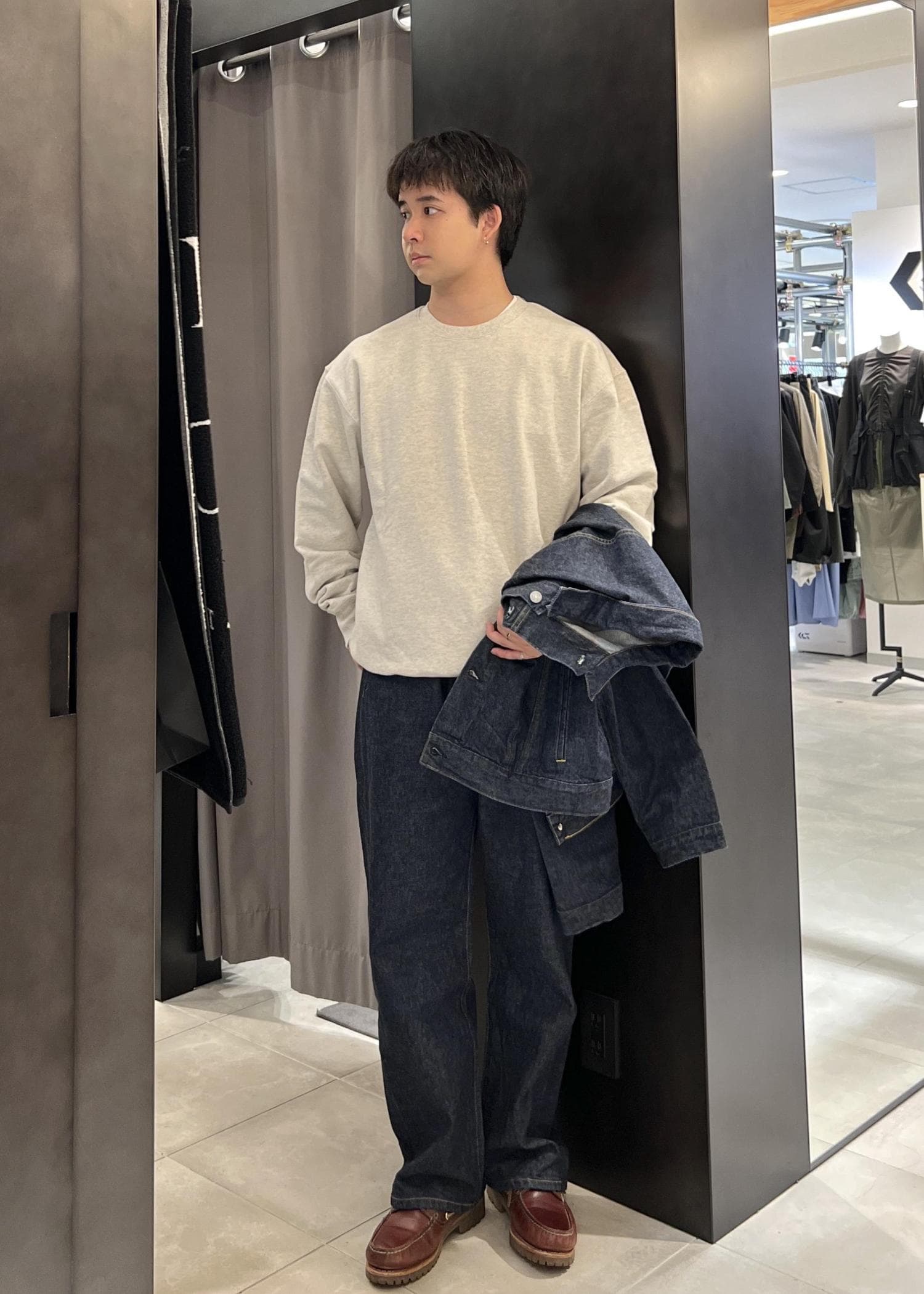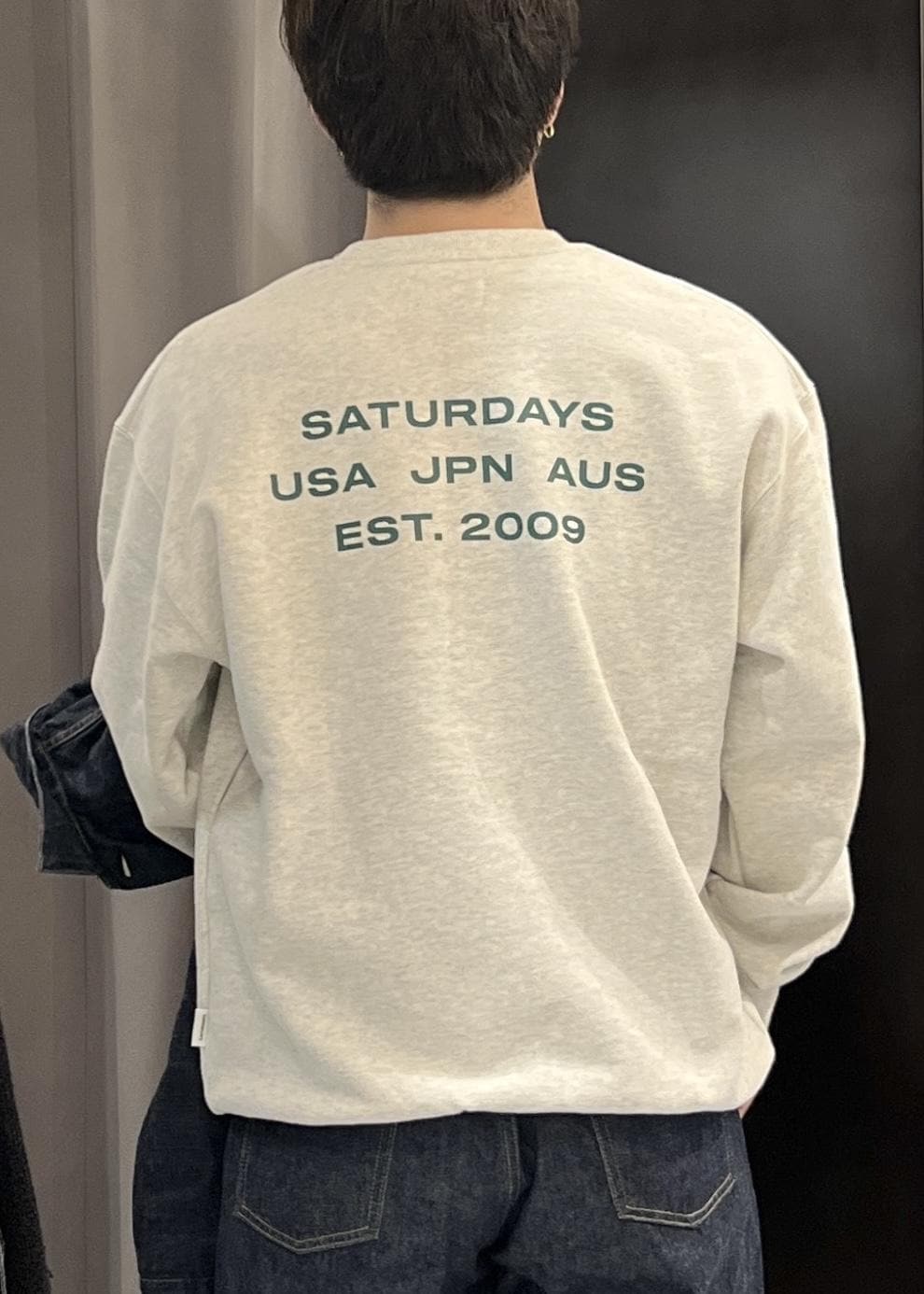 今回着用しておりますのは、Saturdays NYC定番のインターナショナルロゴプリントをバックに配したクルーネックスウェットです!