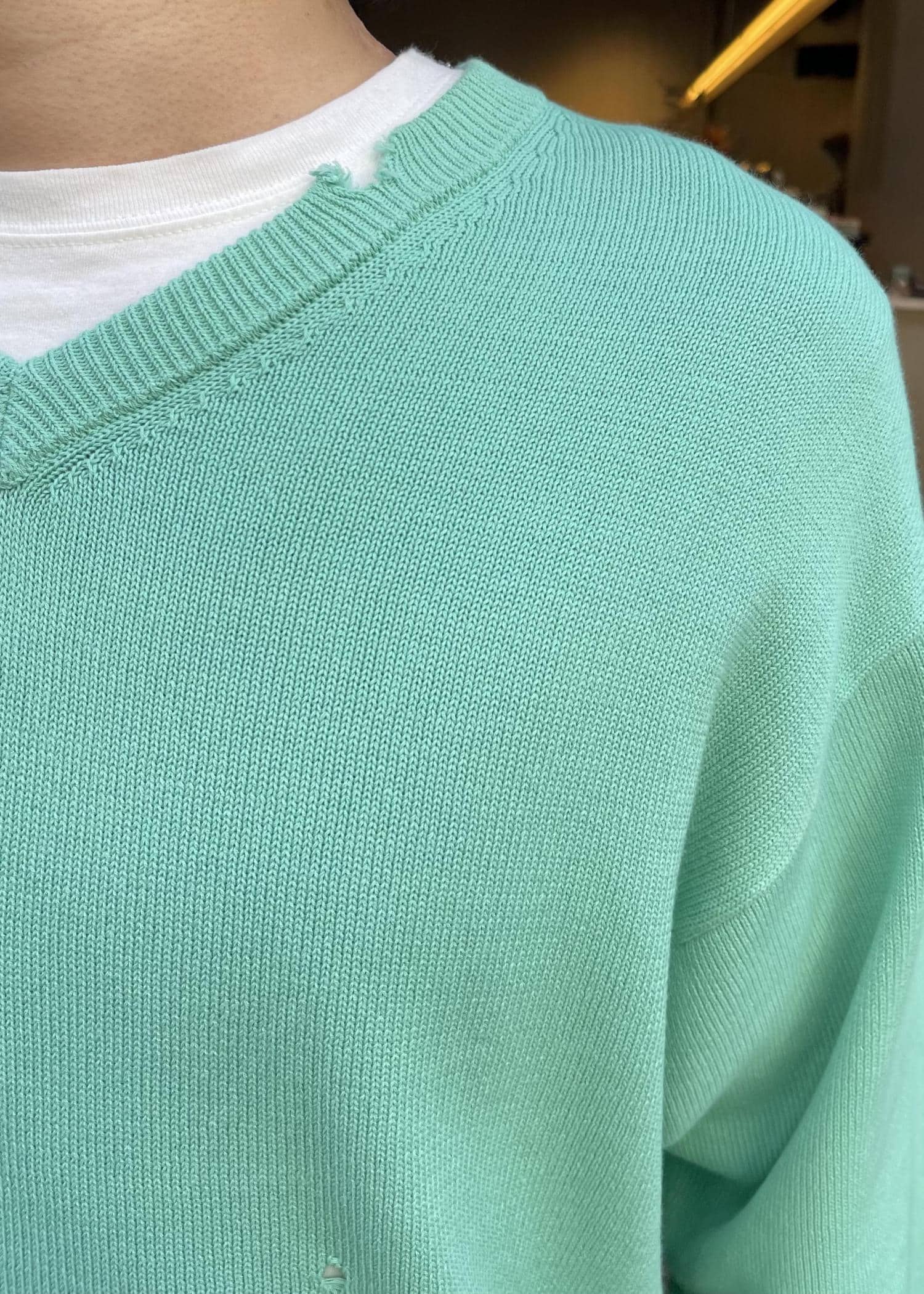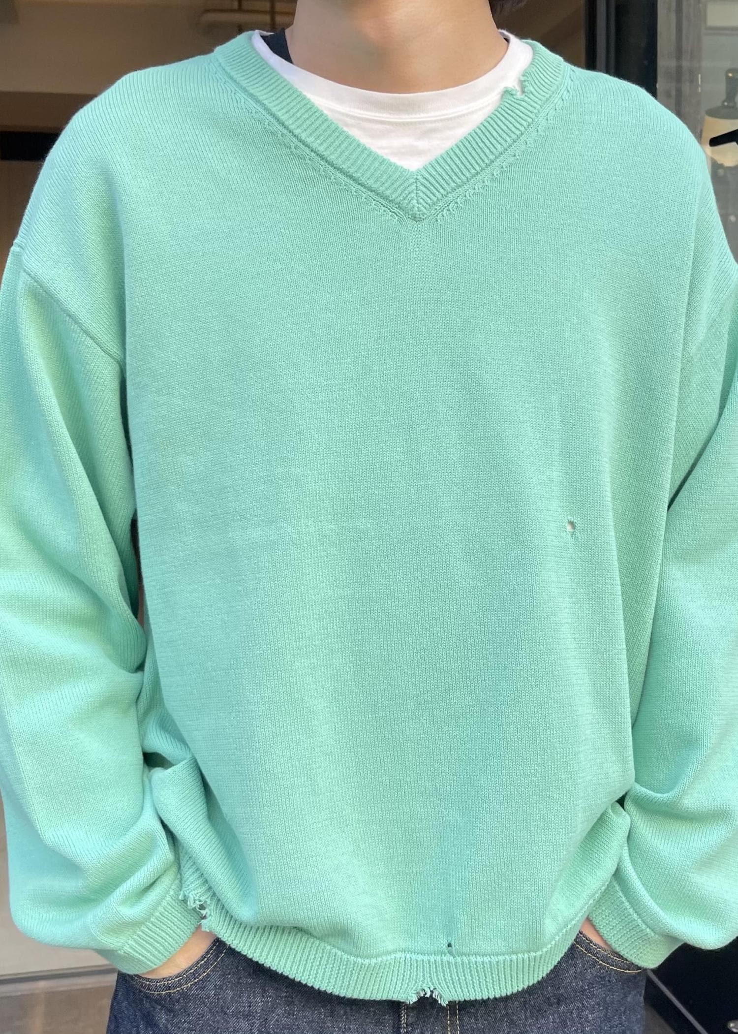 ダメージ加工を施したゆとりのあるシルエットが特徴のVネックセーター、今回はターコイズカラーを使ってみました!