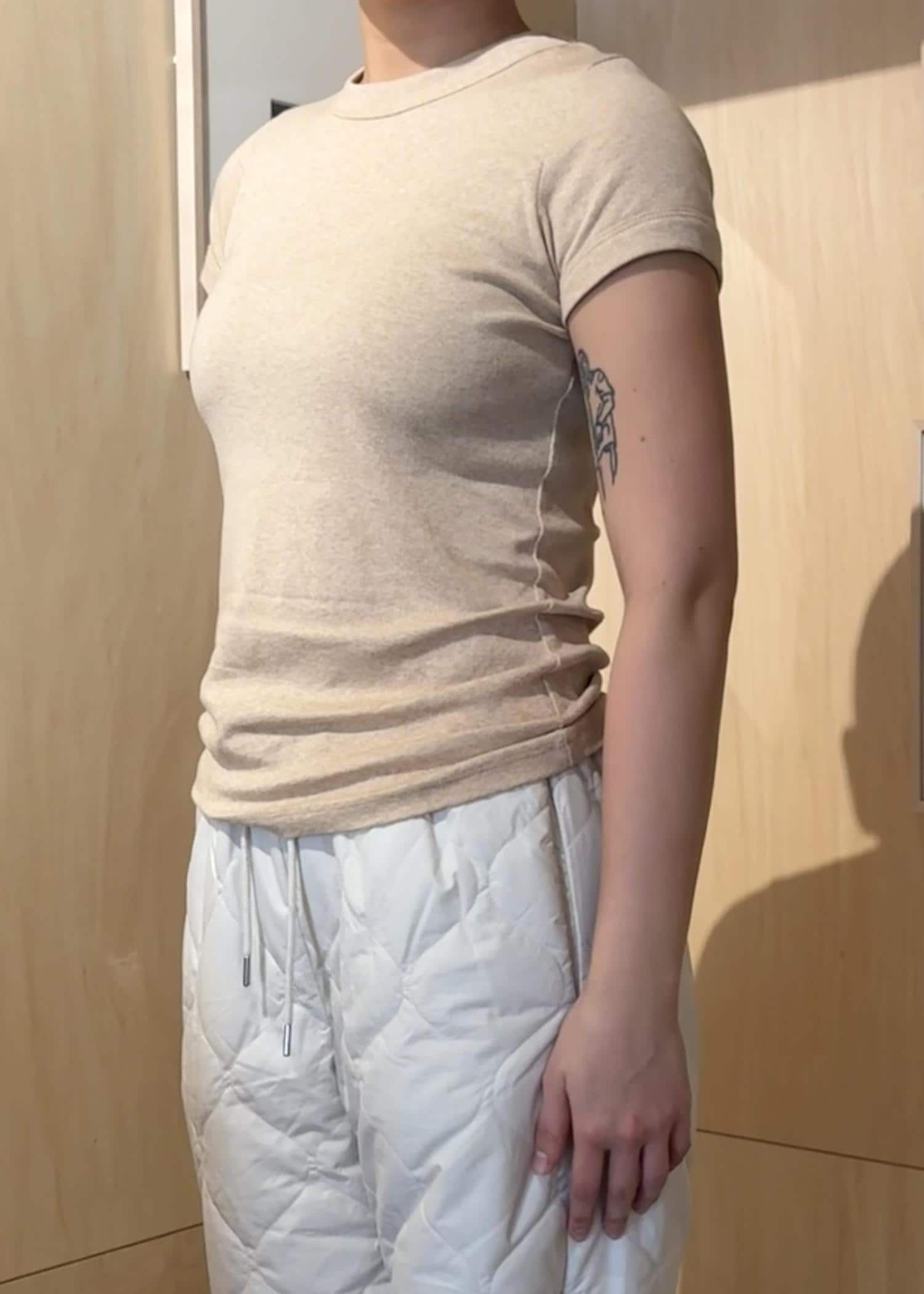 Saturdays NYCNaomi Ribbed Tee | WOMENベージュ / M¥8,250レビューめのクルーネックと太めの衿幅がポイント。オーガニック綿の自然な風合いが特徴で、ブラウンカラーは無染色をそのまま生かしたカラーです。