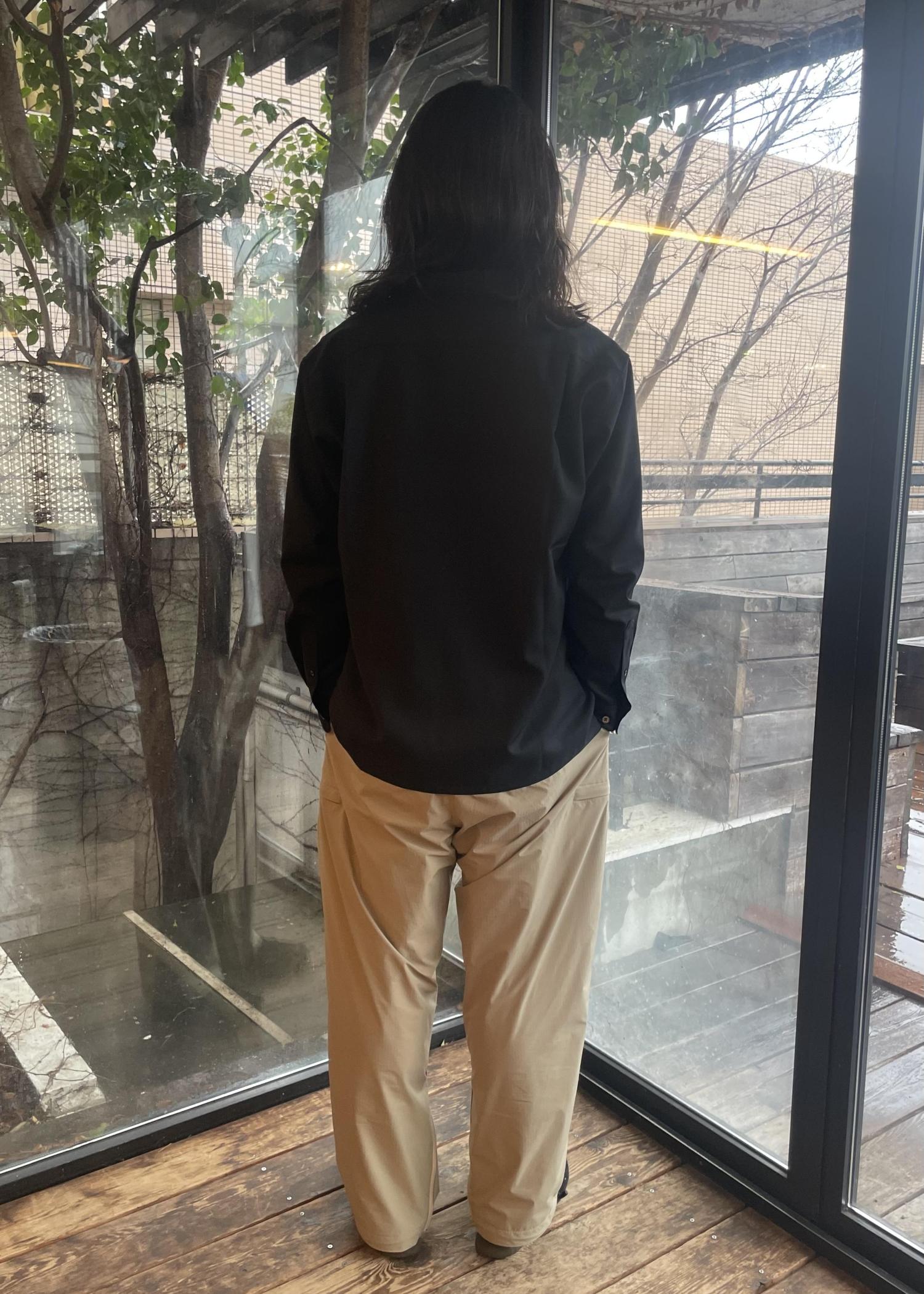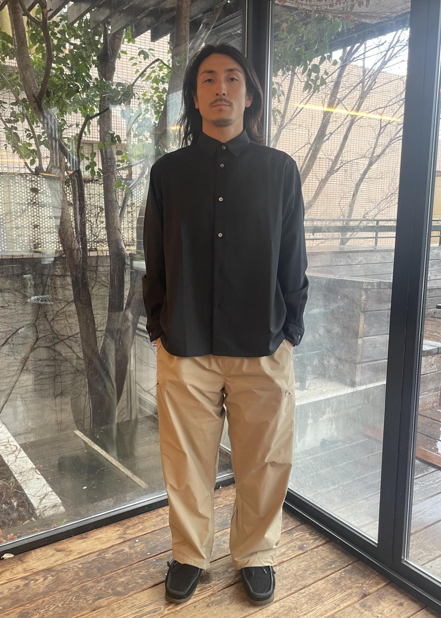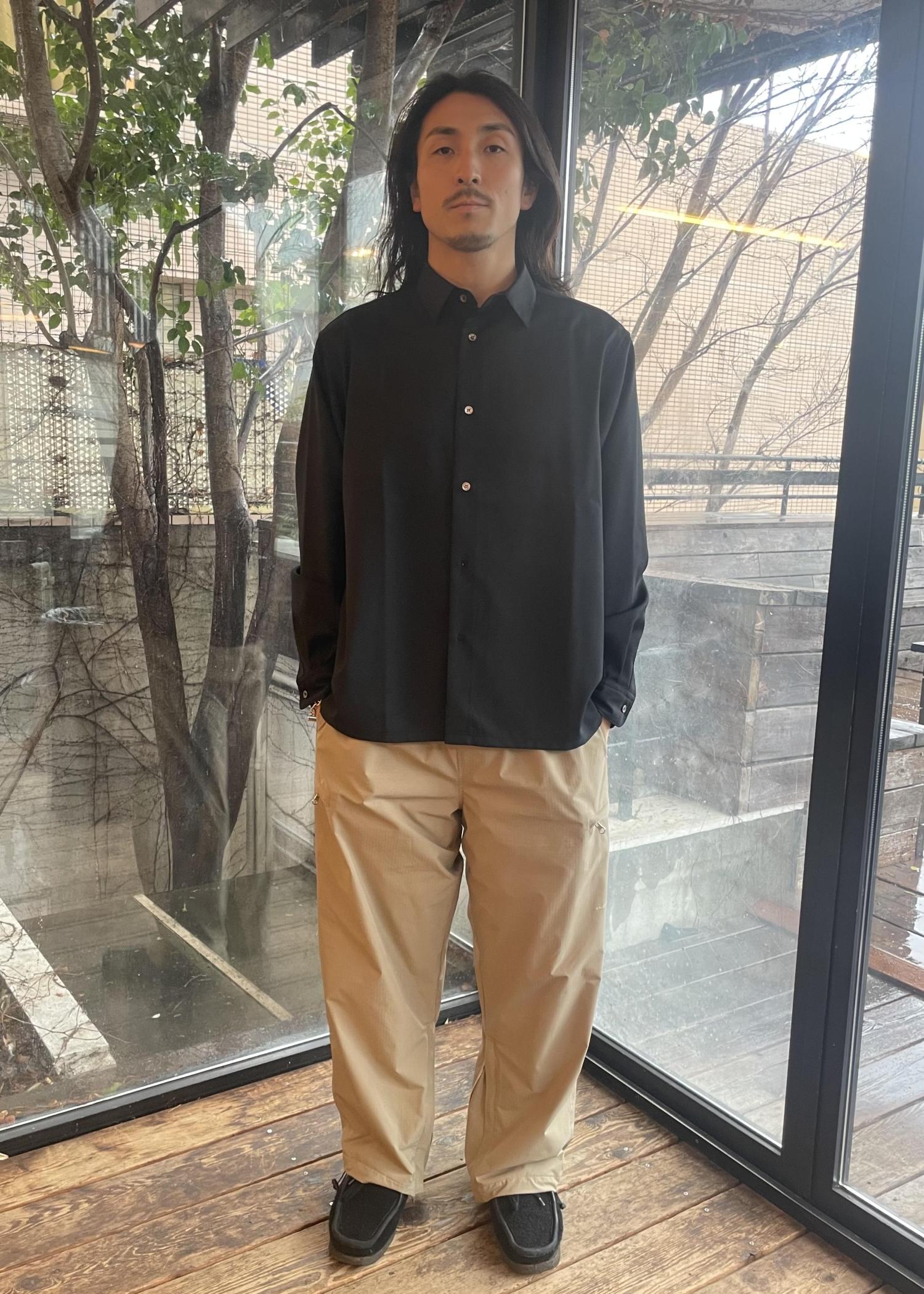 シャツは、色もブラックとグレーがあり、どちらもマット感がある色合いなので、スタイリングに合わせやすい一品です!
