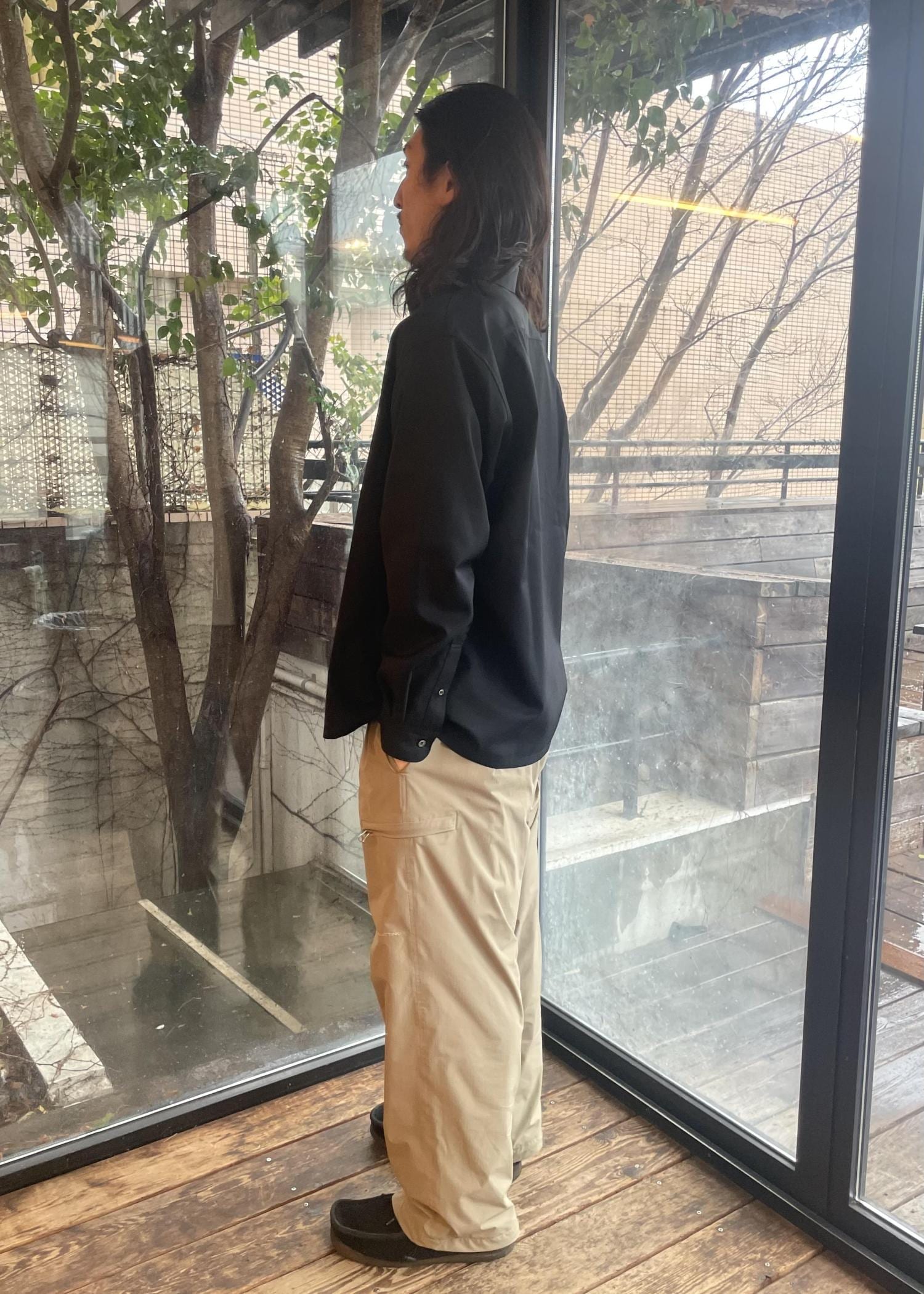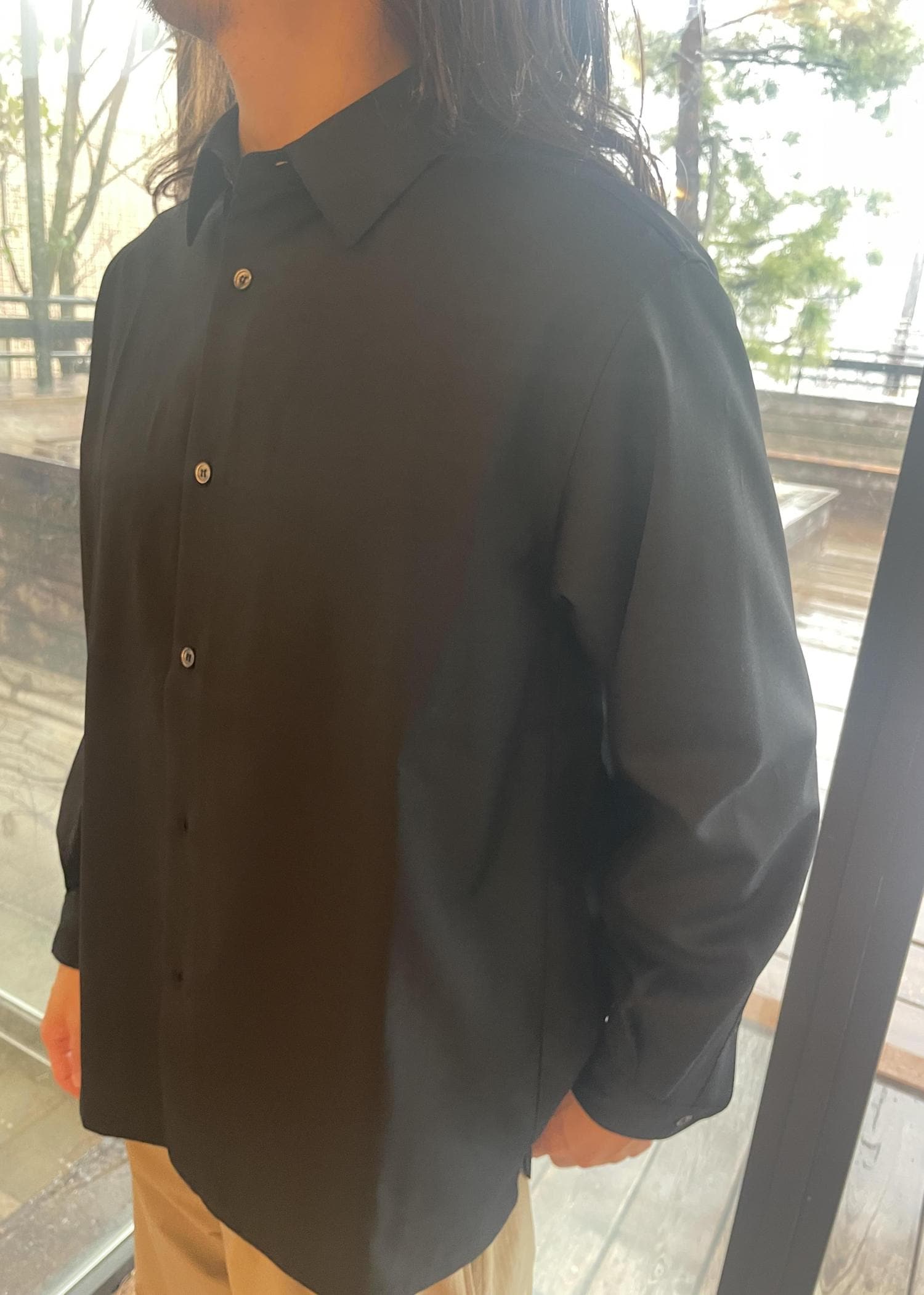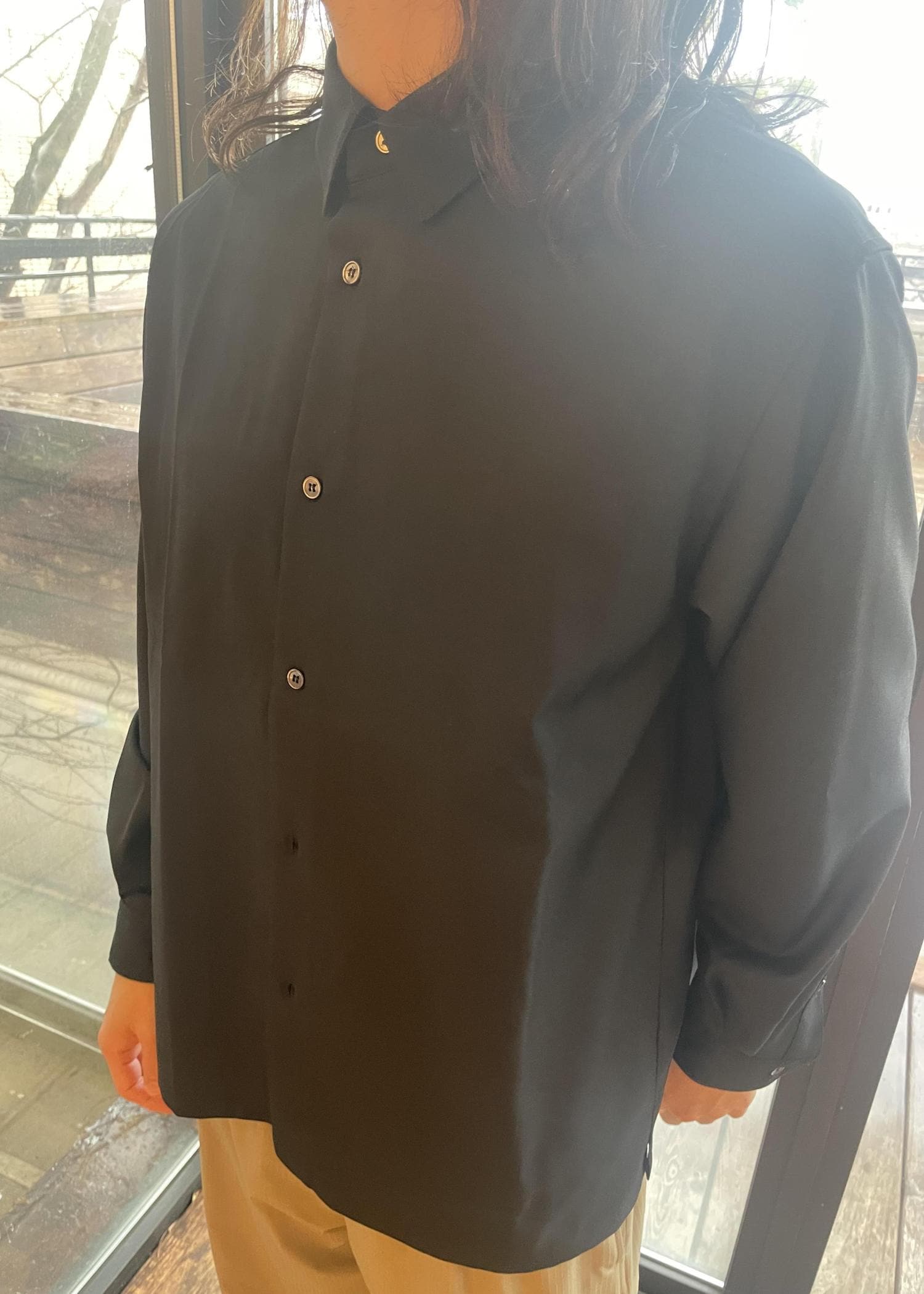 シャツは、色もブラックとグレーがあり、どちらもマット感がある色合いなので、スタイリングに合わせやすい一品です!