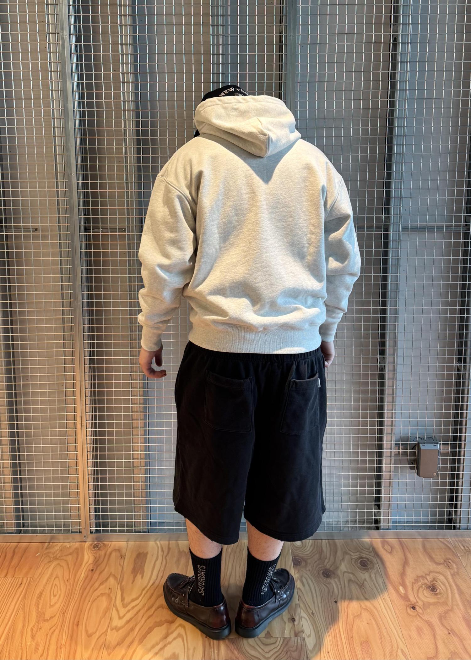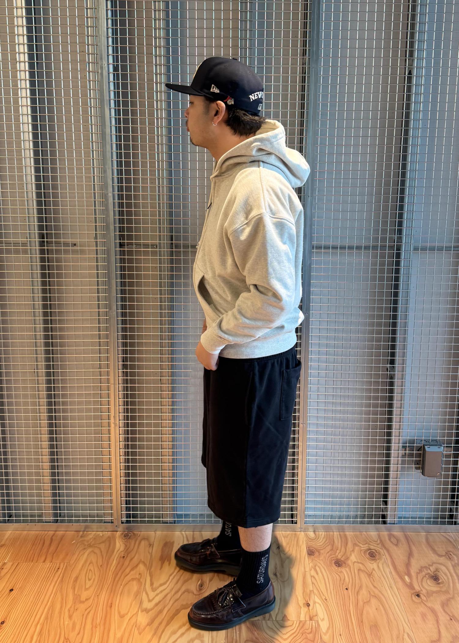サーマル裏地になっている肉厚生地のフーディーと、ヴィンテージ加工が特徴的なスウェット生地のショーツを使ったコーディネートです!