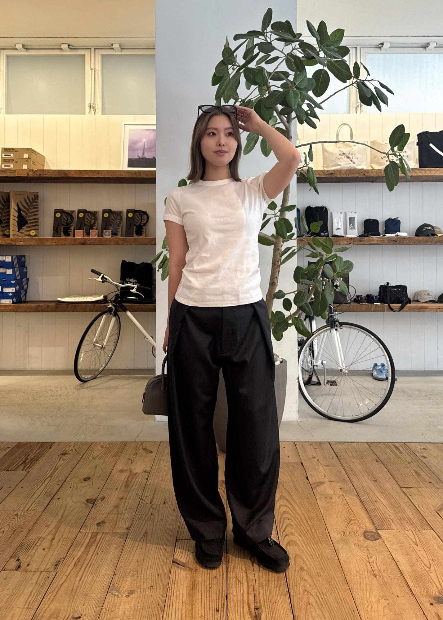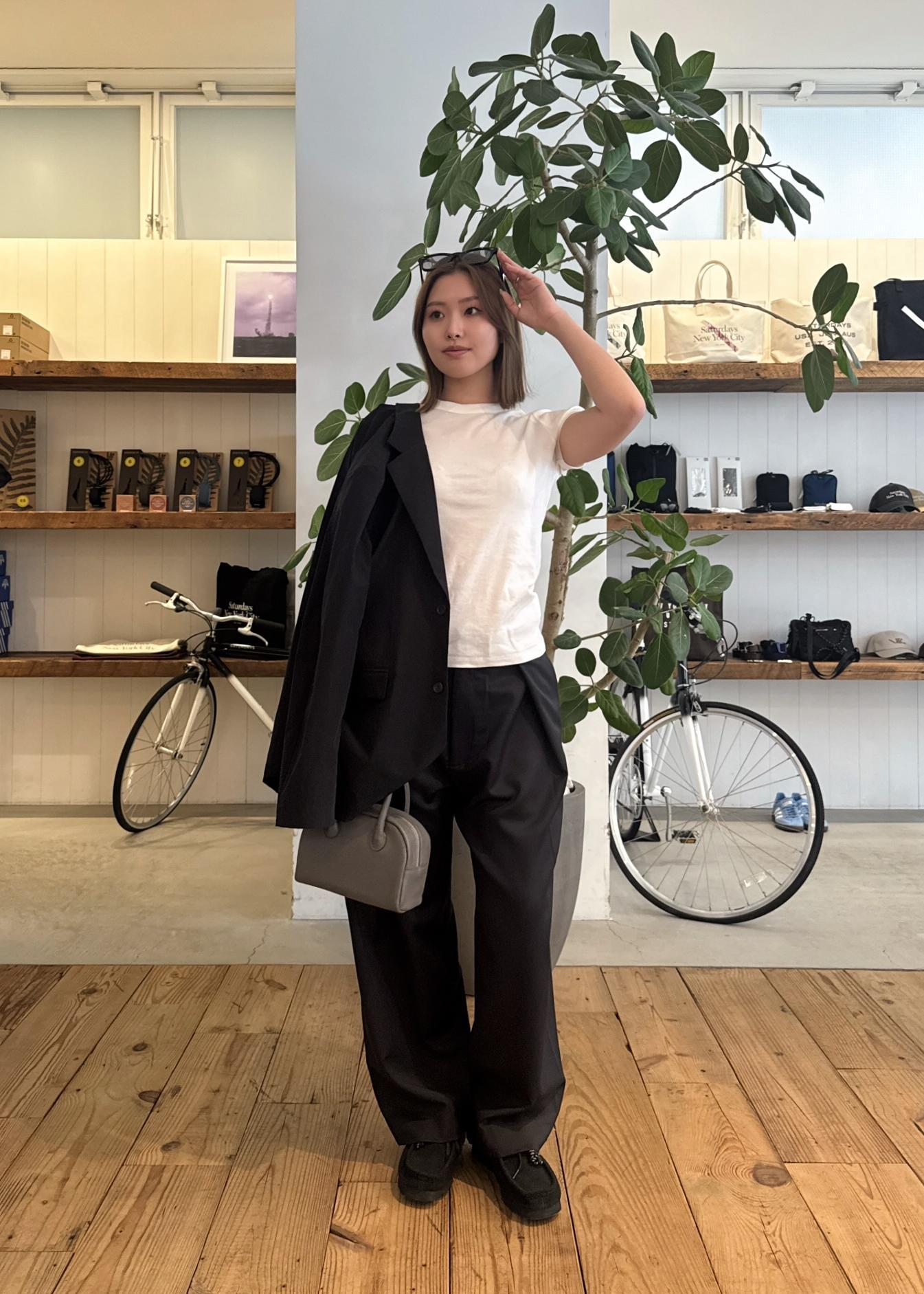 インナーにはオーガニックコットンTシャツを合わせ、柔らかなタッチとナチュラルな風合いで程よい抜け感をプラス。