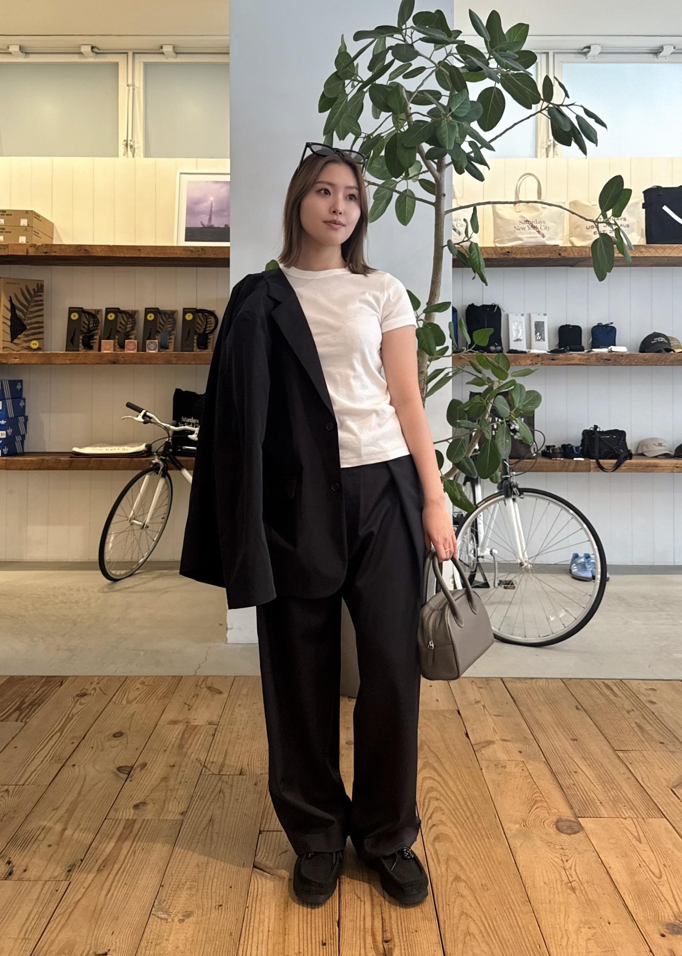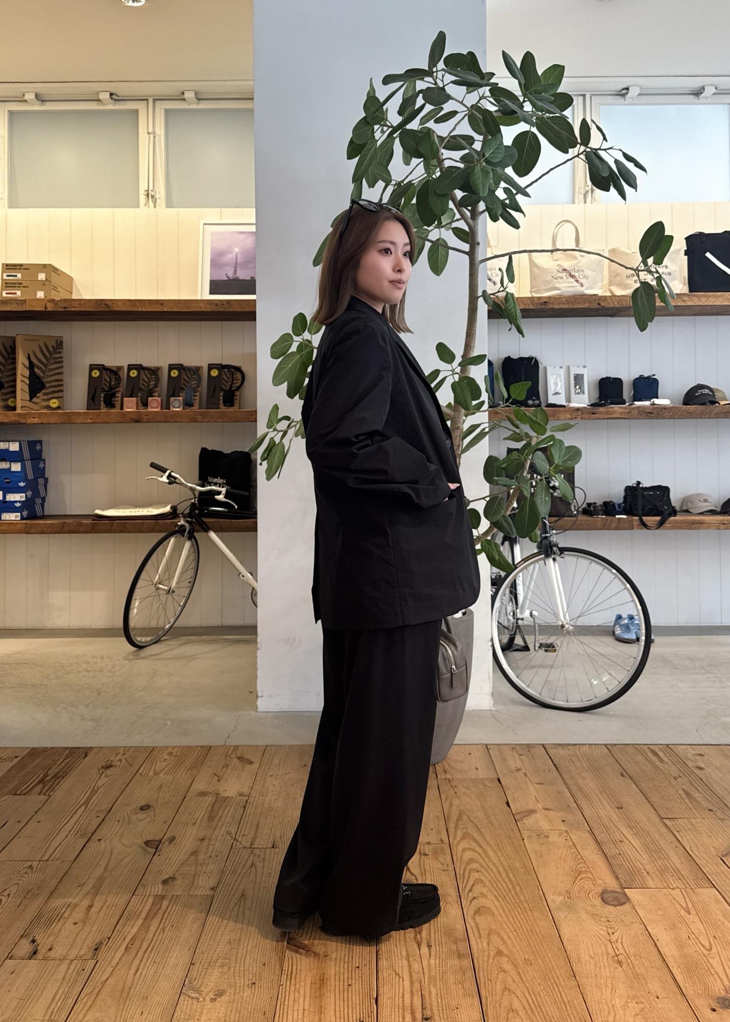 肩まわりはすっきりとしながらも、アームと身幅に程よくゆとりを持たせたジャケットに、落ち感のあるワイドスラックスを合わせたセットアップスタイル。