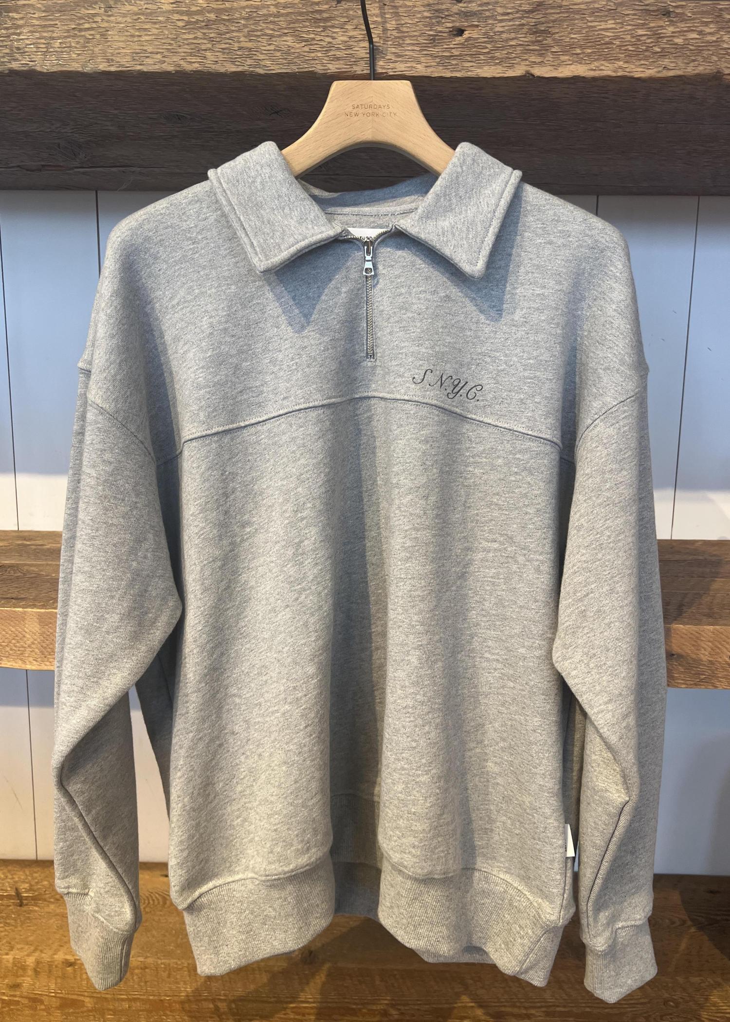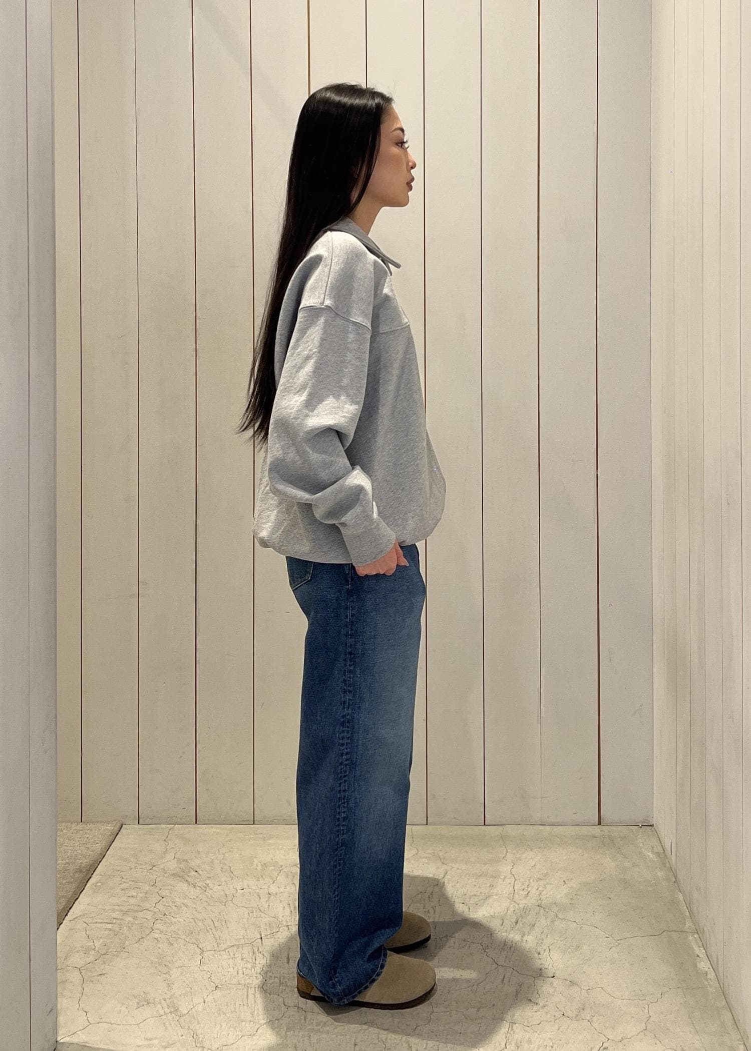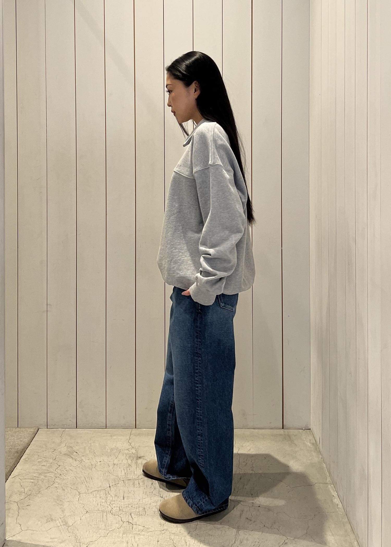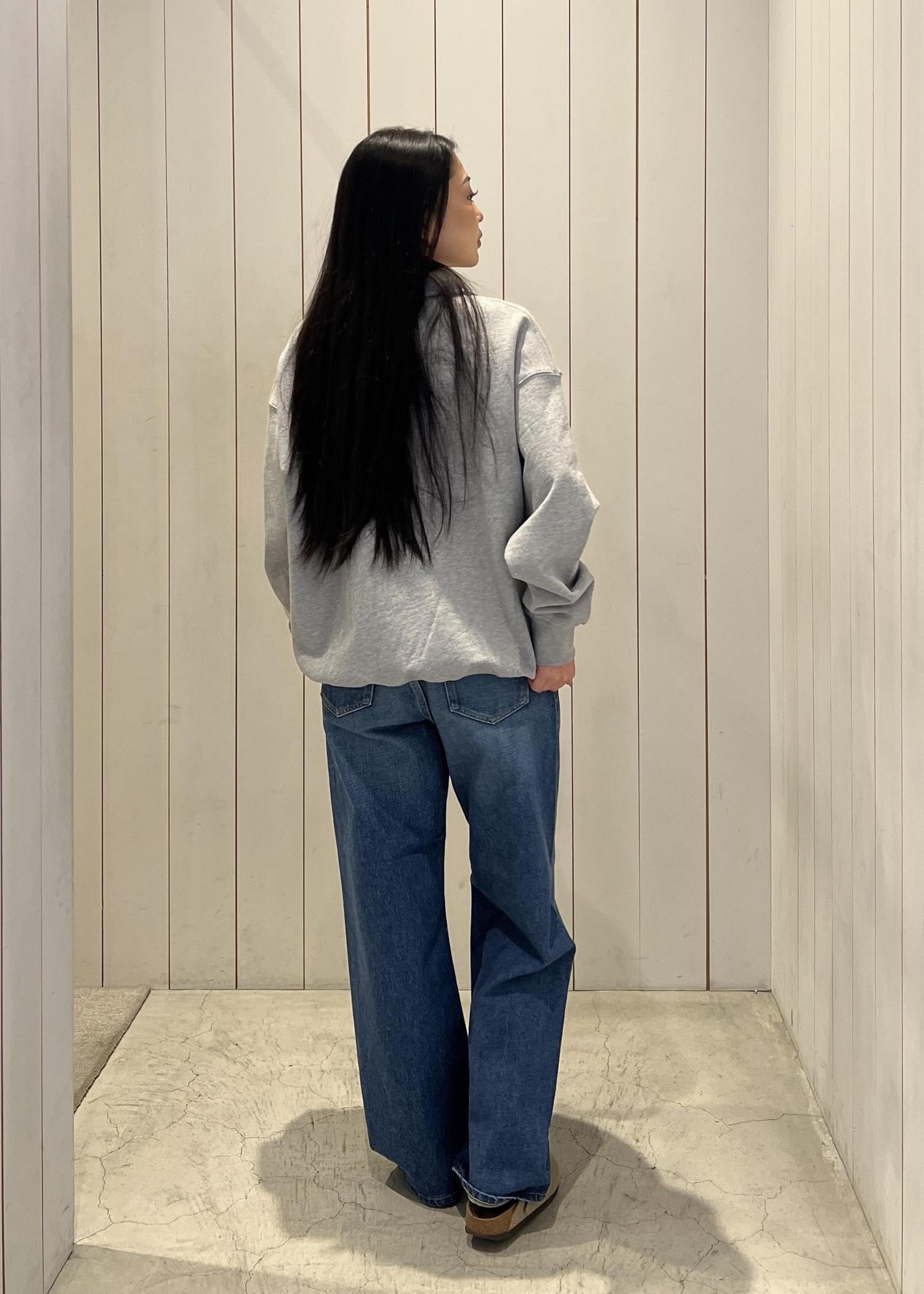 ハーフジップのスウェットにデニムを合わせたシンプルコーデ。 ゆるっとしたシルエットで抜け感を出しつつ、ラフすぎない大人カジュアルに⭐︎