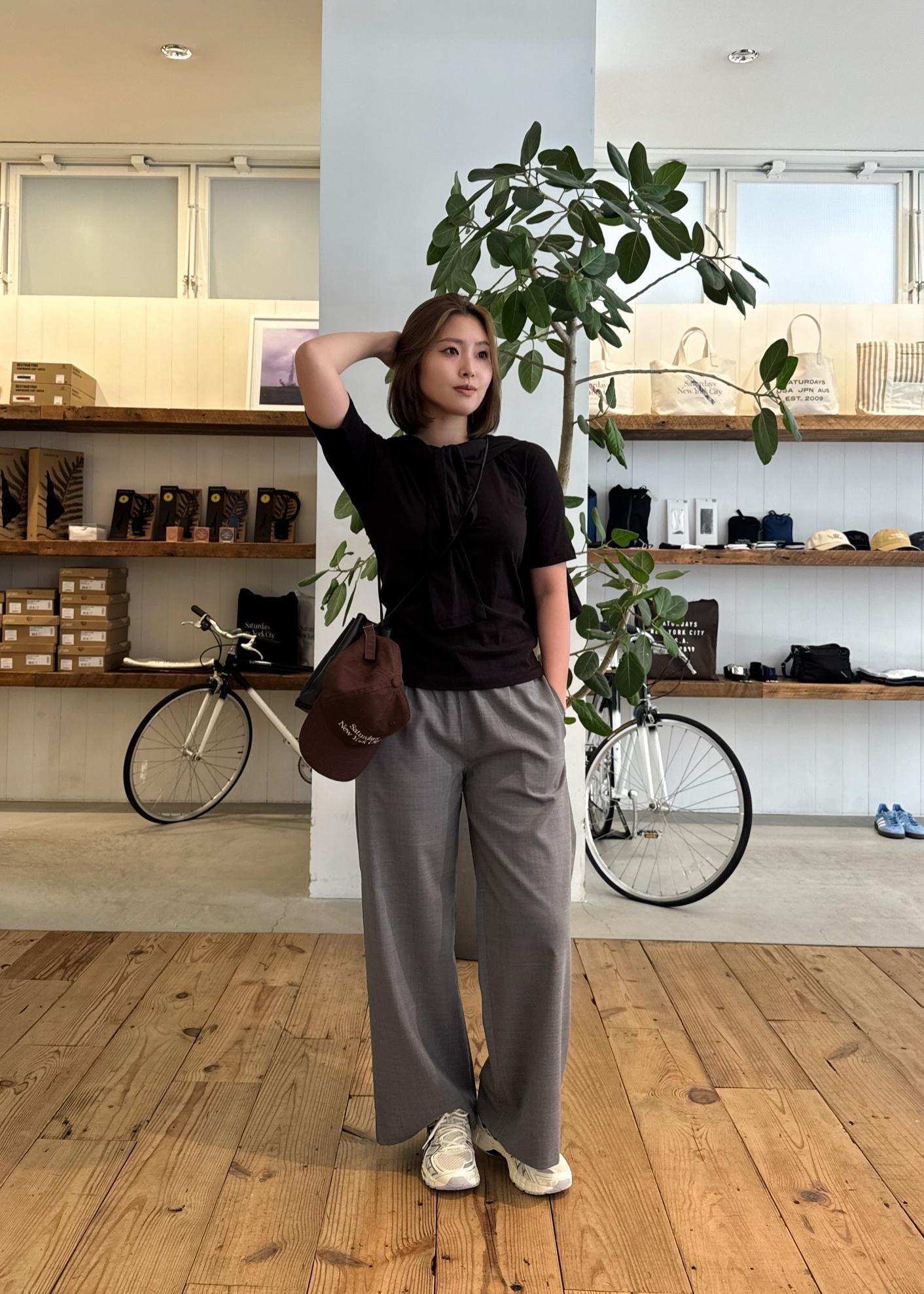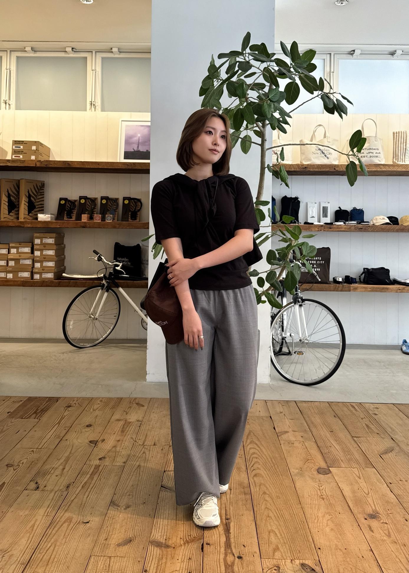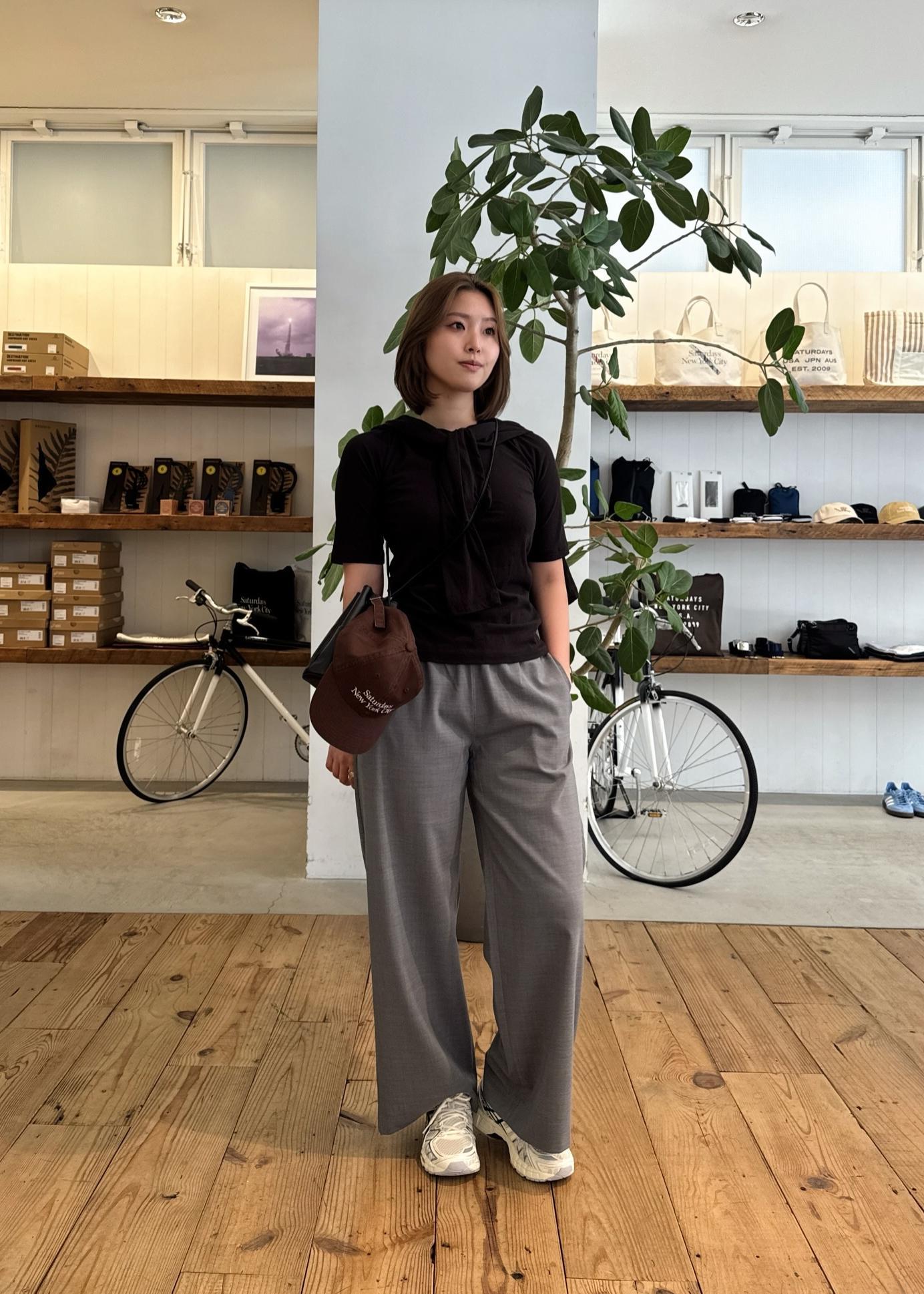 落ち感のあるパンツがシルエットを綺麗に見せつつ、Tシャツのレイヤードデザインがシンプルながらもこなれた印象に仕上げてくれます◎