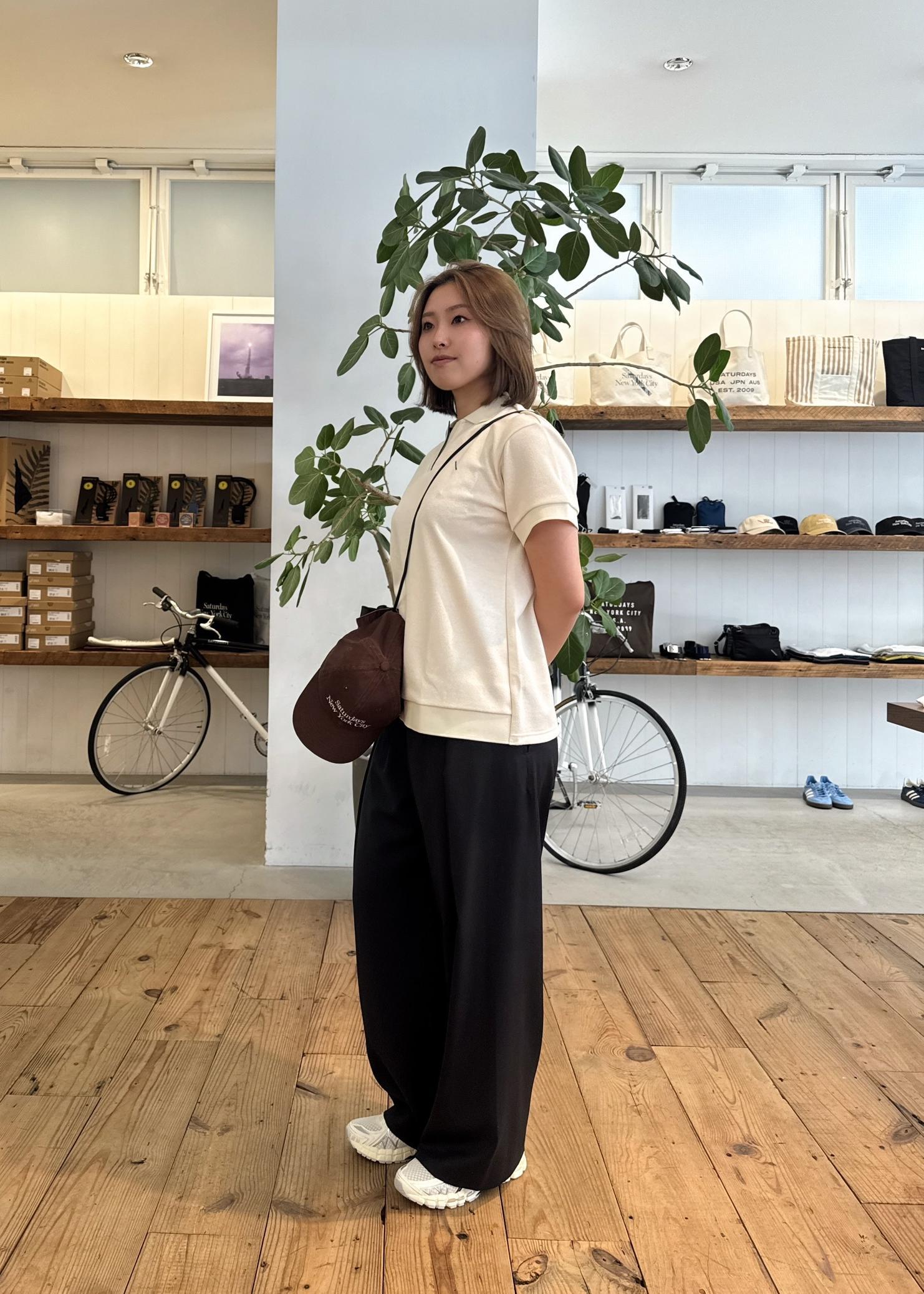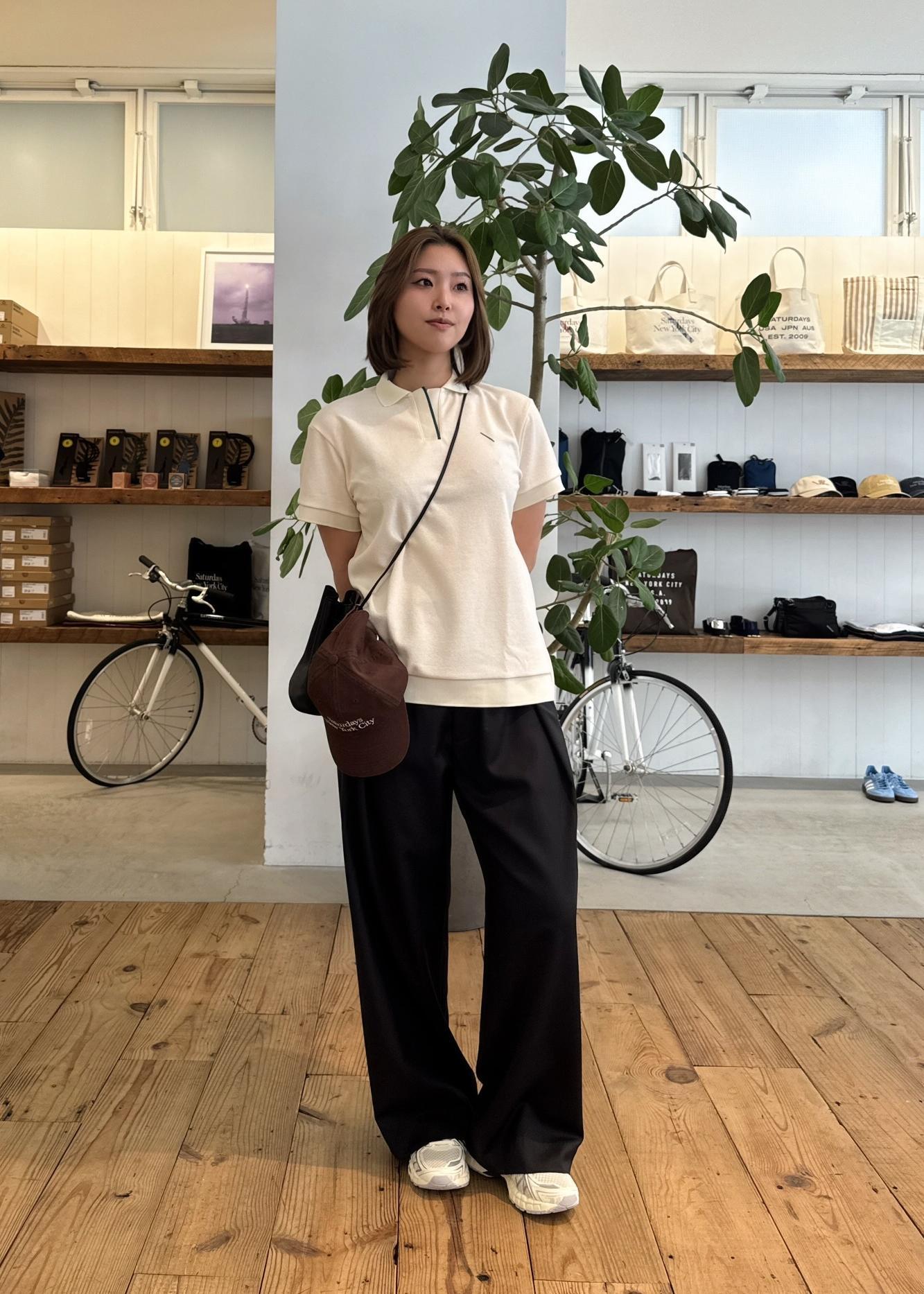 ゴルフのトップスを主役に、カジュアルへ落とし込んだミックススタイル。