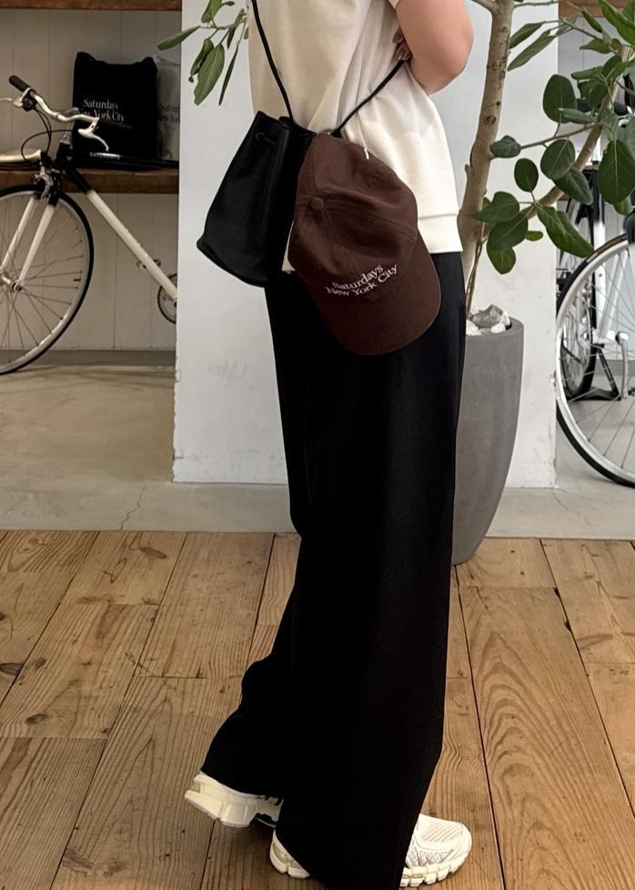 さらに、レザーの巾着バッグやキャップをプラスすることで、程よくカジュアルダウンしつつトレンド感もプラス!