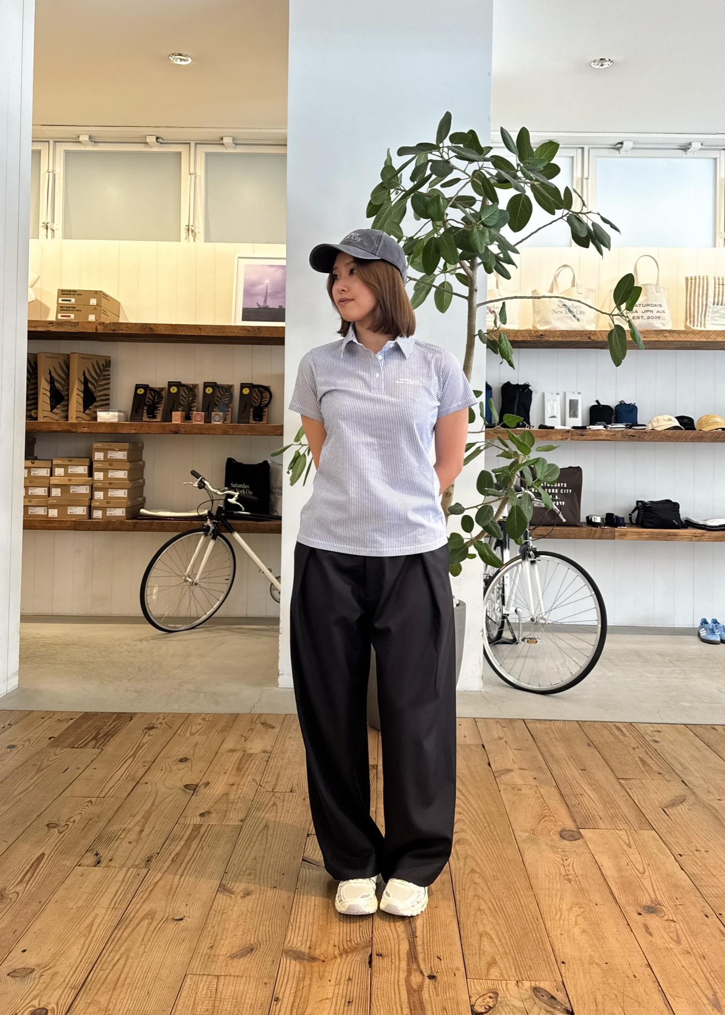 凹凸感のあるシアサッカー素材を使用し、通気性とストレッチ性に優れたトップスは、暑い季節でも快適な着心地を実現します。ゴルフならではの軽さと動きやすさを活かしながら、ワイドスラックスと合わせることで都会的で洗練された印象に仕上げています!
