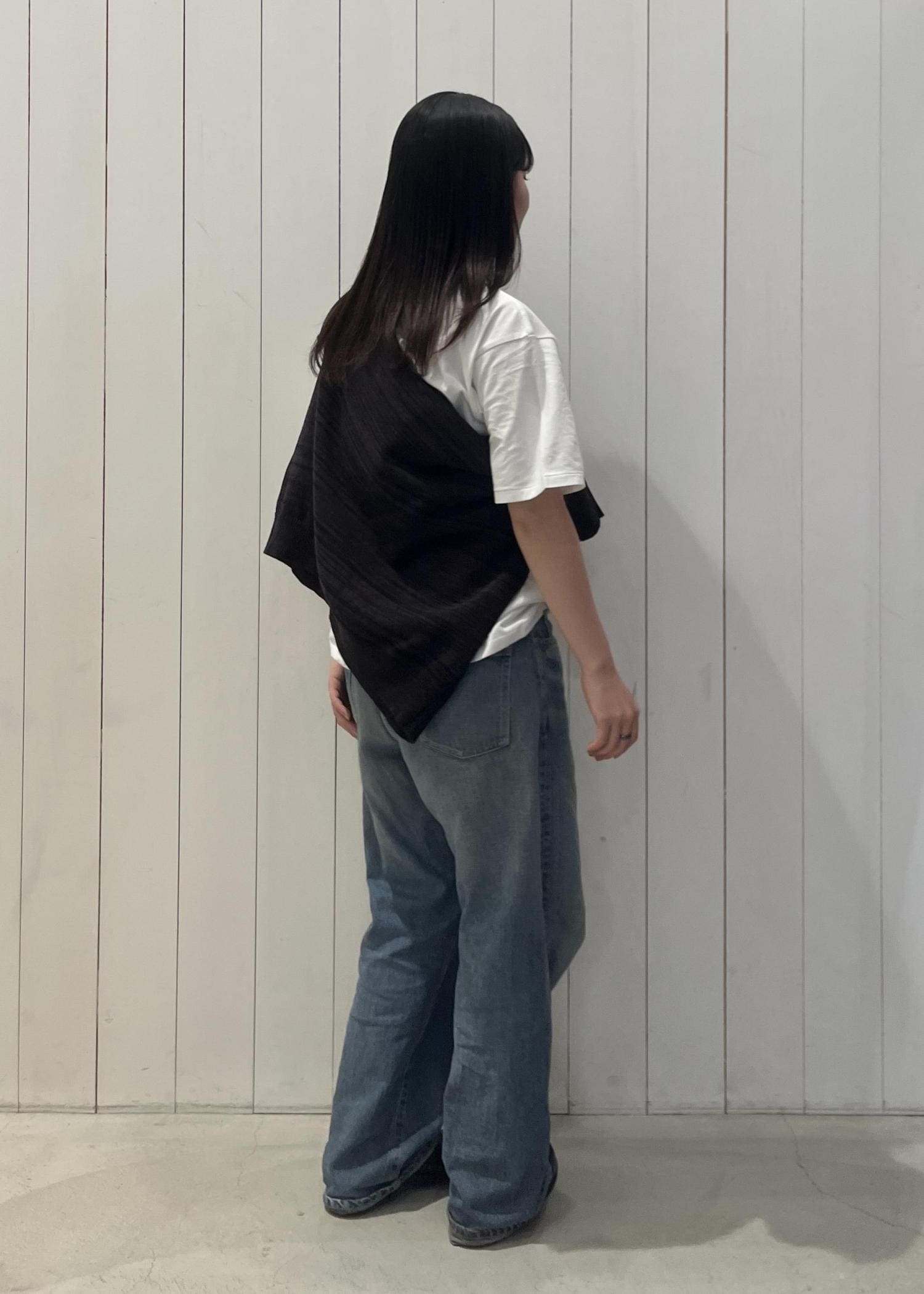 肌寒いときは上から着れるようニットを肩に巻いたスタイリング♪