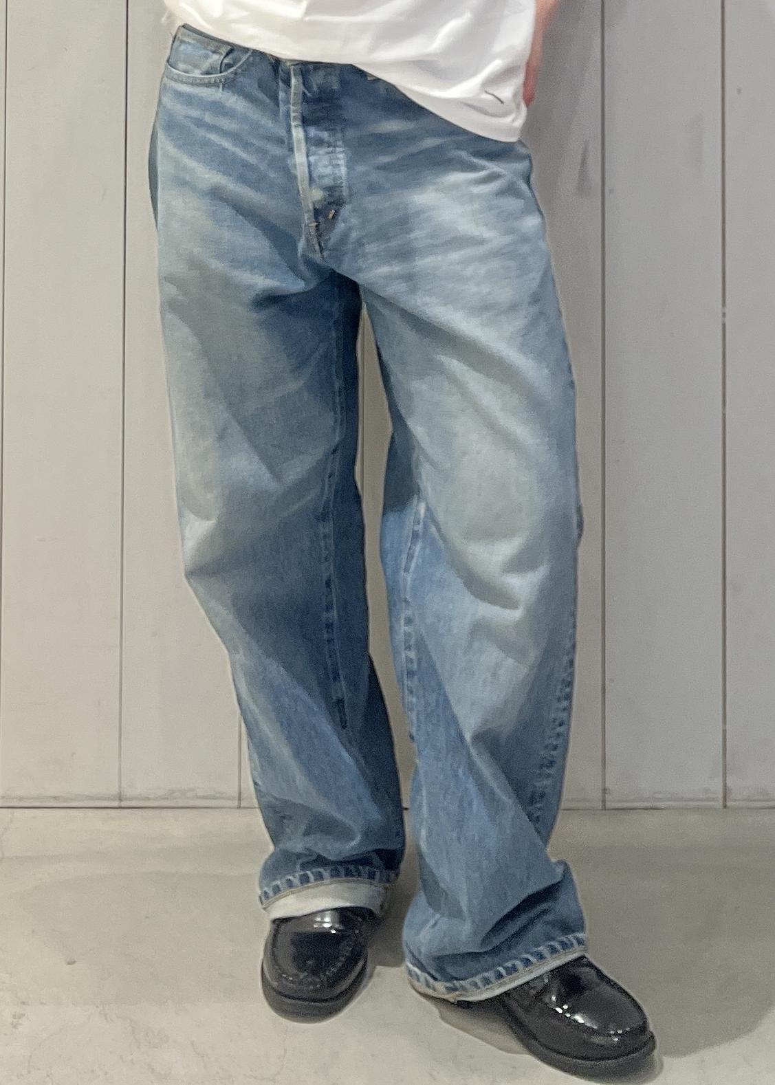 ワイドストレートのリラックスしたサイズ感ではあるものの絶妙な丈感と加工が大人のデザインになっています。
