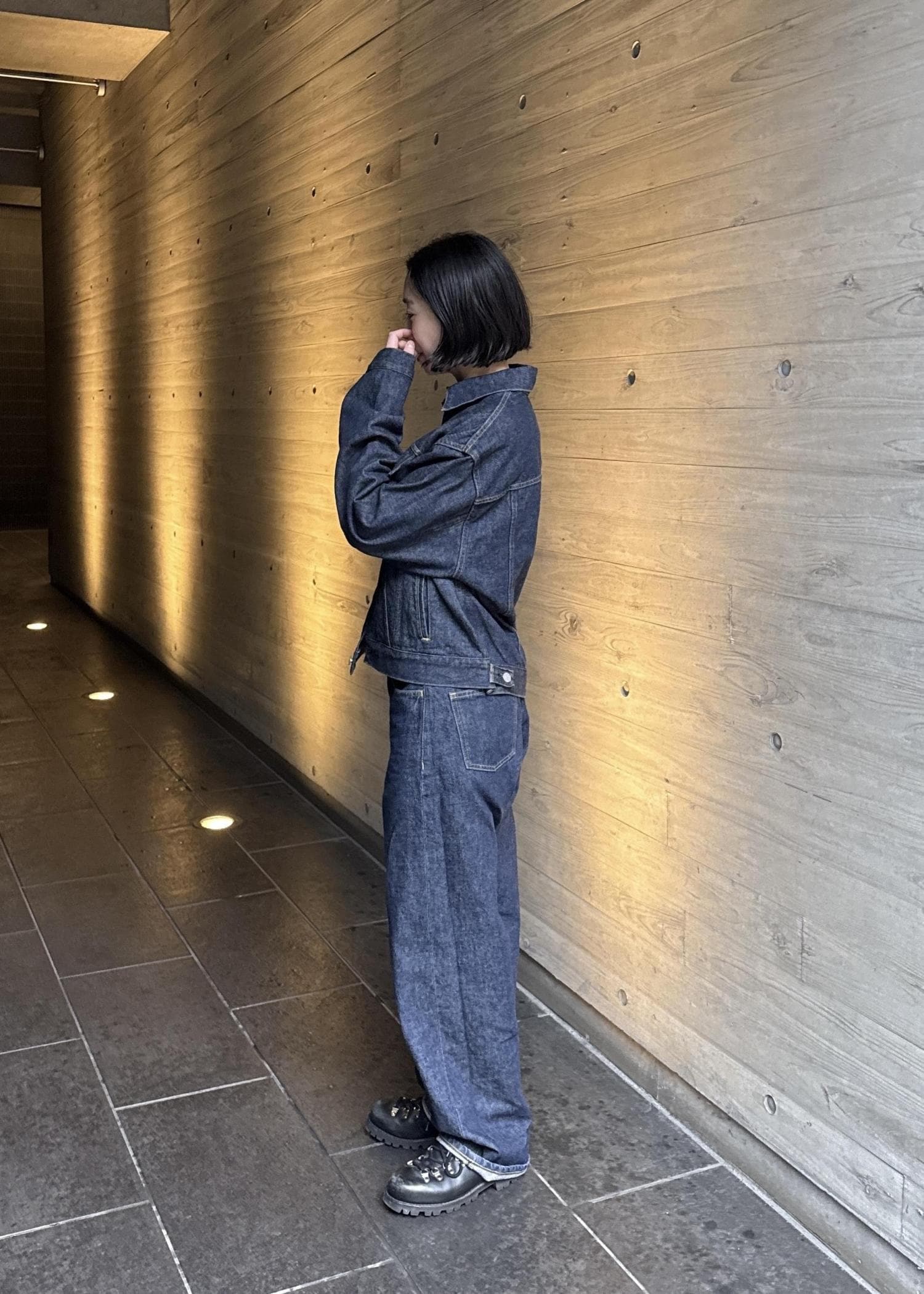 ショート丈のジャケットと合わせてセットアップスタイルに。
