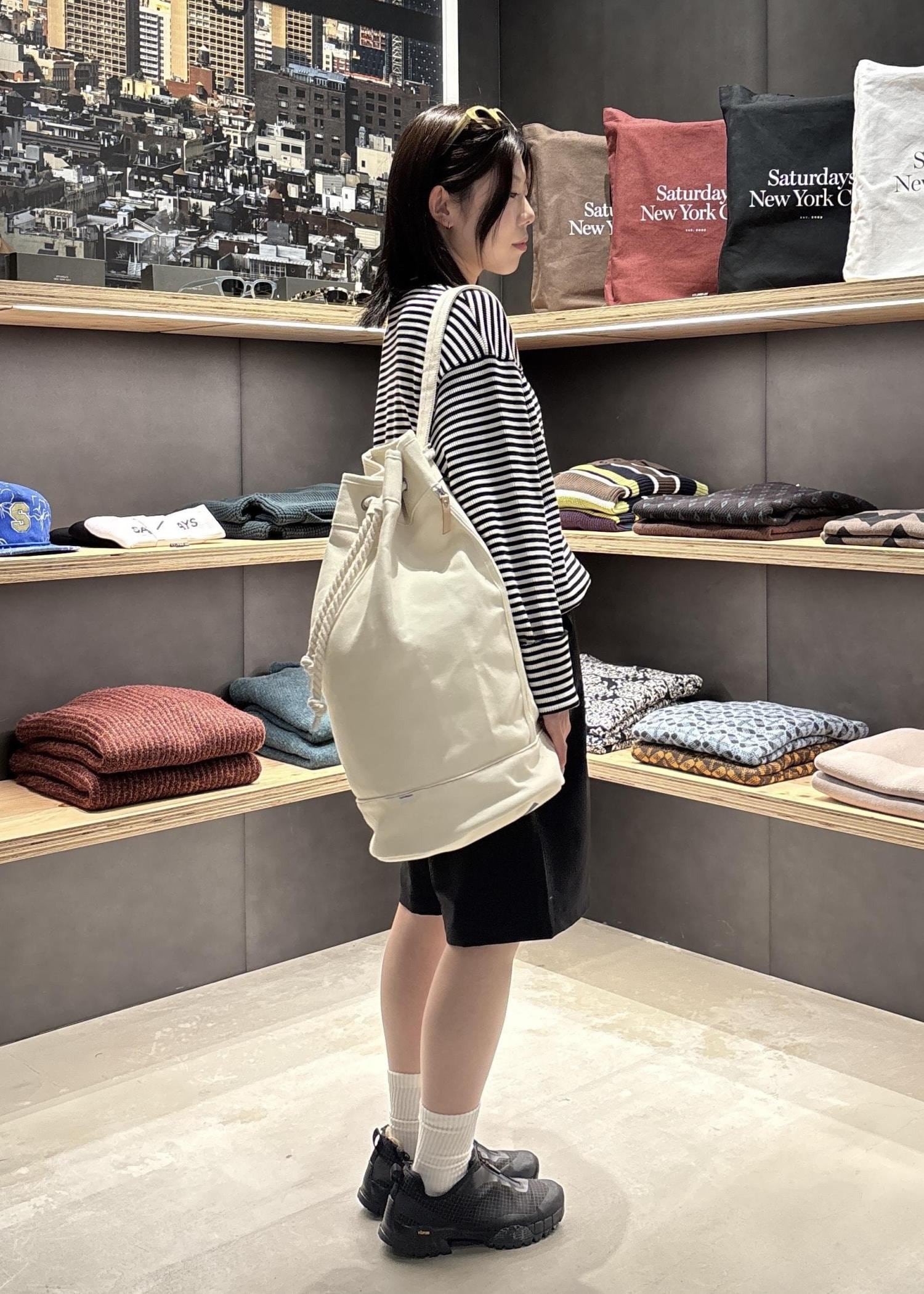 コーディネート映えするボンサック型のバッグです。底面にはSaturdays NYC定番ロゴをプリントデザインしています。