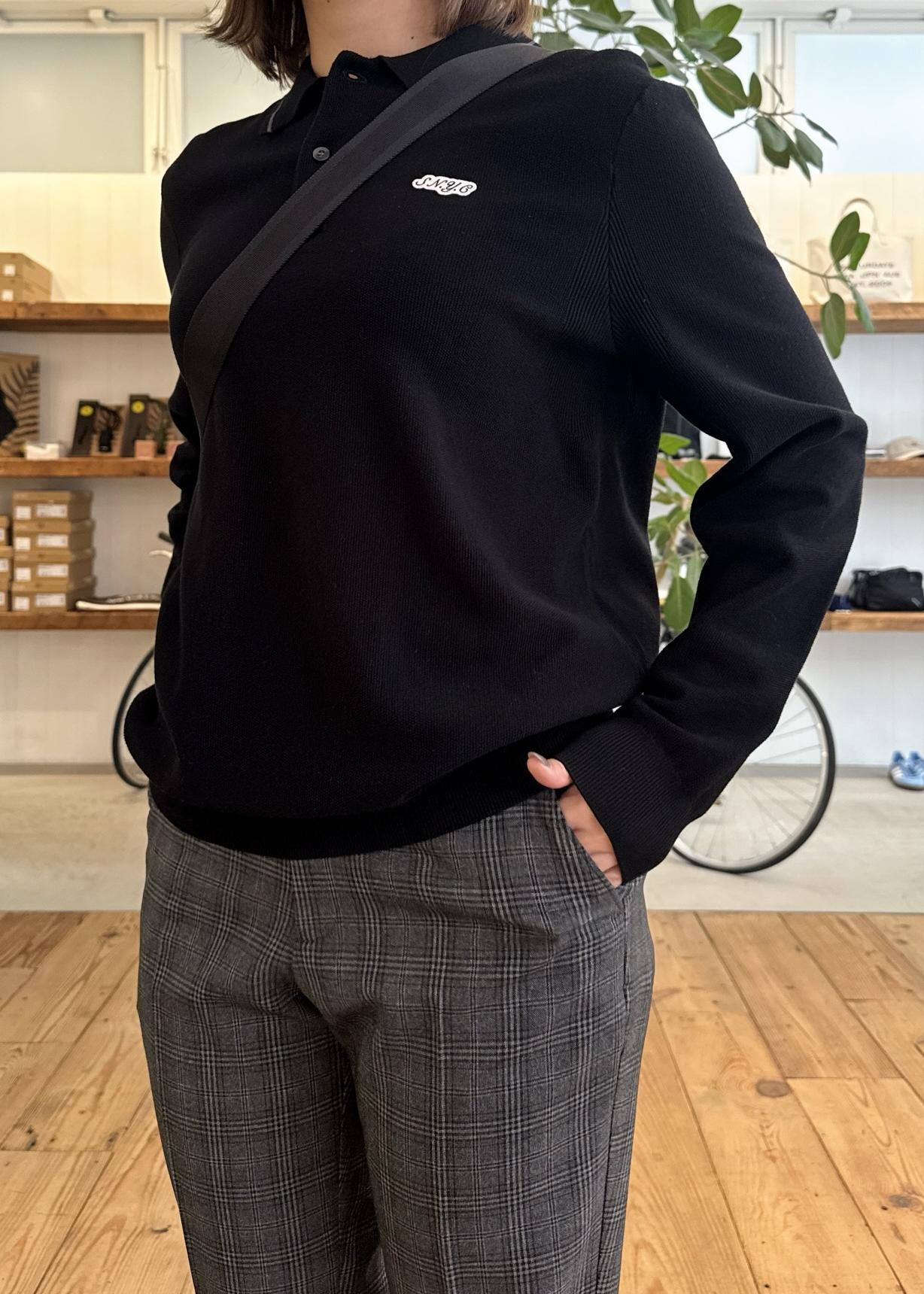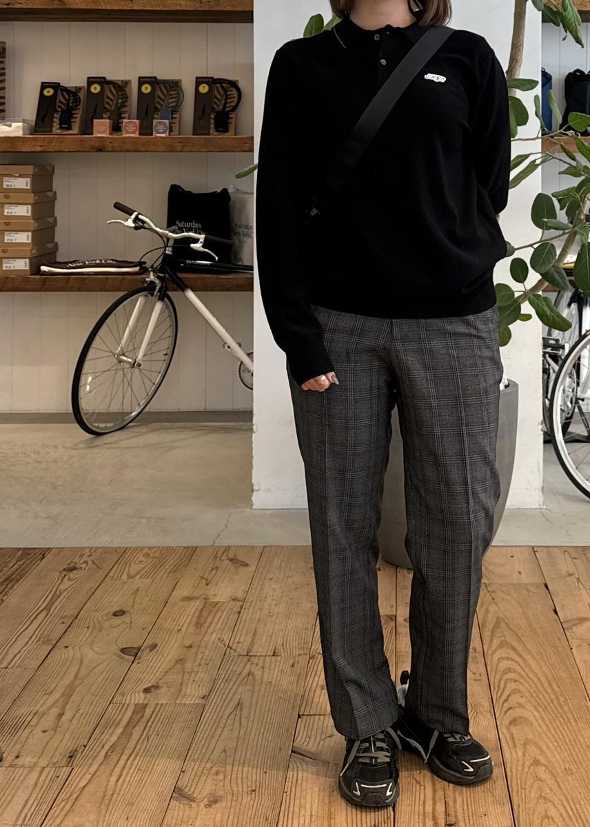 滑らかな肌触りと上品な光沢感が特徴のニットポロに、ストレッチ性に優れたパンツを合わせたスタイリングです。