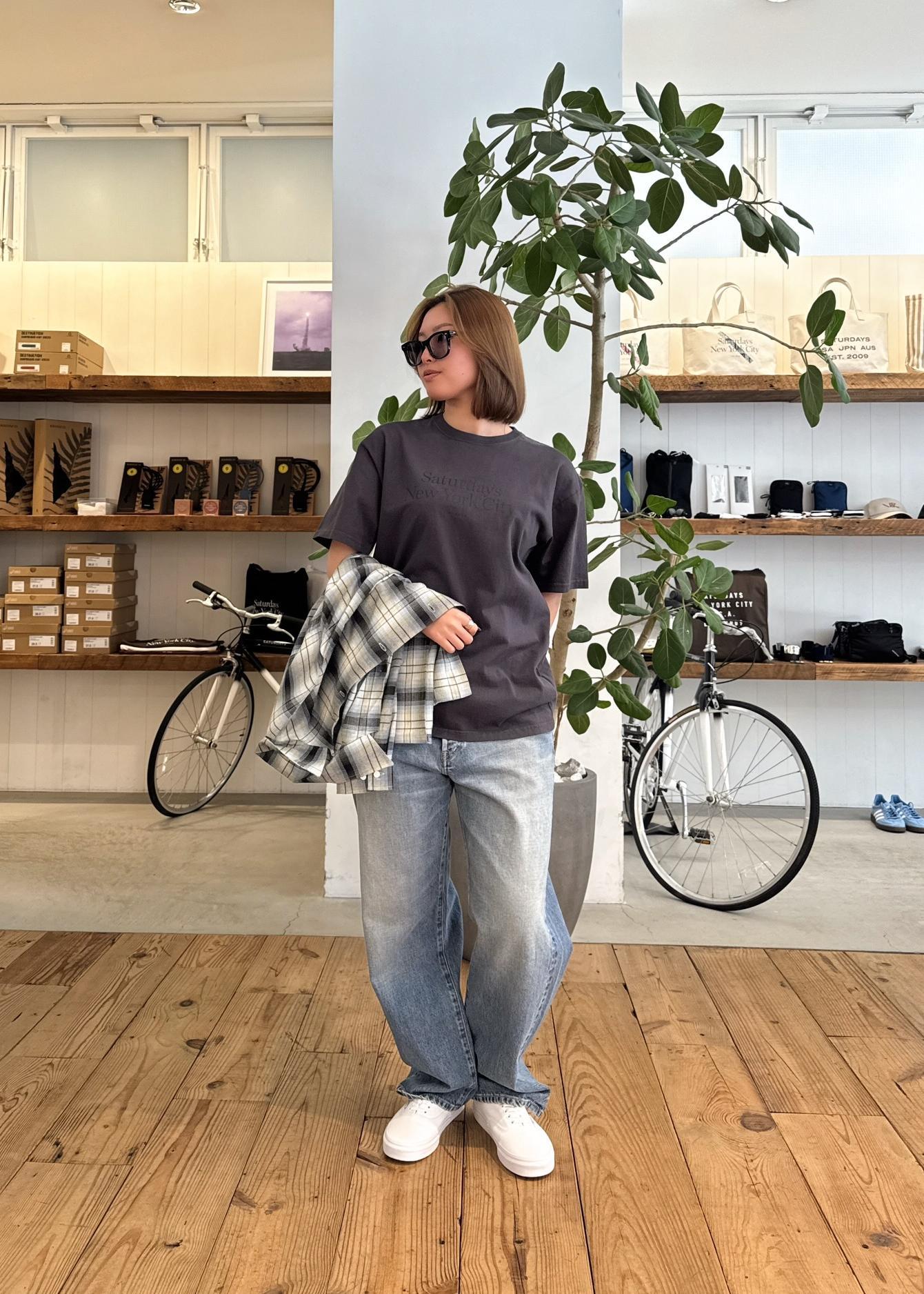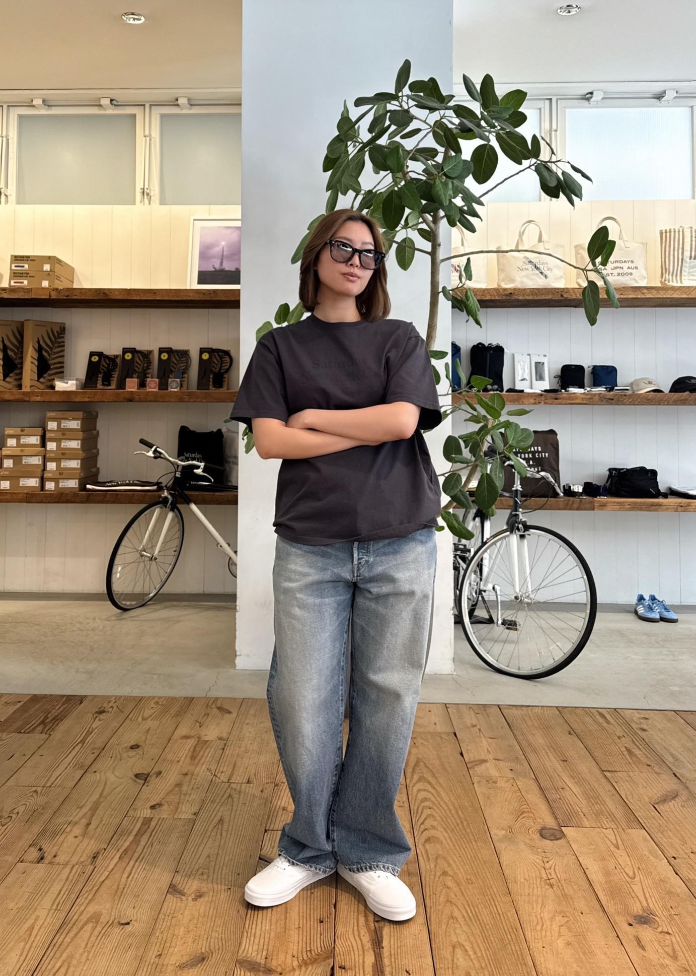 ヴィンテージ感のある風合いに仕上げたロゴTシャツに、岡山県産デニムを使用したワイドストレートパンツを合わせたリラックススタイル!