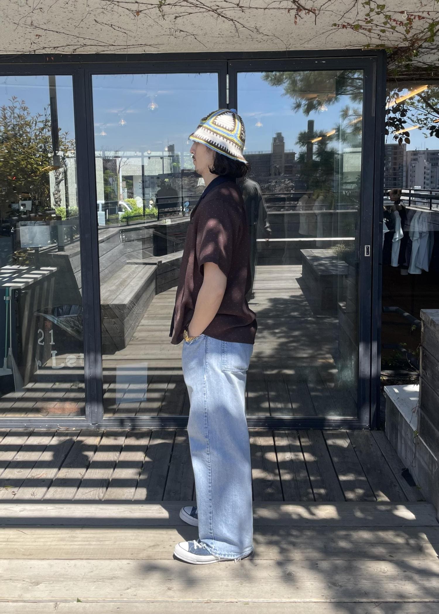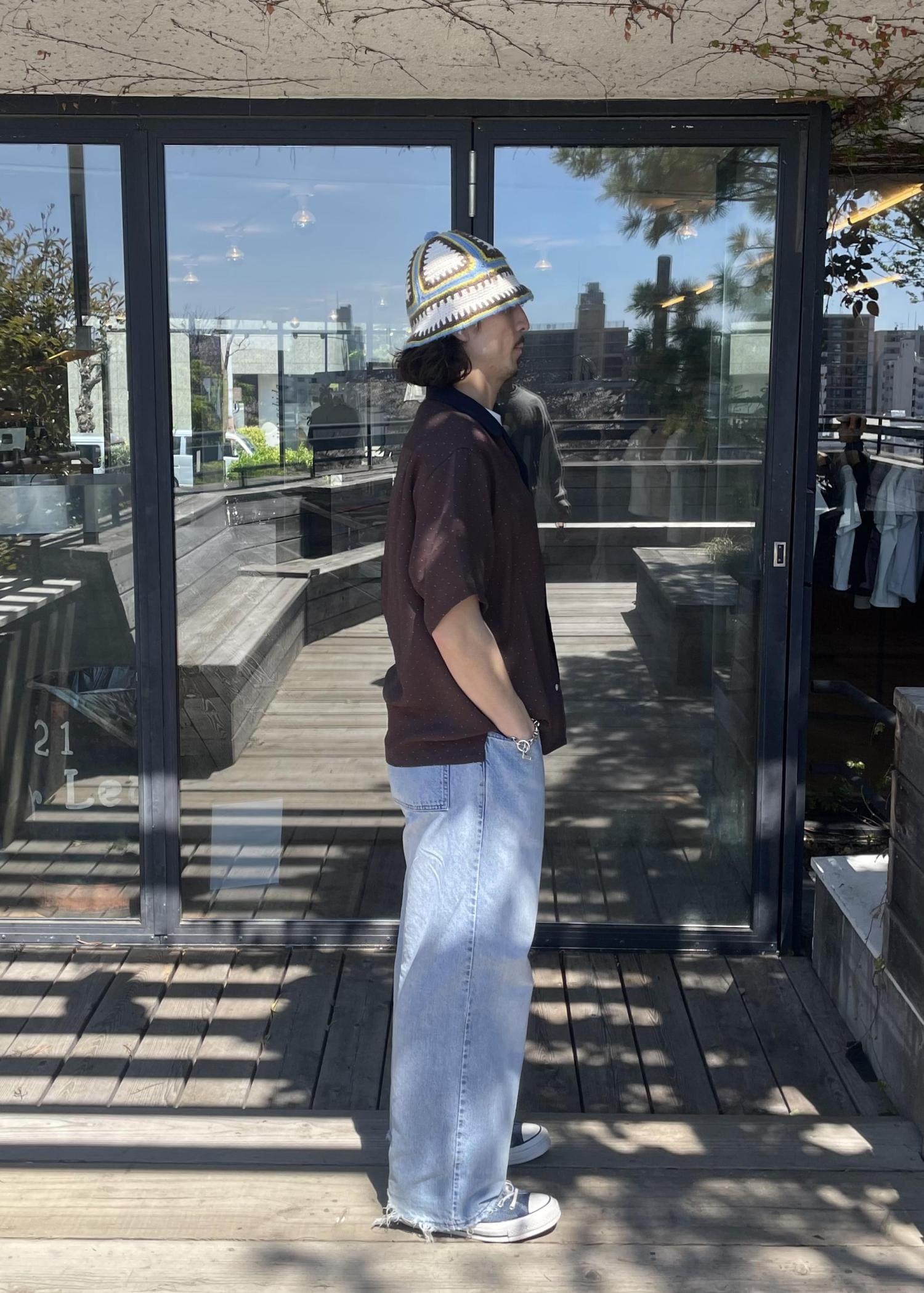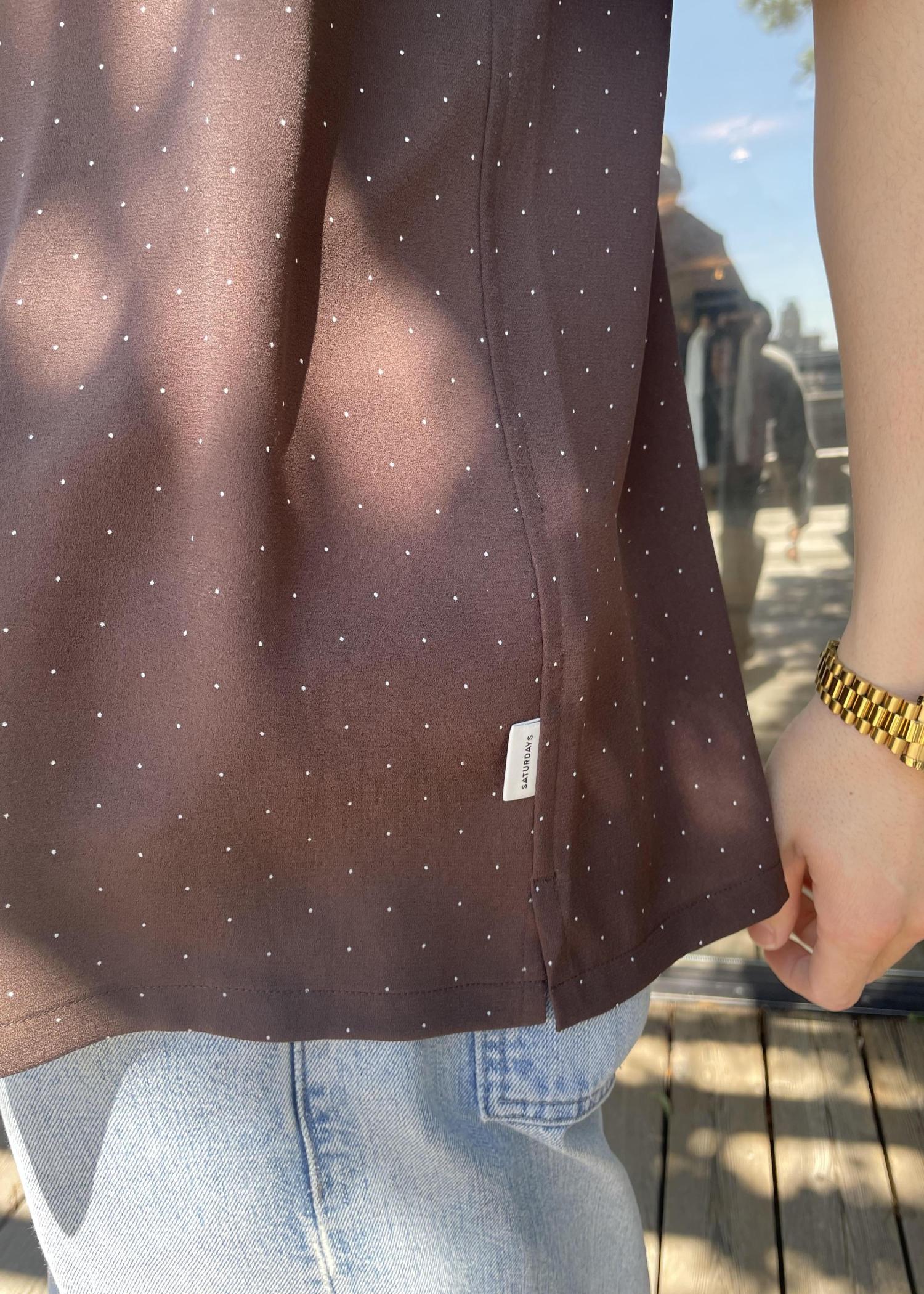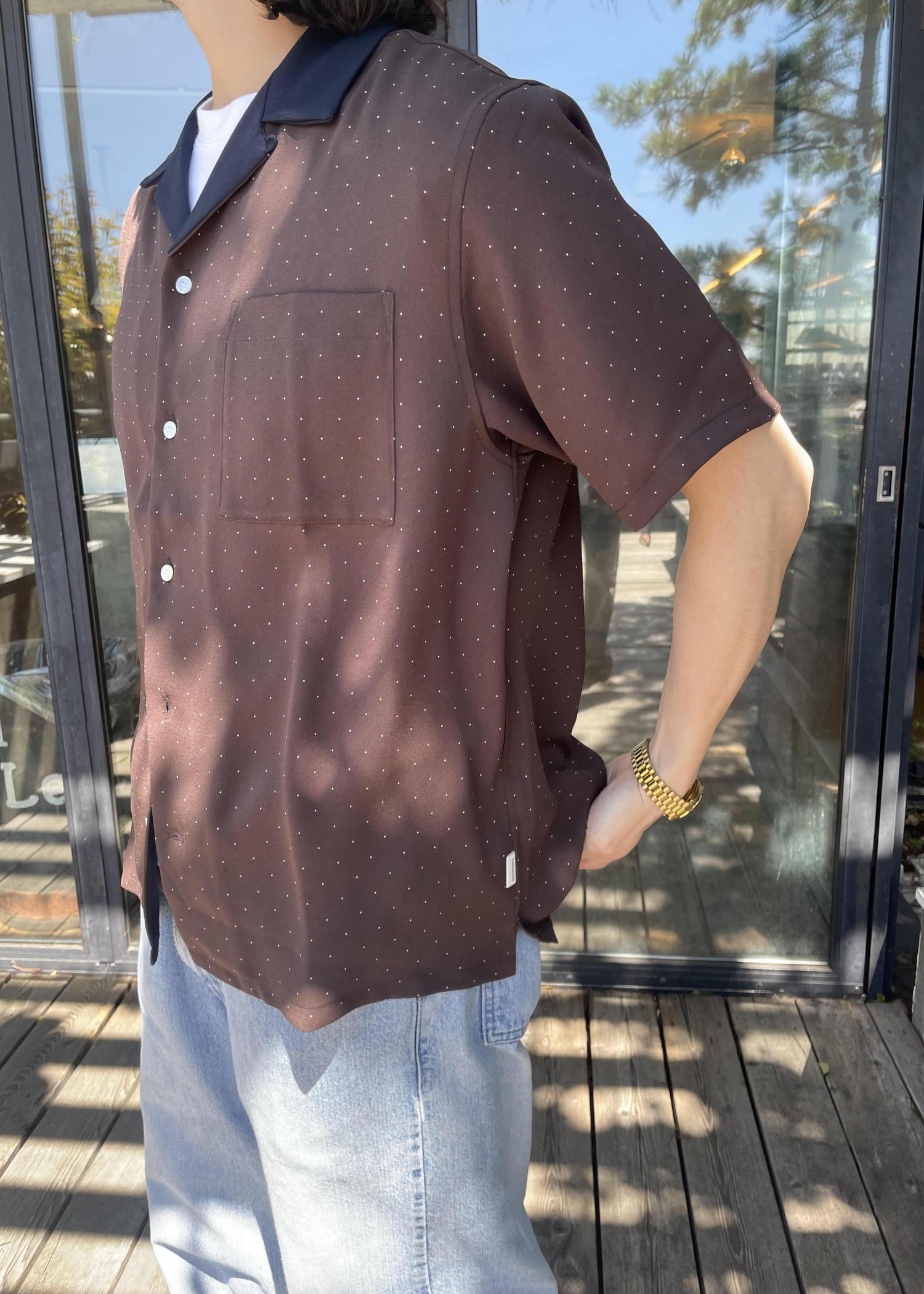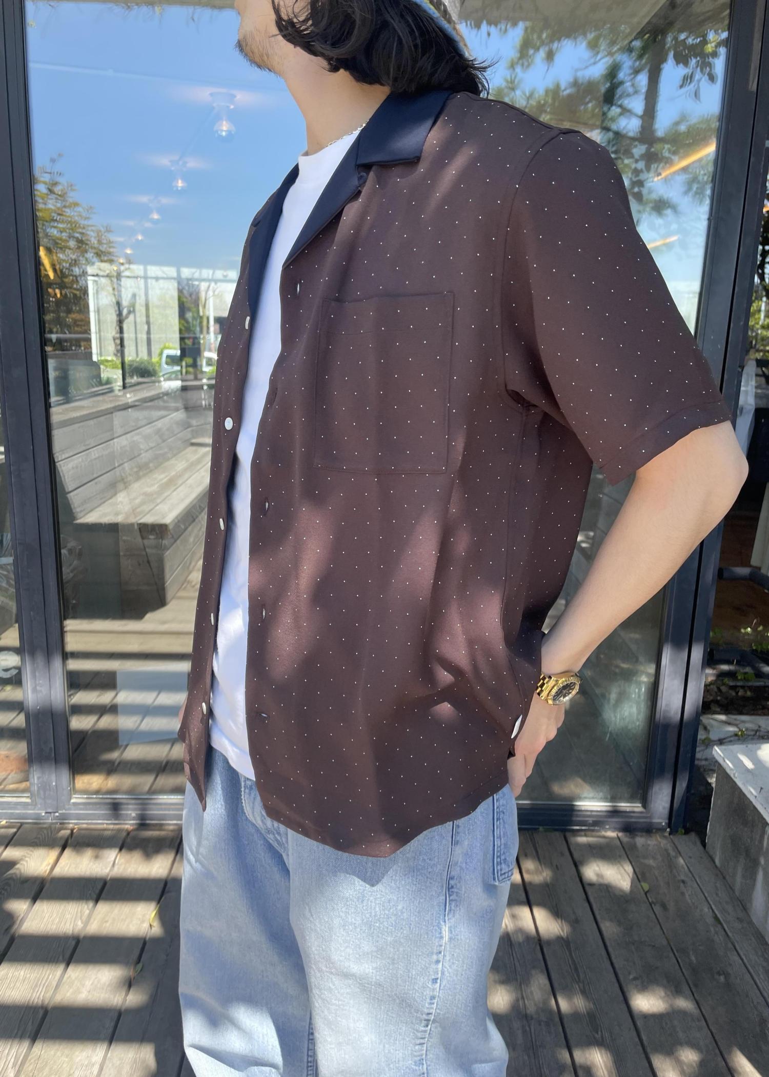 トップスは、新作の開襟半袖シャツです! ドット柄と襟が色が違うのが特徴のアイテムです! スタイリングのアクセントになる一品です!