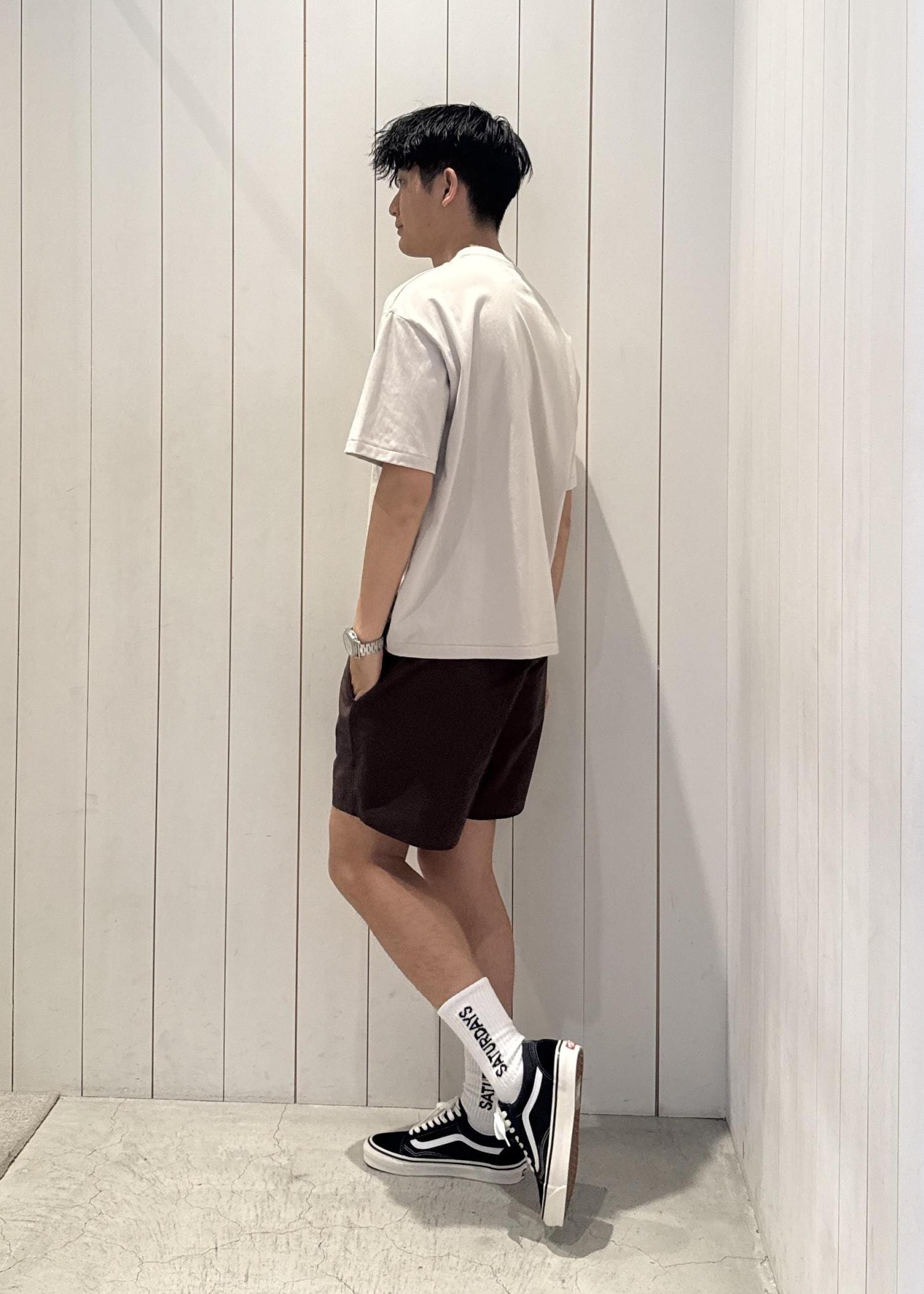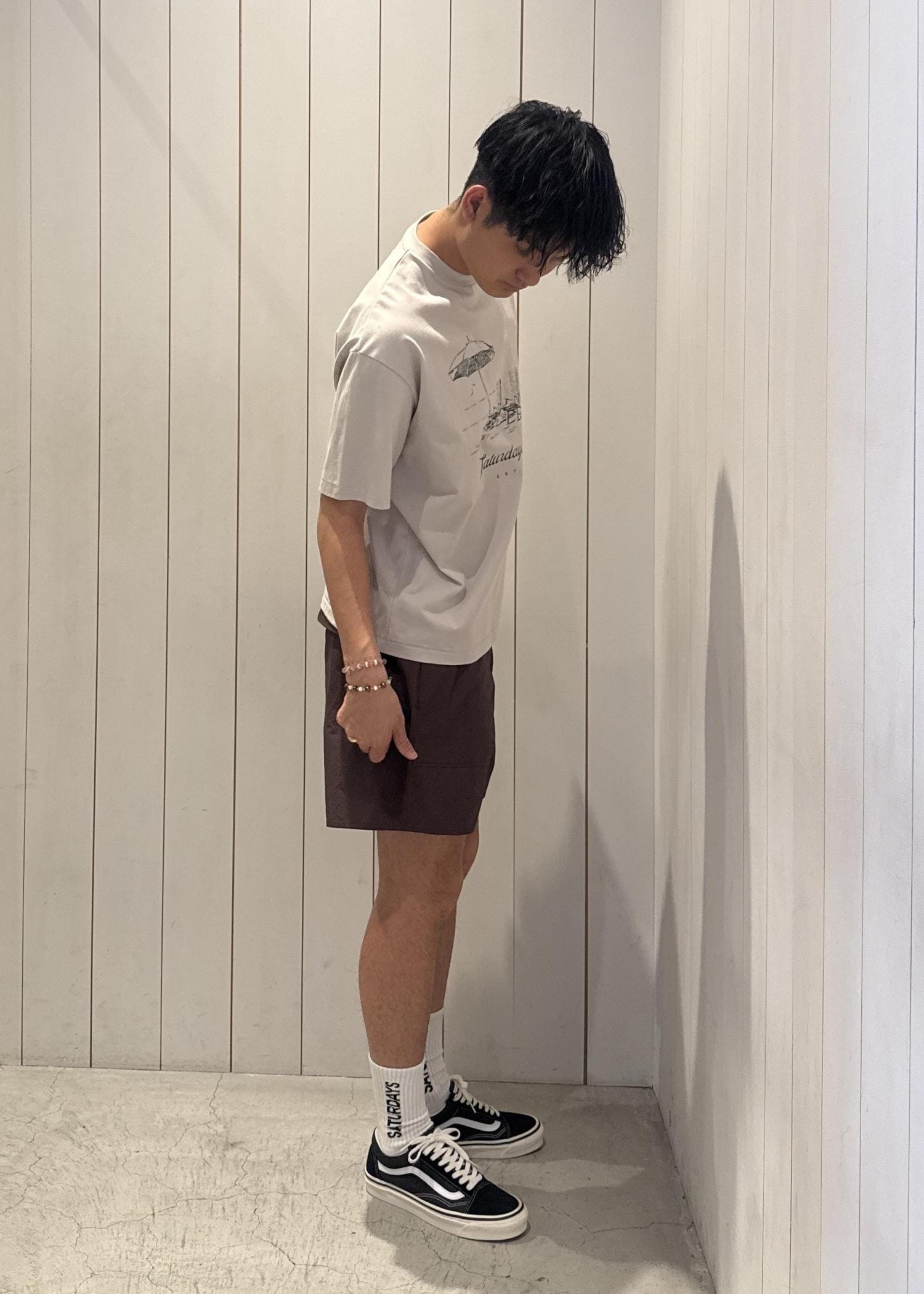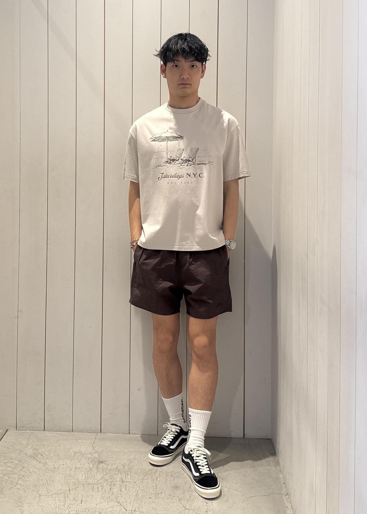 今回ご紹介させていただくのは、リゾート感のあるグラフィックが特徴のコットン100%素材でオゾンウォッシュ加工を施したフェード感が特徴的なビンテージライクなティシャツとややリラックスしたフィットで作られたSaturdays NYC定番のスイムショーツとのコーデです!