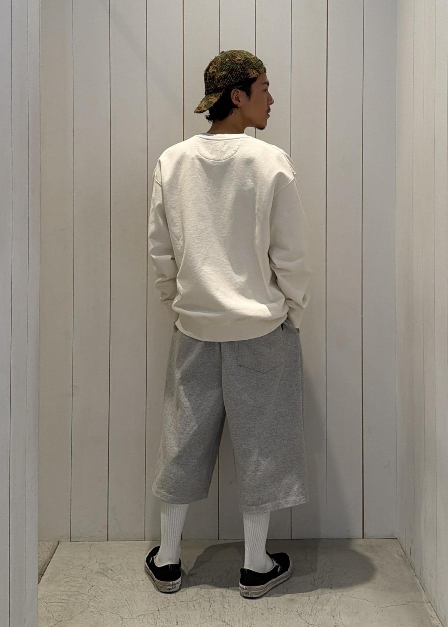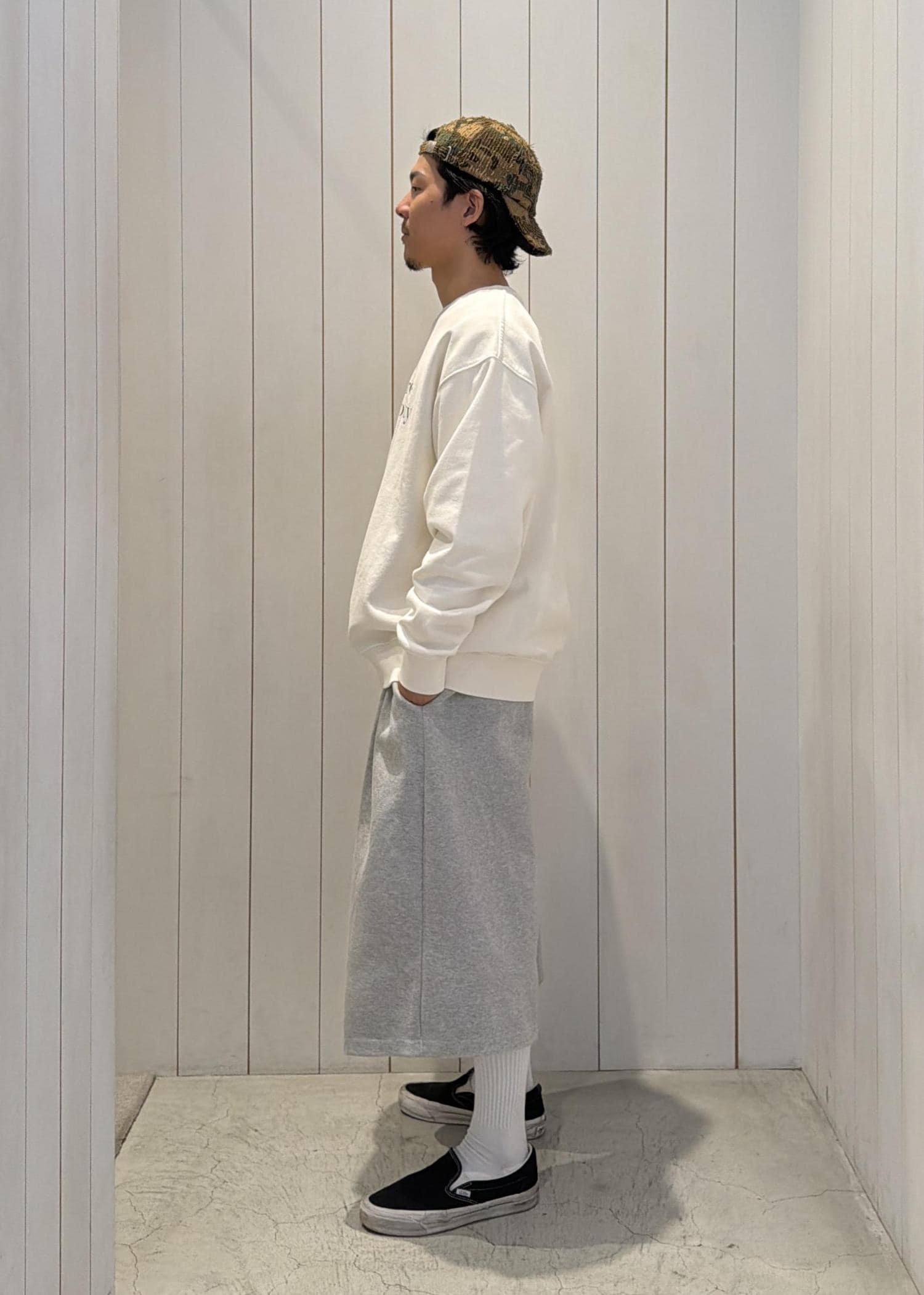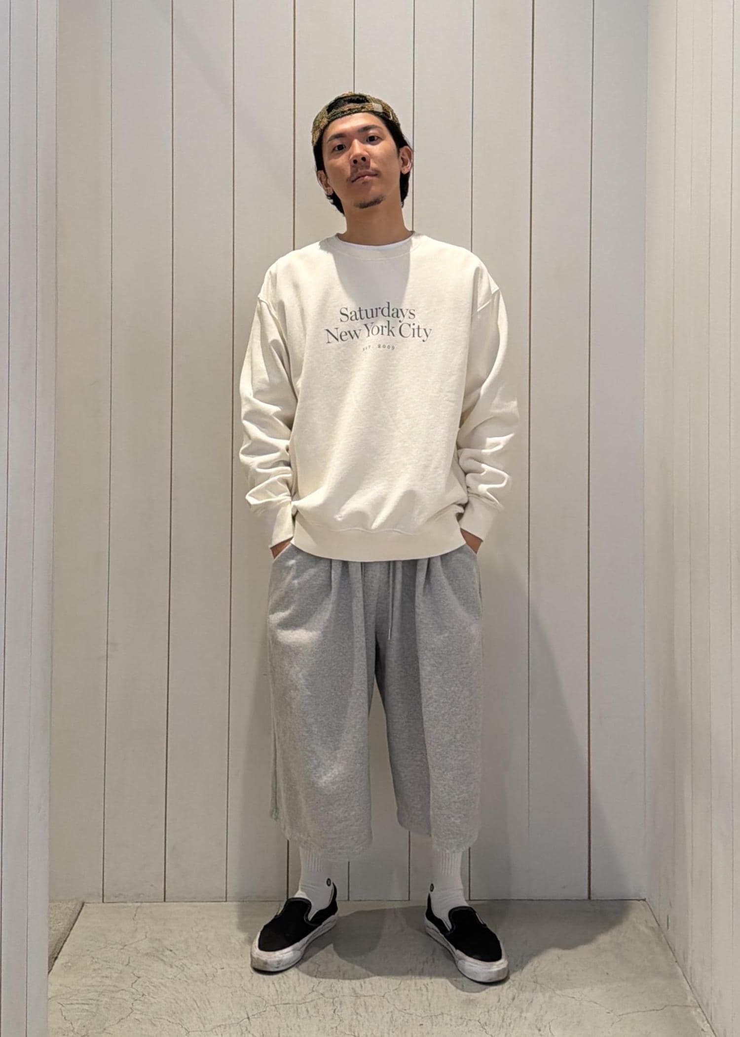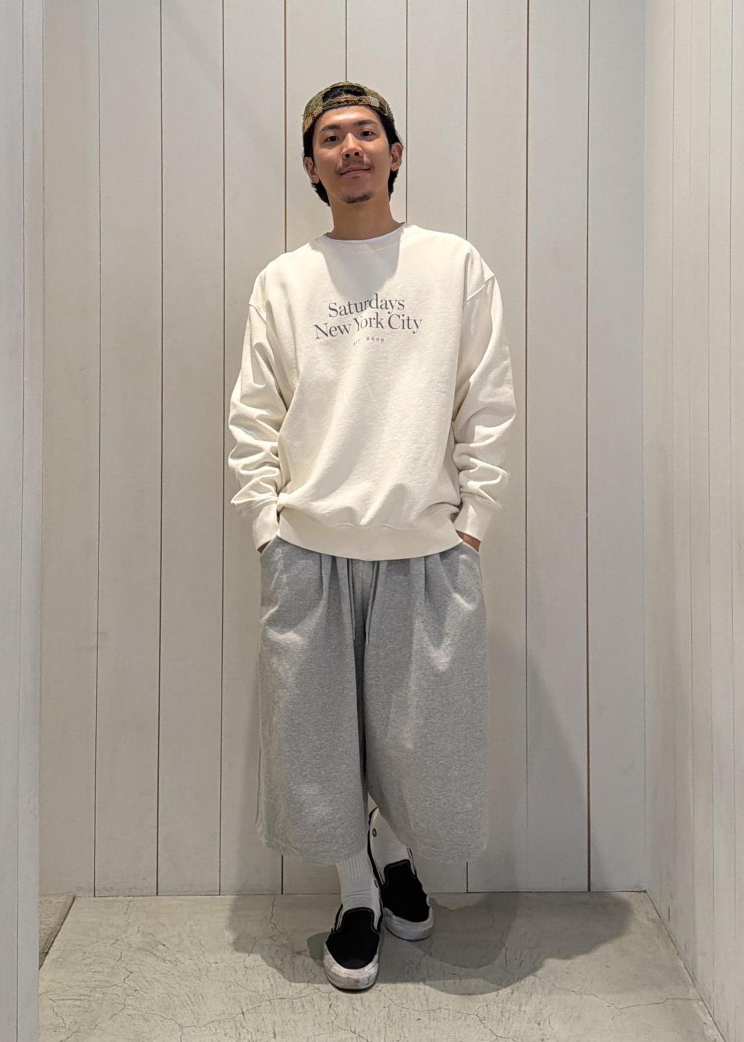フロントのロゴがアクセントになるスウェットに、グレーのパンツを合わせて柔らかいトーンでまとめました。