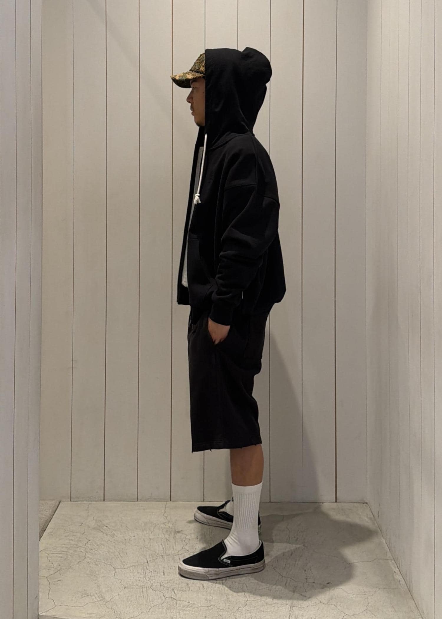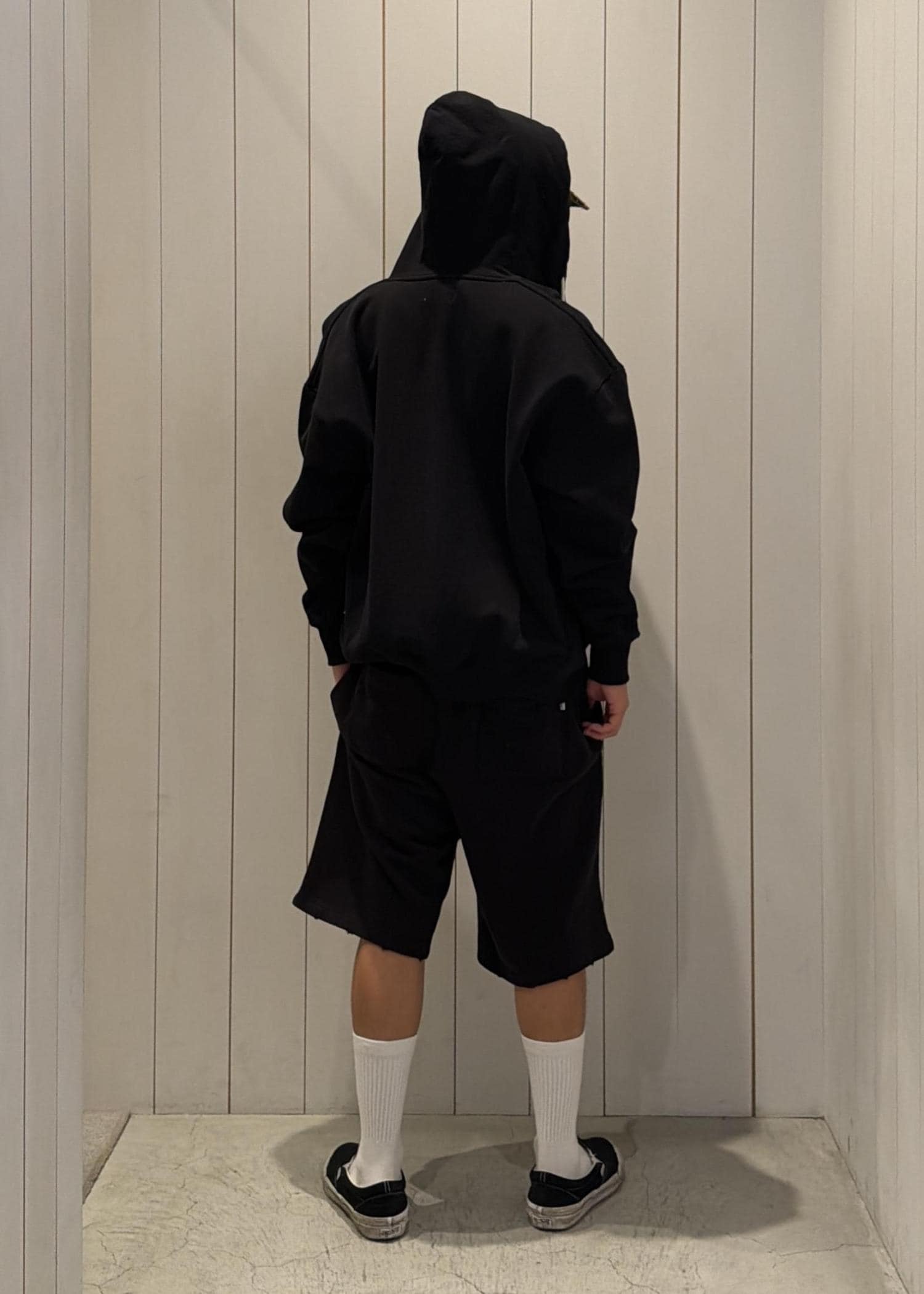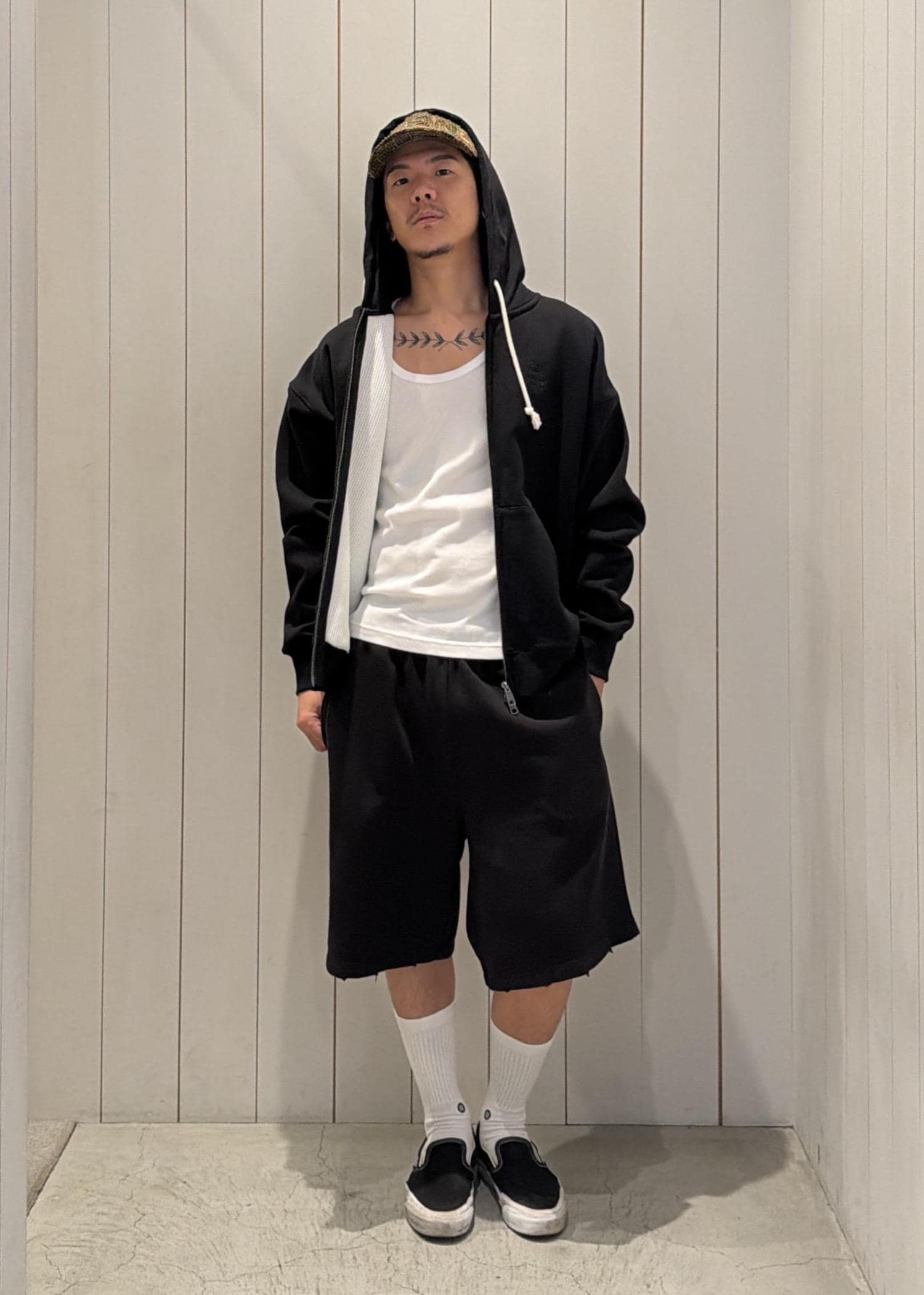 フーディーとショーツの組み合わせでラフな印象にしつつ、全体をワントーンで統一することで落ち着いた雰囲気に仕上げました!