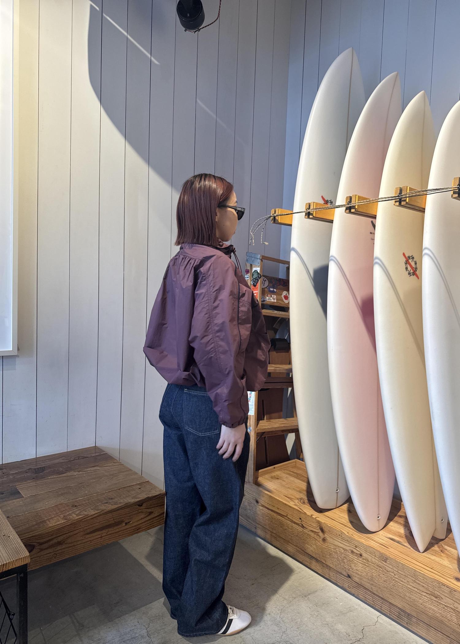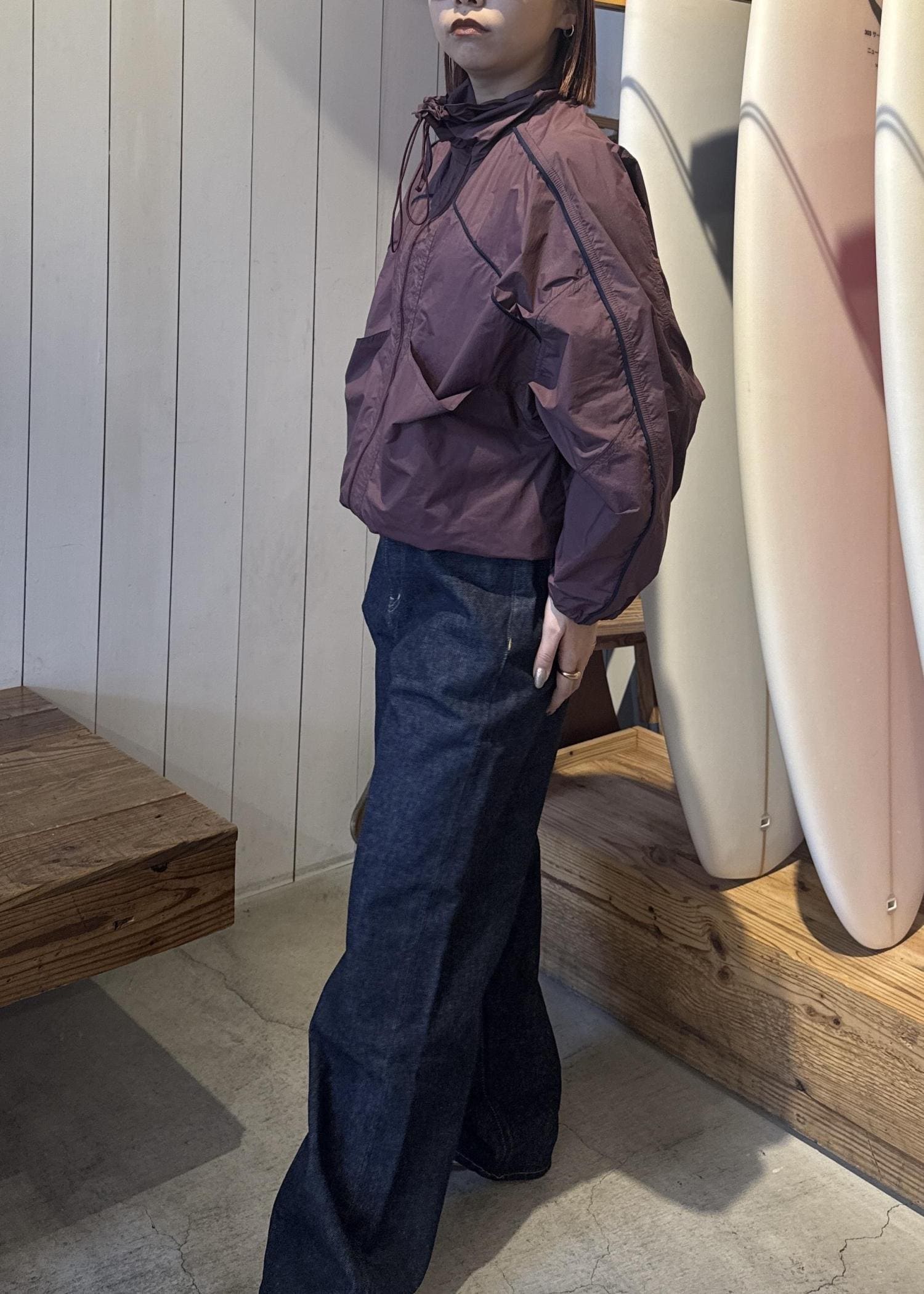 機能性のあるナイロンジャケットを中心に、リラックス感のあるワイドデニムでバランスを。軽く羽織れて持ち運びしやすく、気温差にも対応。外に出たくなる実用的なスタイリング