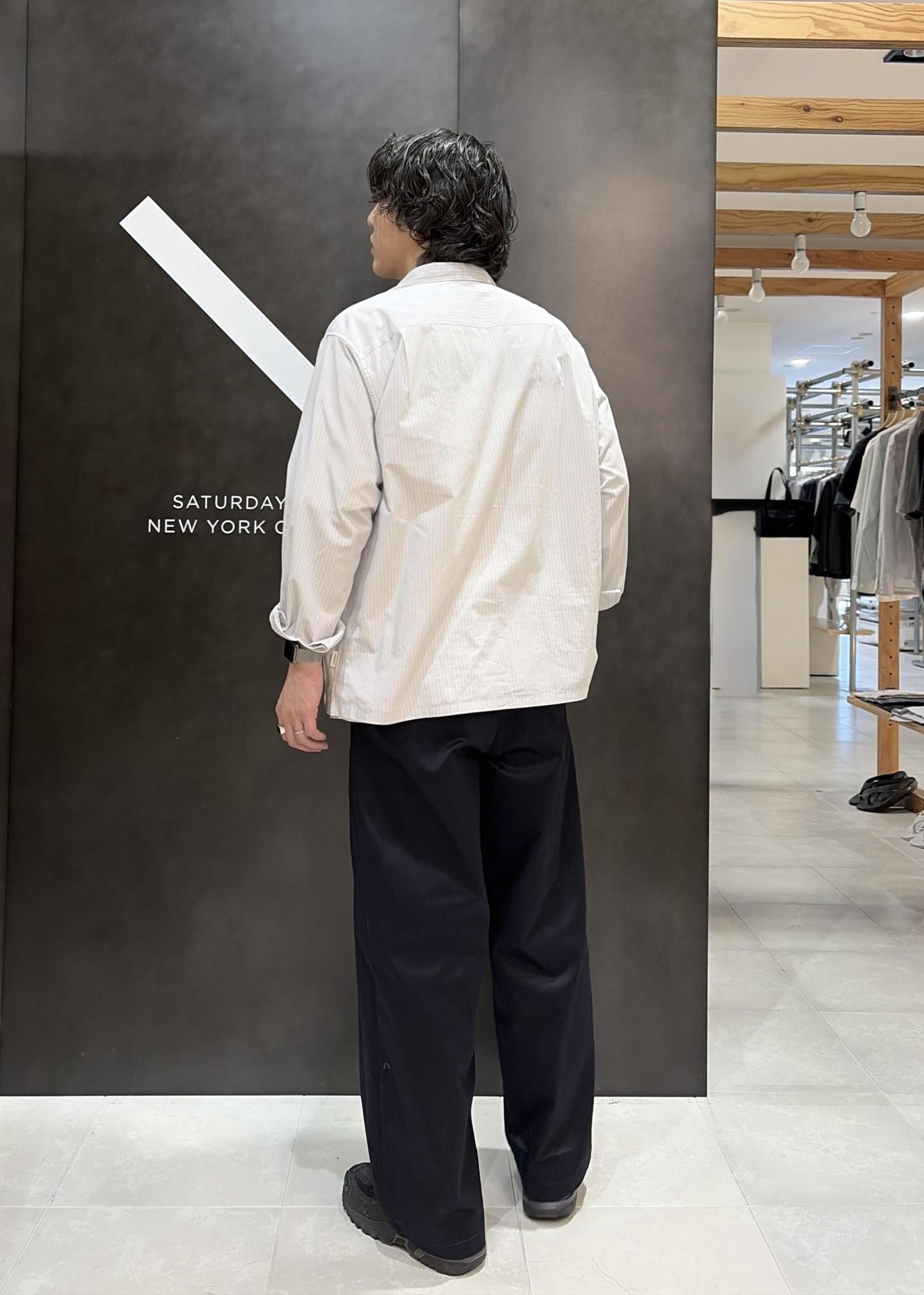 ドライタッチで羽織り心地がよく、ストライプの配色も落ち着いた印象になっているので汎用性が高く、日々のスタイリングに取り入れていただきやすいアイテムです。