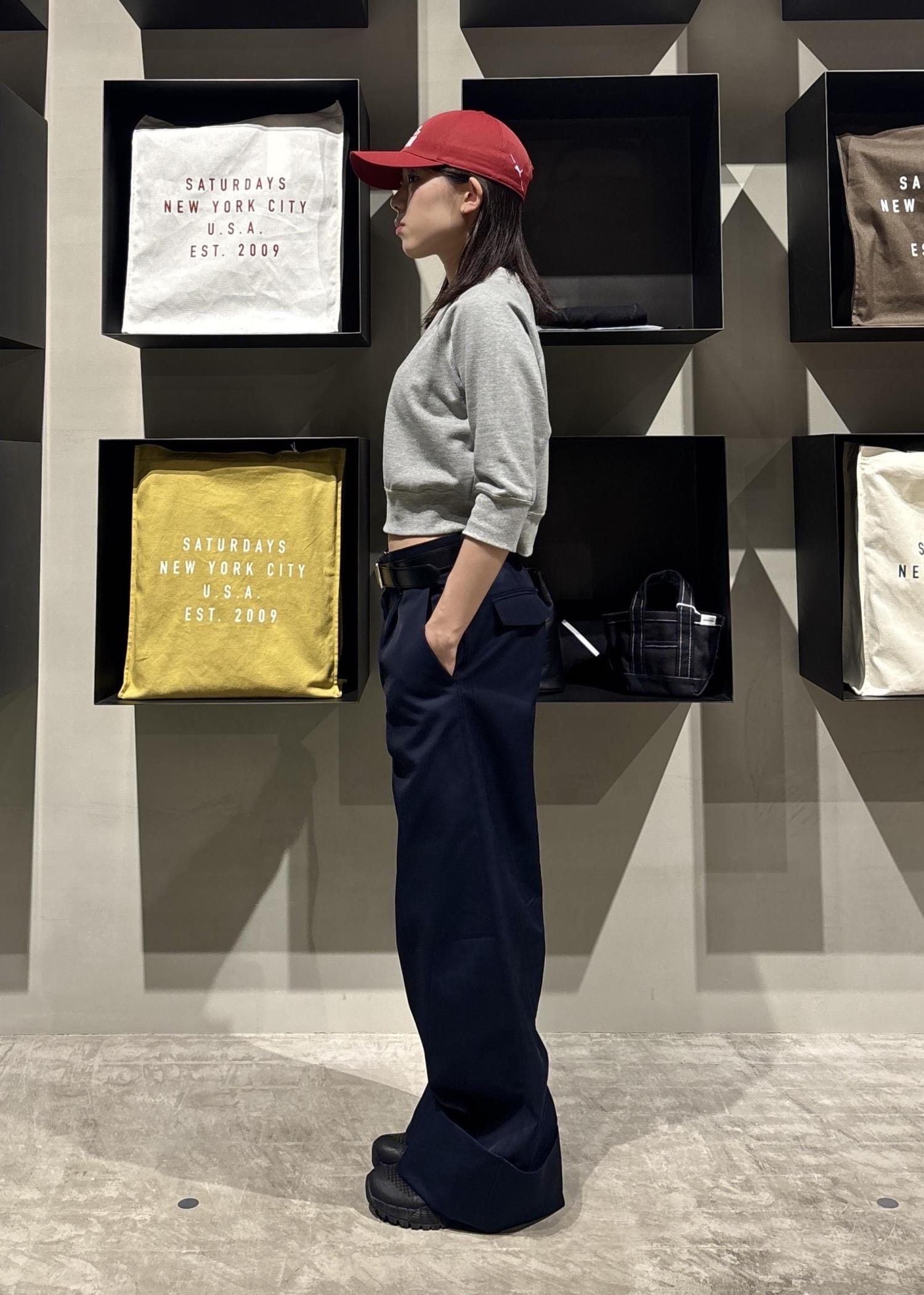 6部丈のスウェットと組み合わせることで抜け感が出るので重たくなり過ぎず綺麗な印象に◎