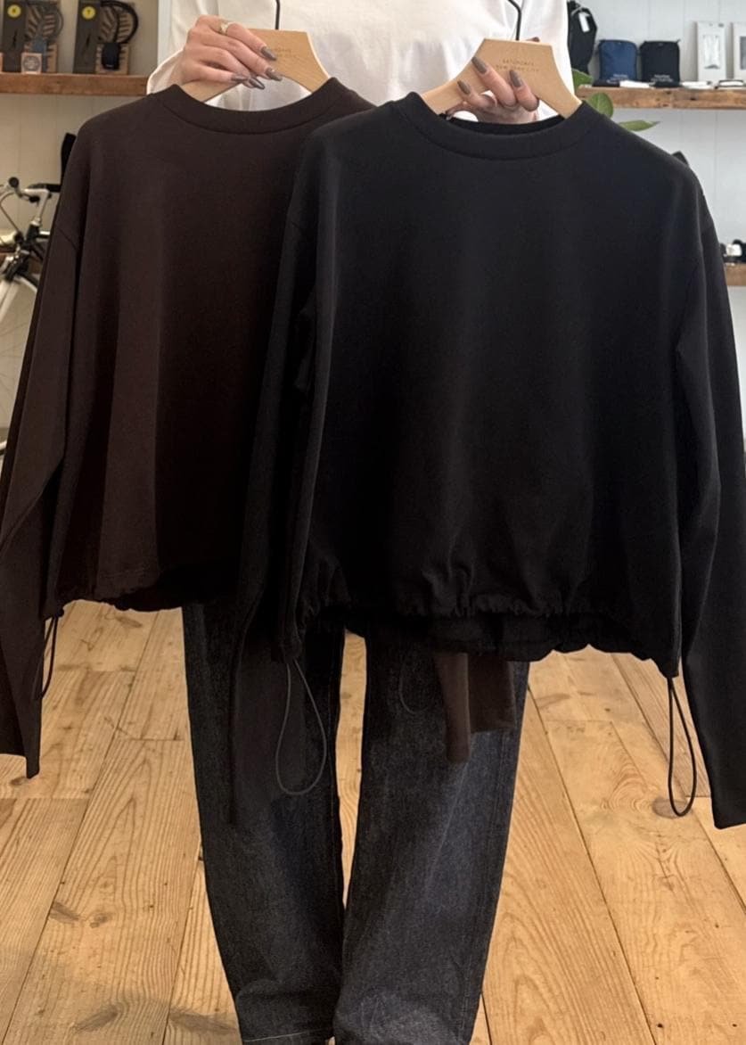 トップスはドローコードでシルエットを変えられ、ゆるっと着ても、絞って立体感のあるバルーンシルエットでも楽しめる一枚。