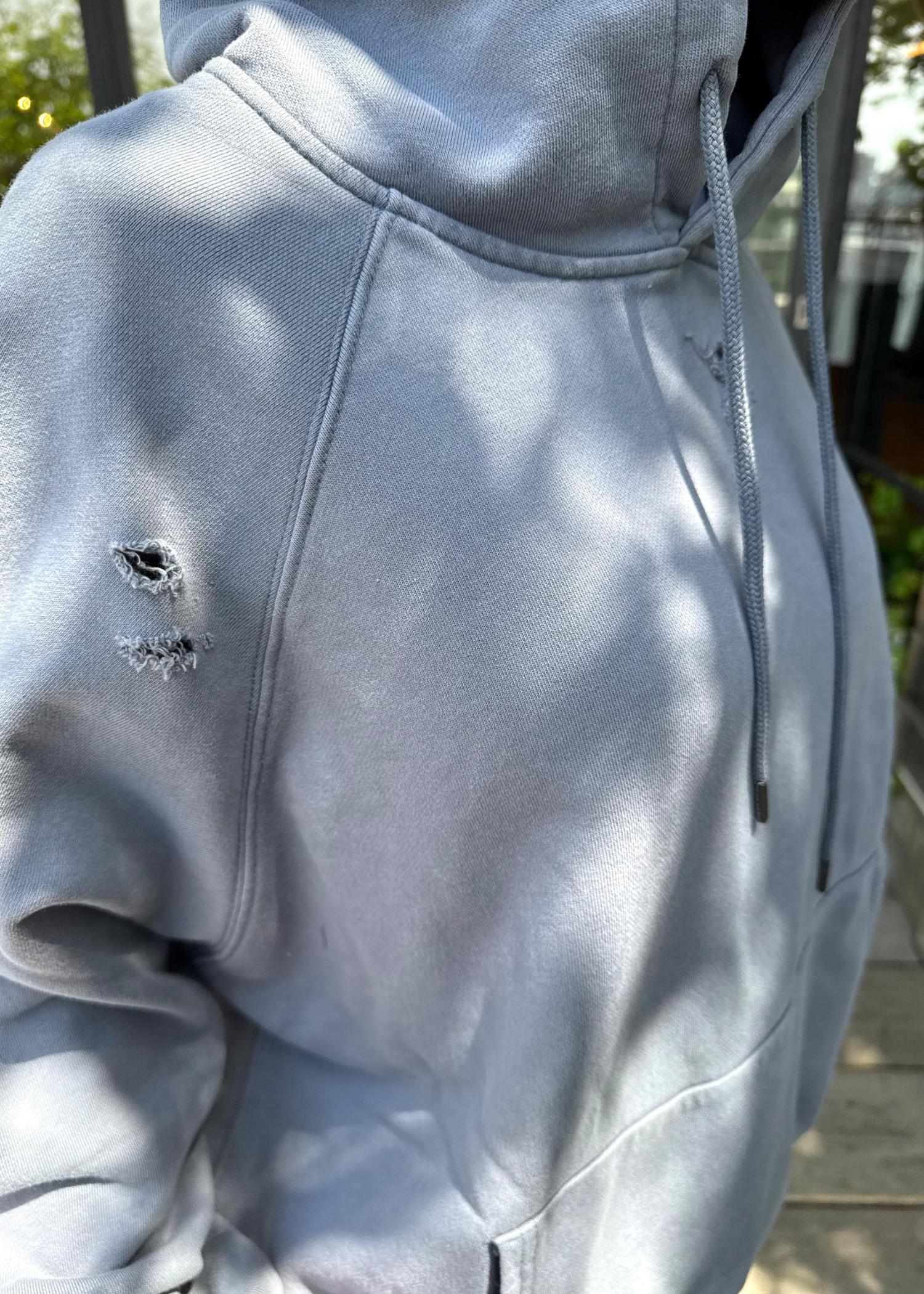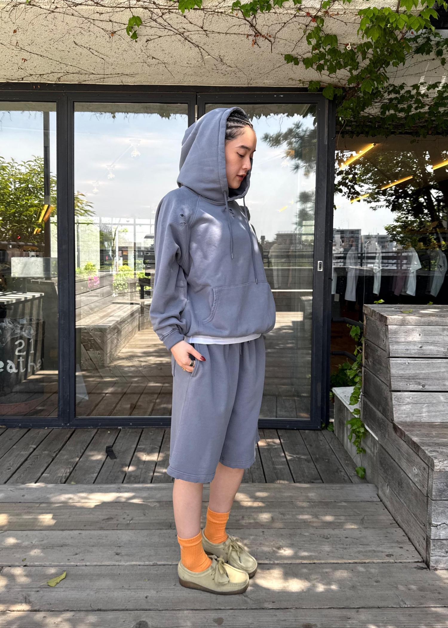 ビンテージライクなスウェットパーカーとスウェットパンツはダメージ加工がポイント!